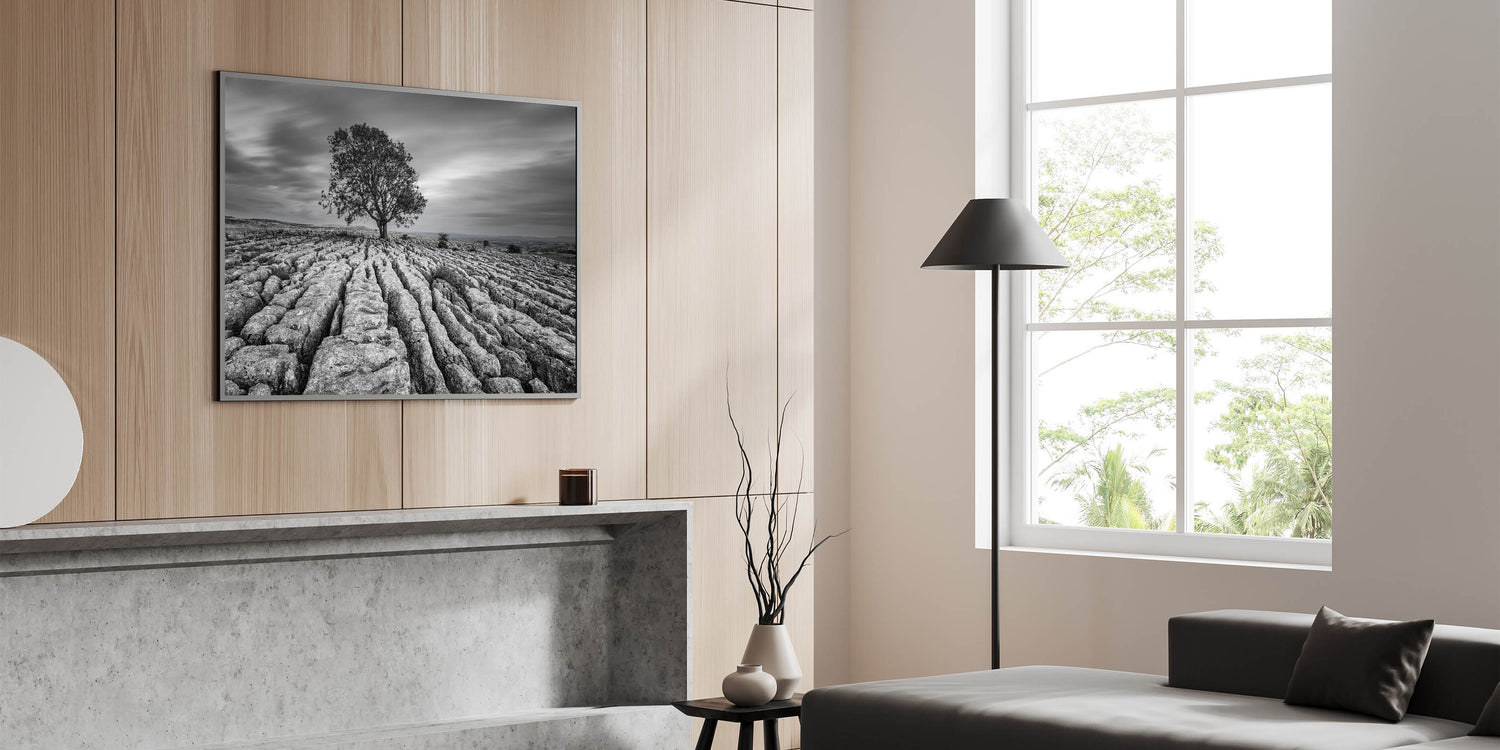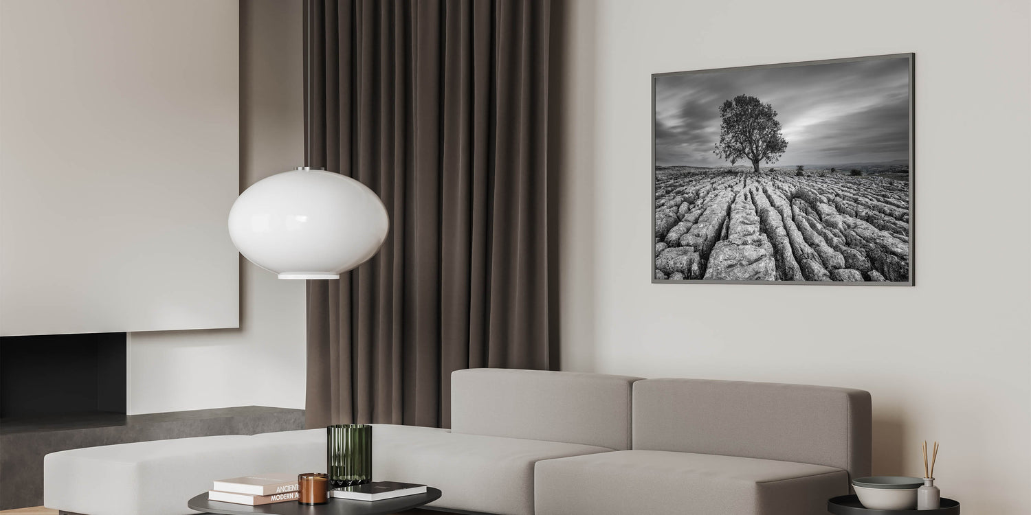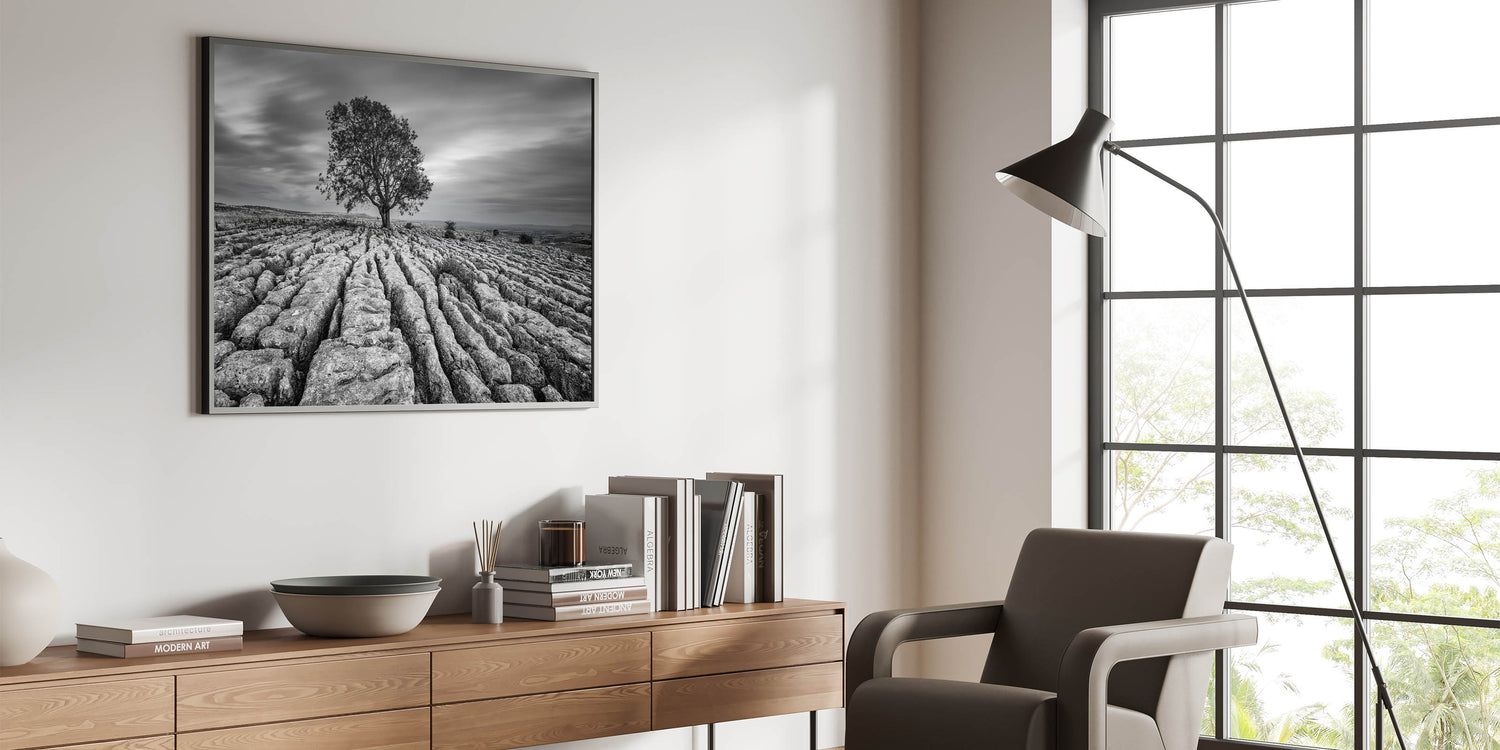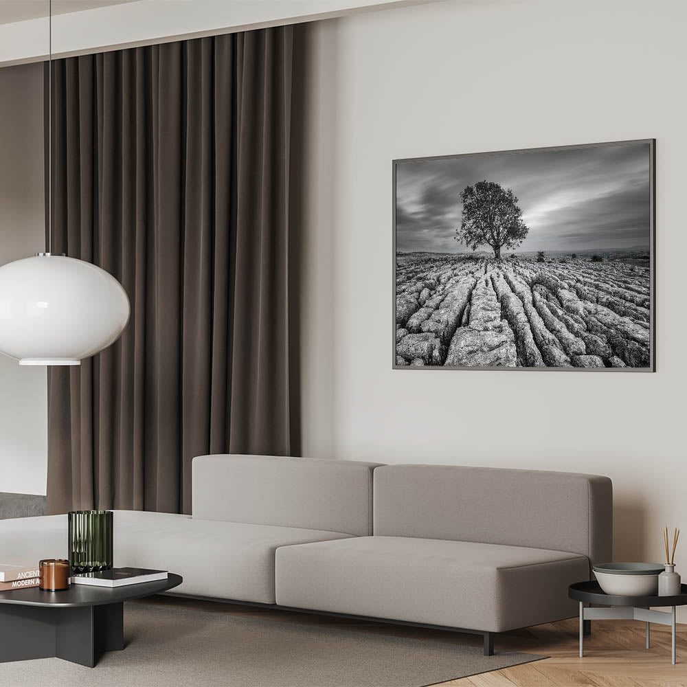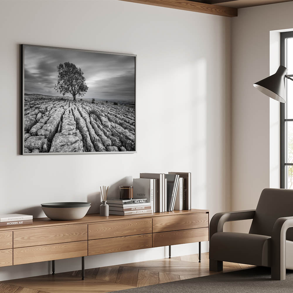 Experience the stark beauty of nature with this striking black and white countryside landscape. The solitary tree standing against a dramatic sky and rugged terrain evokes a sense of solitude and resilience, making this piece a powerful statement in any room. The monochromatic tones emphasize the texture and depth of the landscape, offering a timeless aesthetic that complements modern and minimalist interiors.