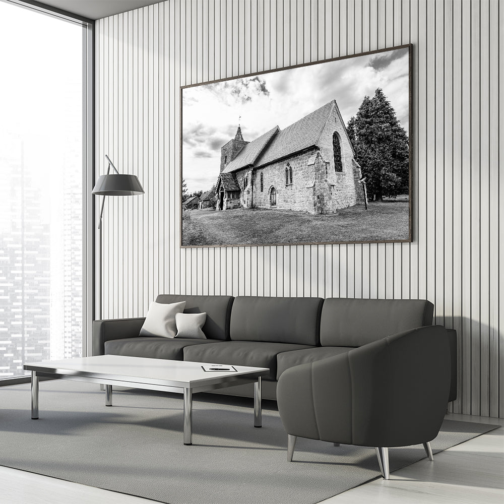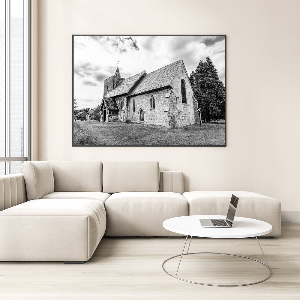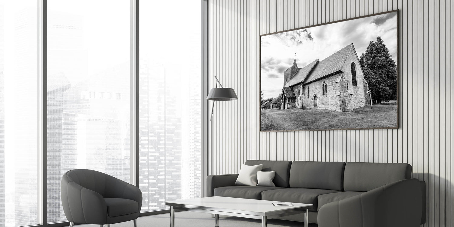 Elevate your space with the timeless elegance of this black and white wall art, featuring a historic stone church. This monochromatic artwork beautifully captures the intricate details of the church's architecture, from the stone masonry to the towering steeple. The striking contrast between the dark roof and the light stone exterior creates a dramatic visual effect, making it a perfect piece for those who appreciate classic design and historical architecture.