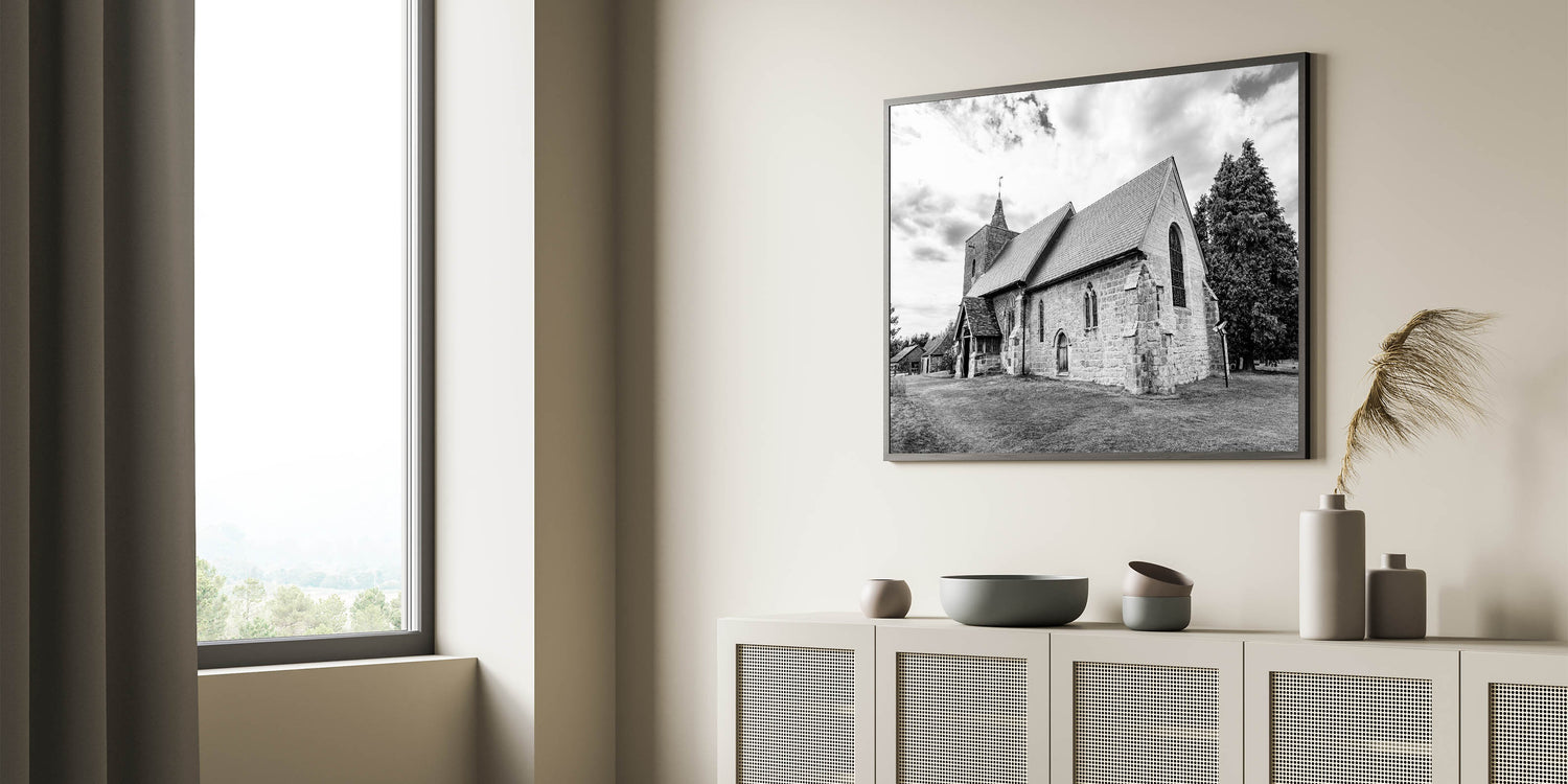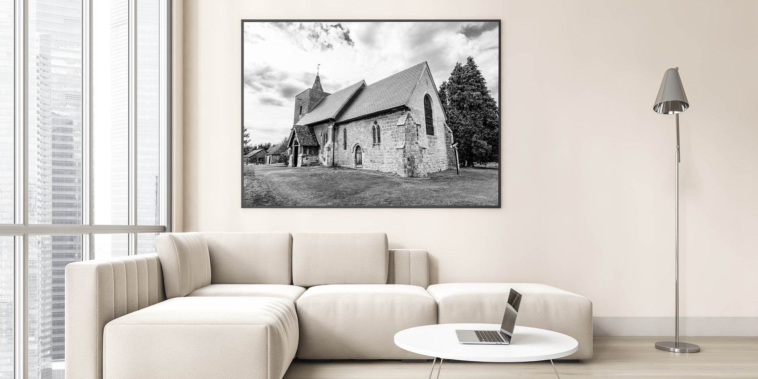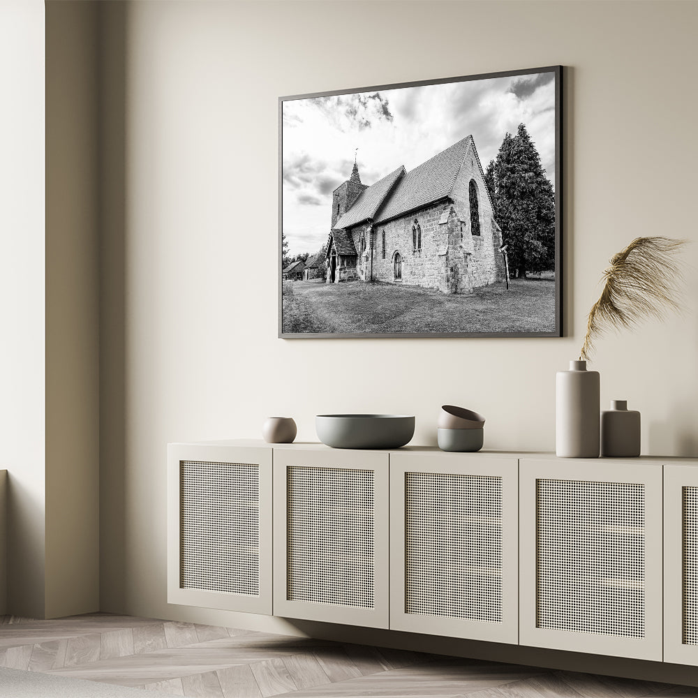 Elevate your space with the timeless elegance of this black and white wall art, featuring a historic stone church. This monochromatic artwork beautifully captures the intricate details of the church's architecture, from the stone masonry to the towering steeple. The striking contrast between the dark roof and the light stone exterior creates a dramatic visual effect, making it a perfect piece for those who appreciate classic design and historical architecture.