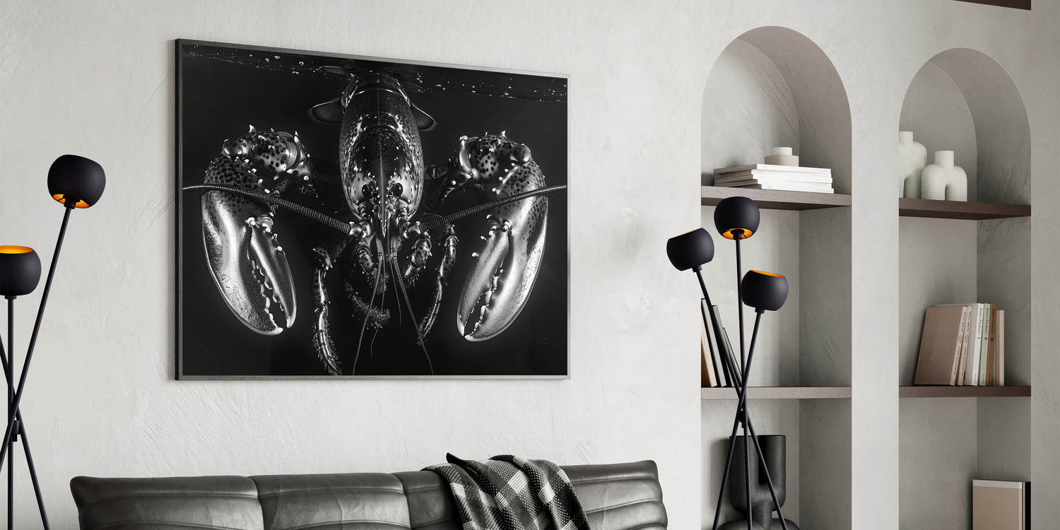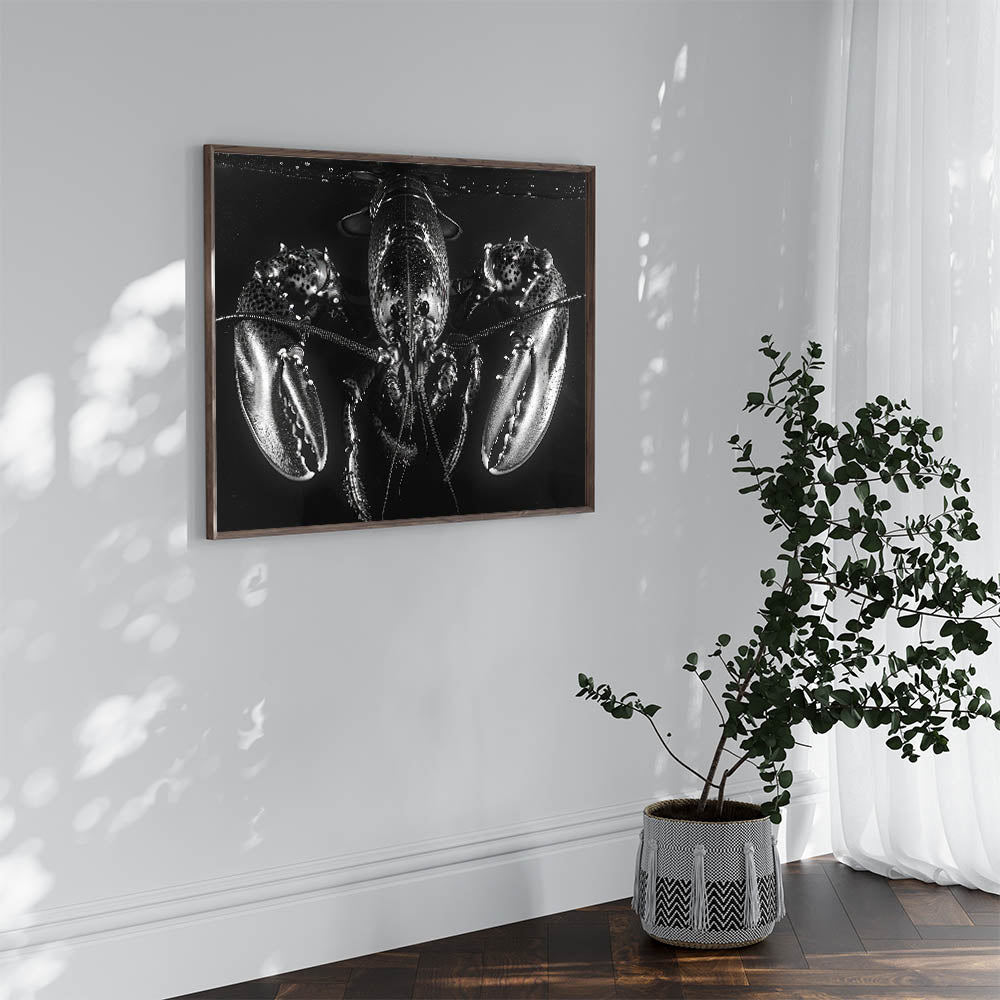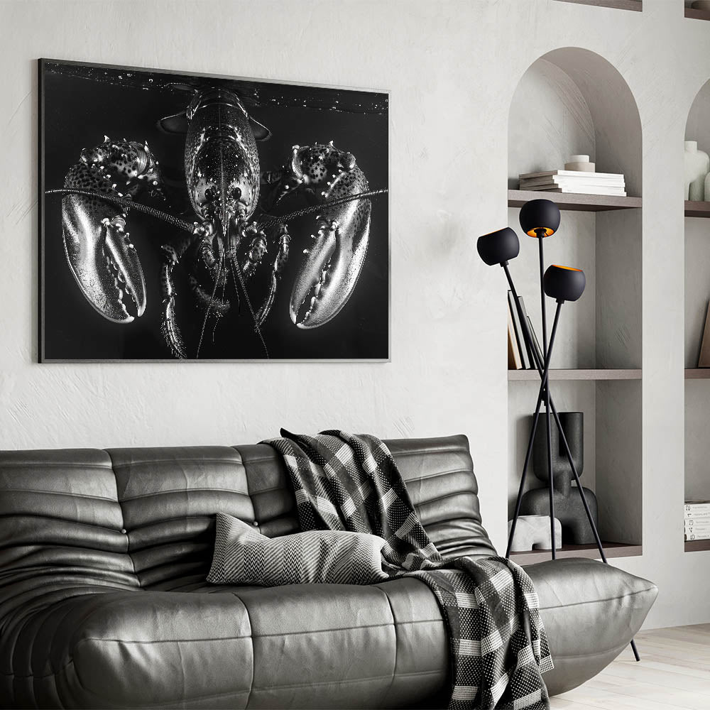 Elevate your interior with this striking black and white lobster wall art. Perfect for modern and minimalist spaces, this artwork captures the dramatic contrast and intricate details of a lobster, making it a stunning focal point in any room.