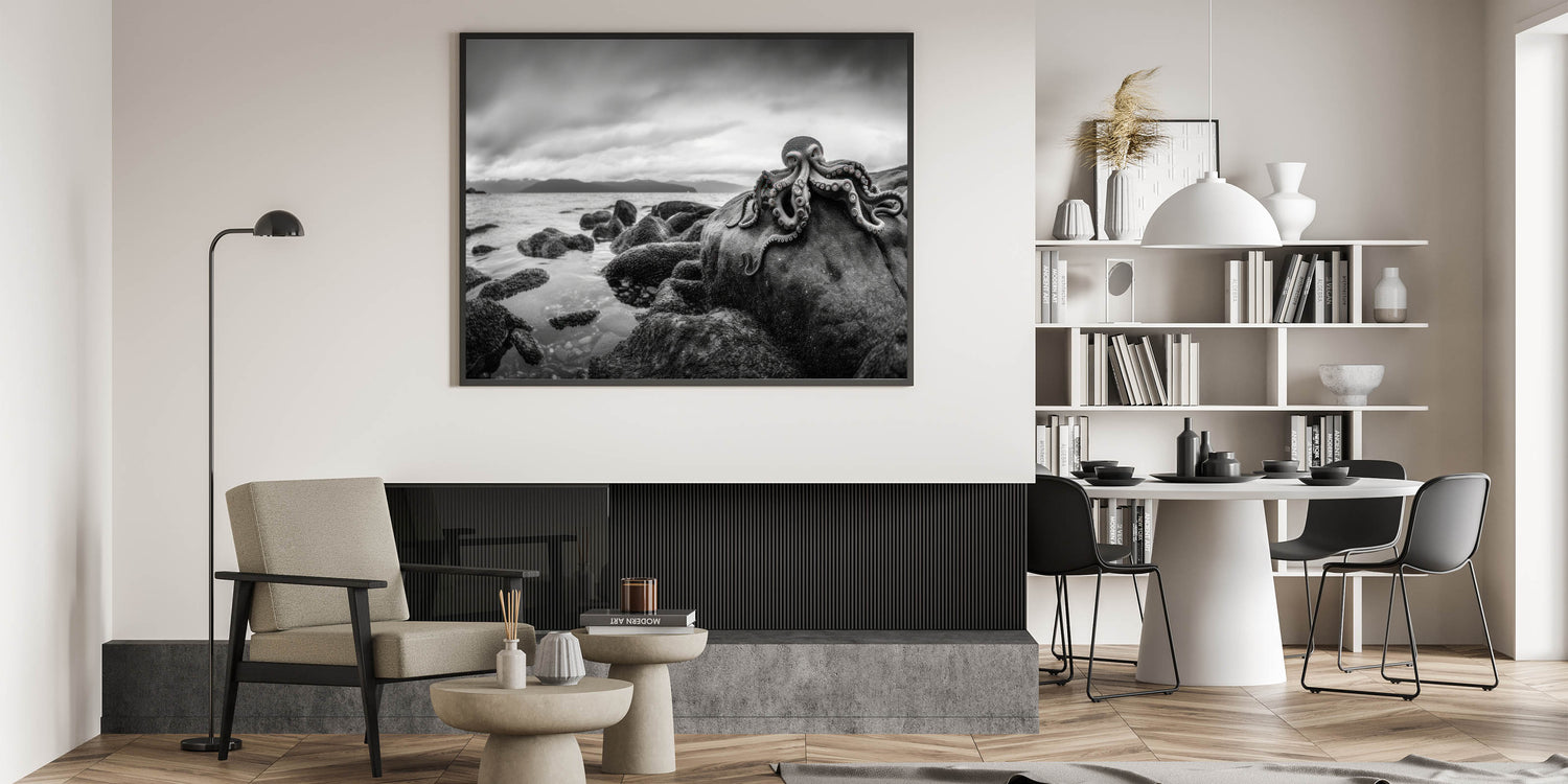 Elevate your interior with this black and white octopus photography print, and bring the fascinating world of the deep sea into your living space. Order now to add this unique coastal artwork to your collection.