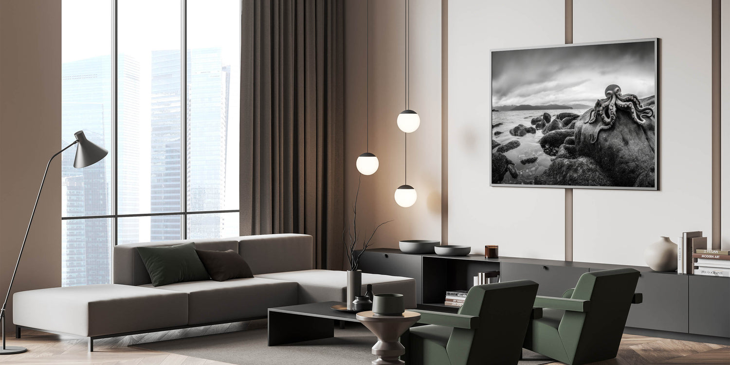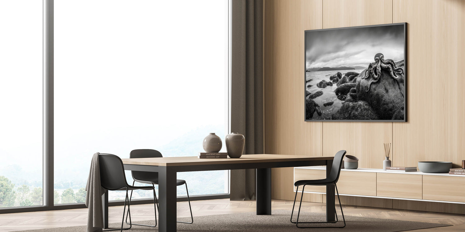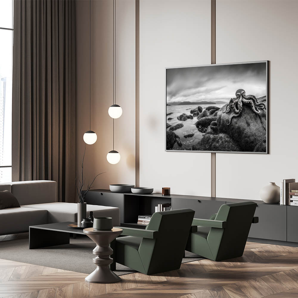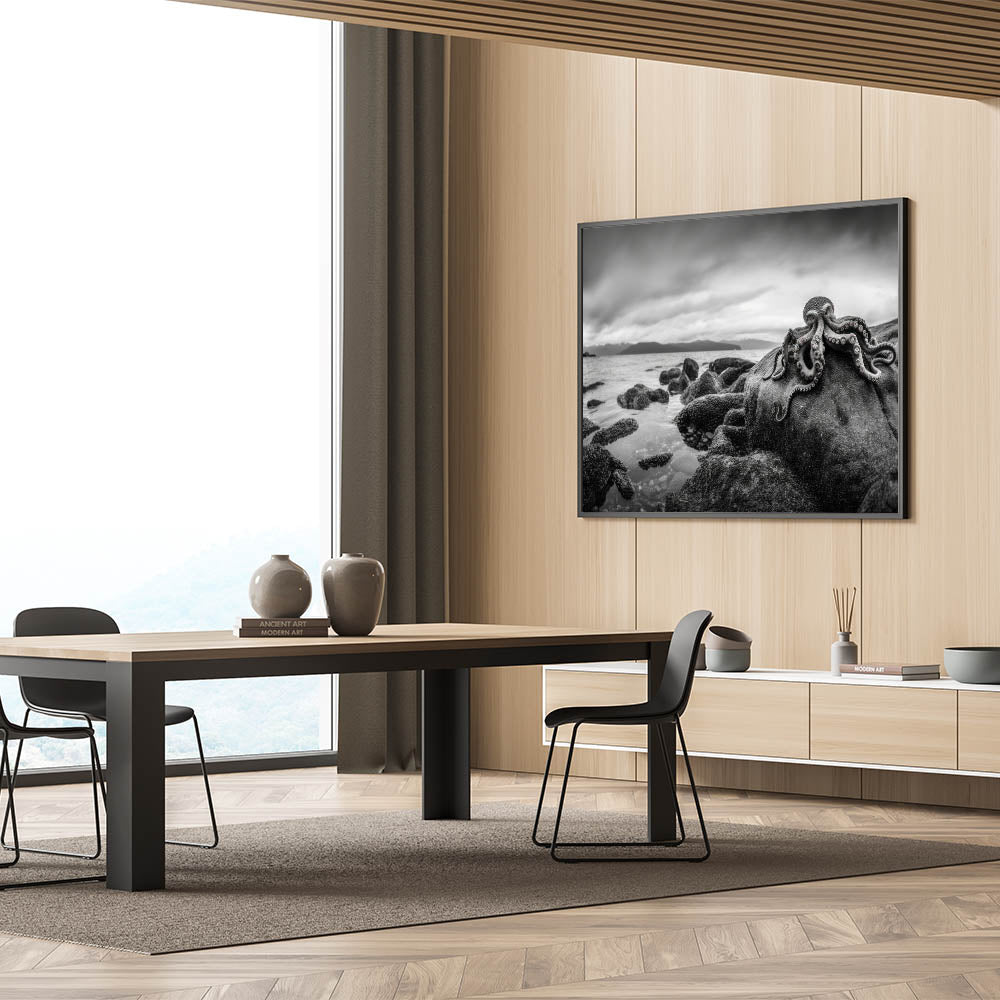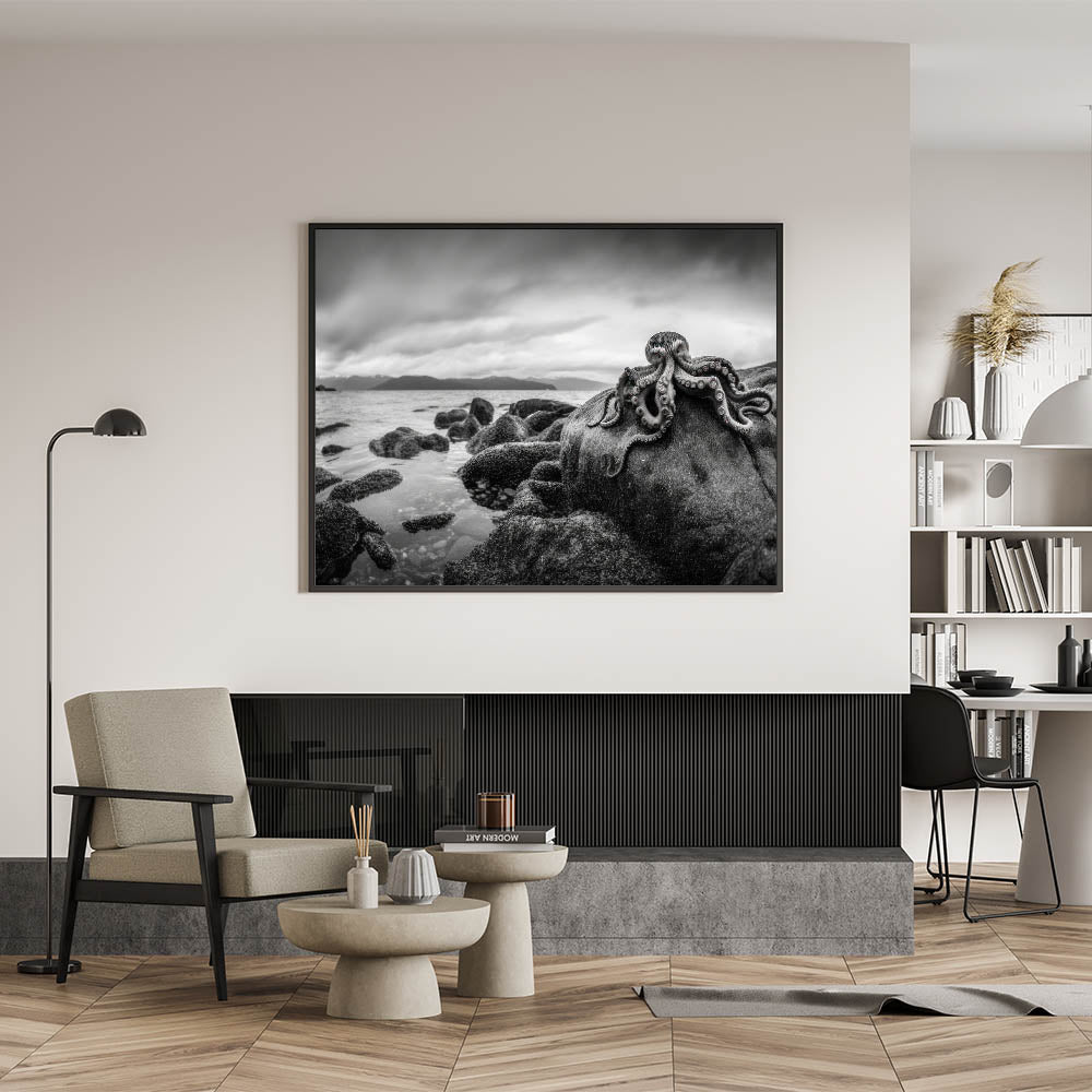 Experience the mysterious beauty of the ocean with this striking black and white octopus coastal art. This piece captures the enigmatic presence of an octopus resting on rocky shores, with a dramatic monochromatic backdrop that enhances the raw, natural beauty of the scene. Ideal for those who appreciate marine life and sophisticated decor, this artwork adds a touch of elegance and intrigue to any room. Perfect for coastal or nautical-themed spaces, this piece brings the depth and wonder of the ocean into your home.