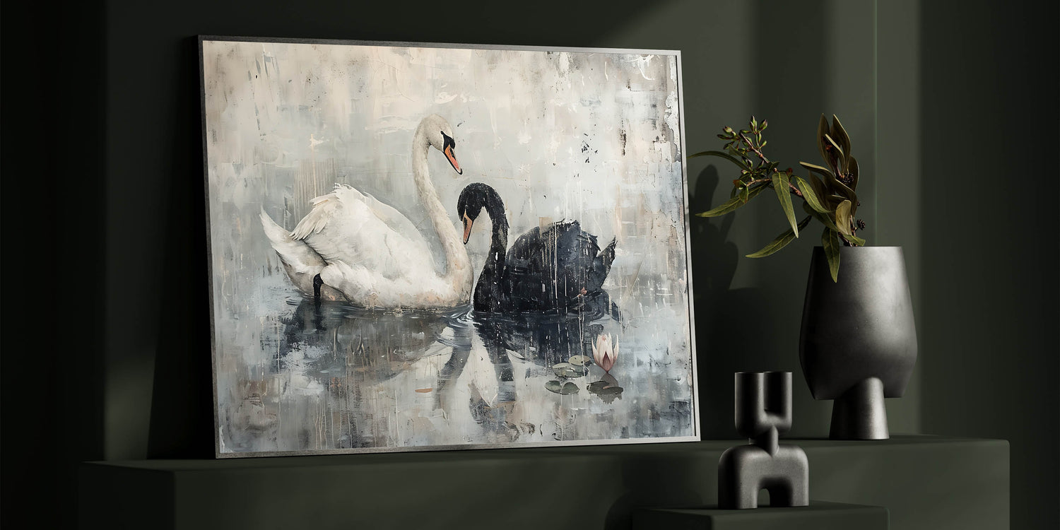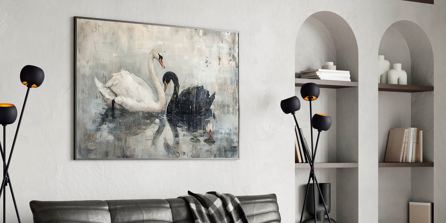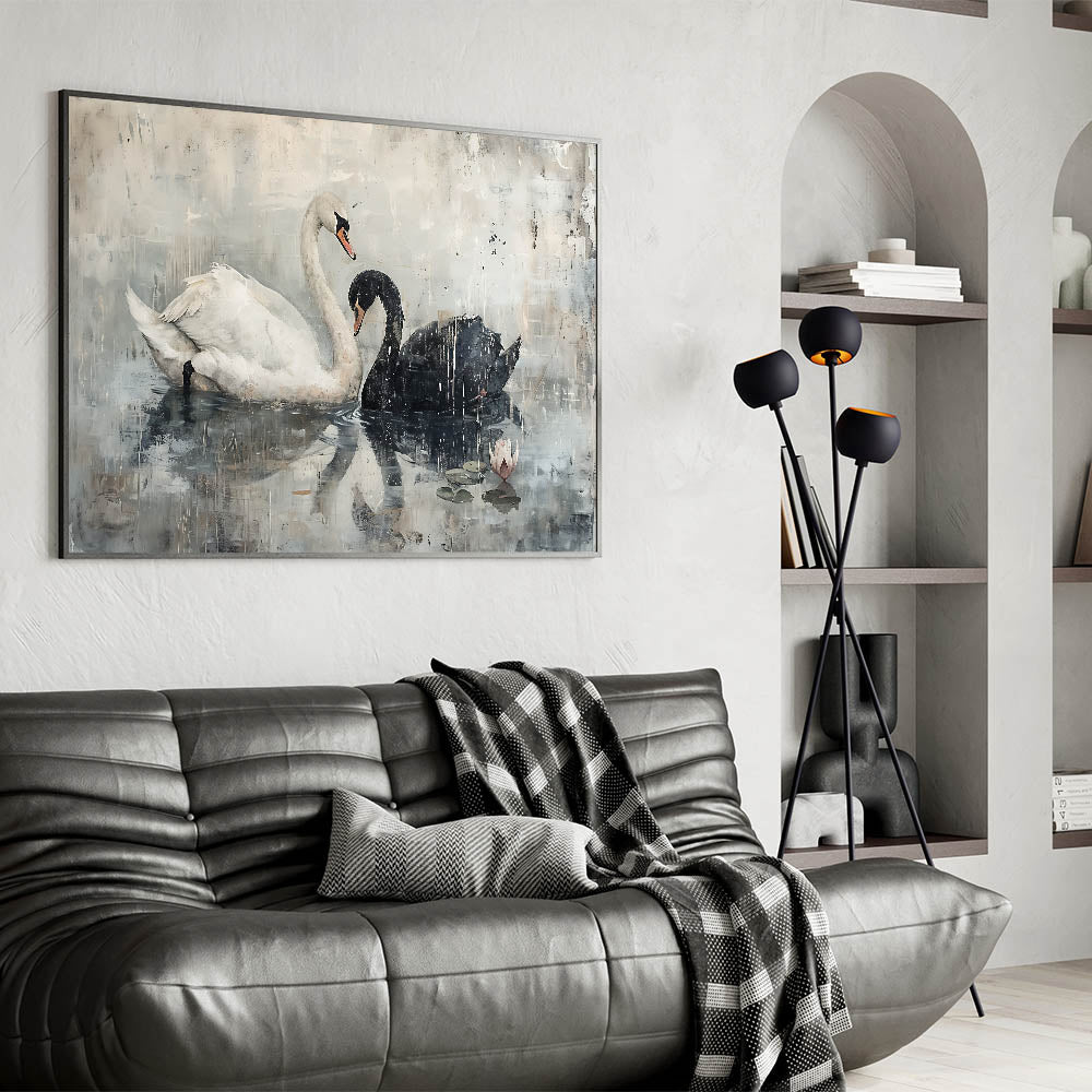 Bring a harmonious balance of elegance and contrast to your home with this stunning black and white swan wall art. This piece beautifully captures the serene moment between two swans, one black and one white, symbolizing unity and duality. The delicate brushstrokes and soft color palette create a peaceful and sophisticated ambiance, perfect for enhancing any living space.