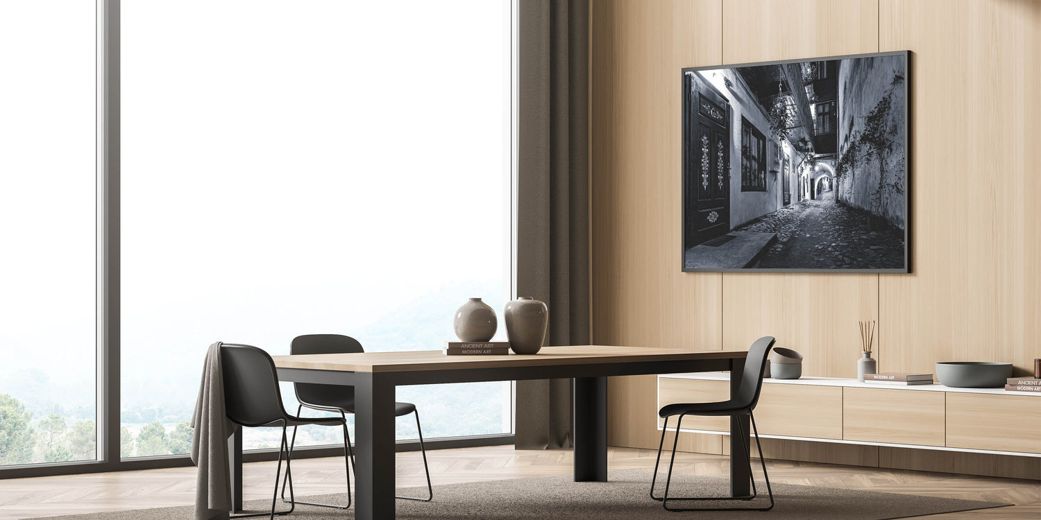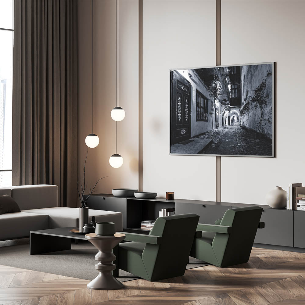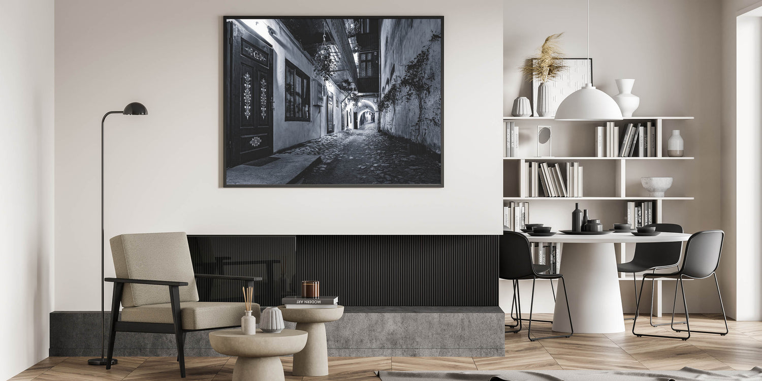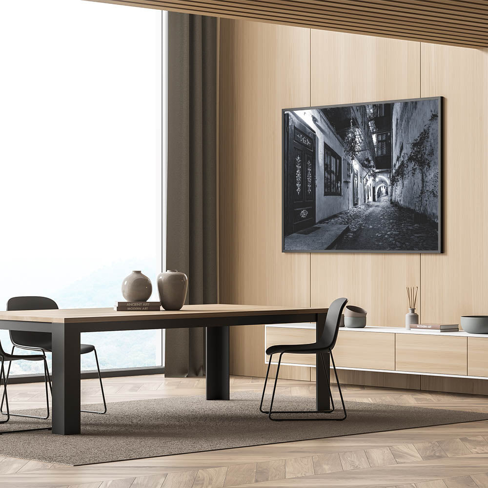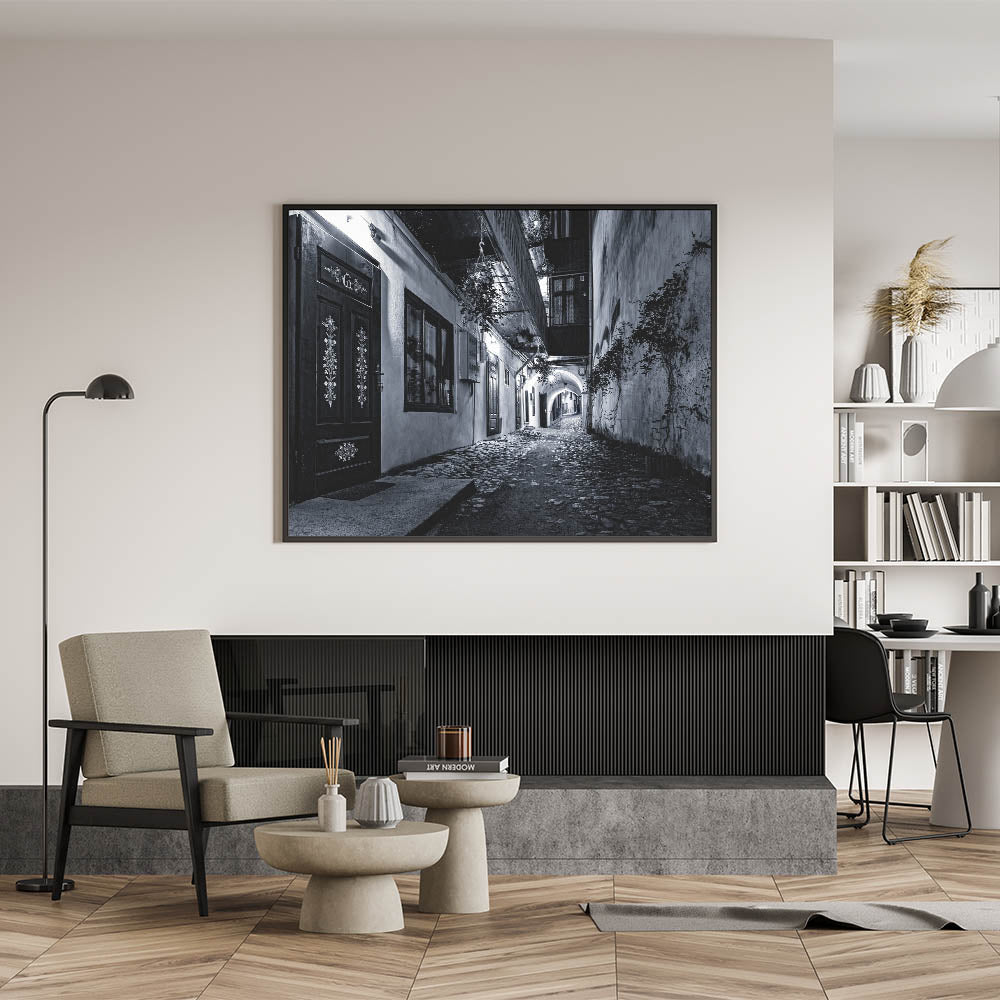 Transform your space with this high-quality urban photography print, capturing the essence of an old European alleyway in a stunning black and white composition. This modern cityscape wall art piece highlights the intricate textures of cobblestone streets, ornate wooden doors, and ambient lighting, making it an elegant addition to your home or office.