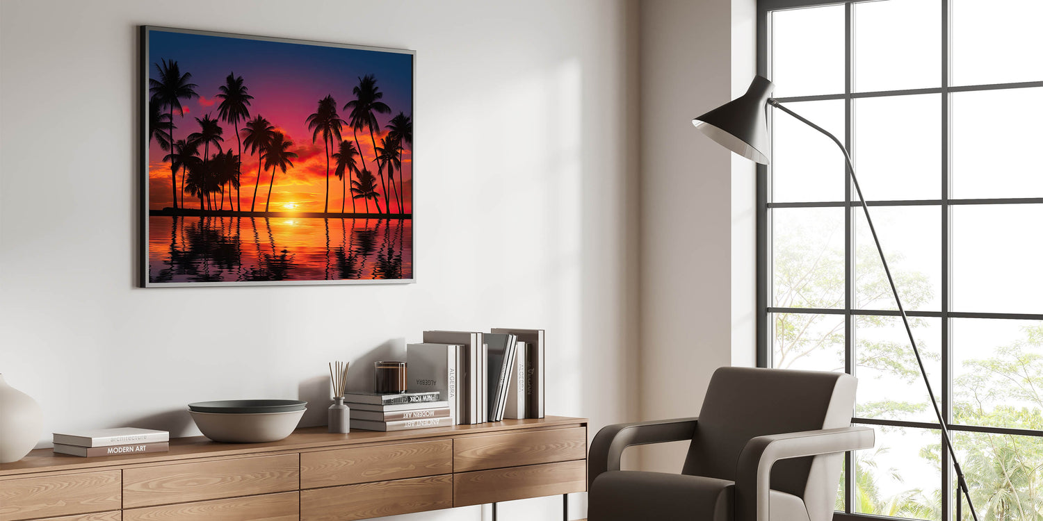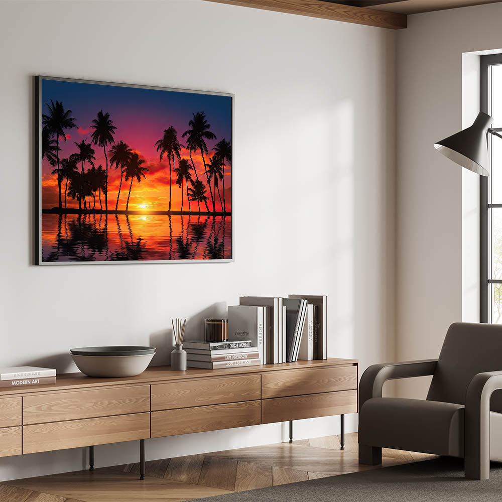 Bring the intensity and beauty of a tropical sunset into your home with this bold canvas art. The vibrant hues of deep orange, red, and purple skies reflect on the calm waters, silhouetted by majestic palm trees. This striking coastal scene captures the dramatic transition from day to night, making it a perfect focal point for any room in your home, whether it’s the living room, bedroom, or office.
