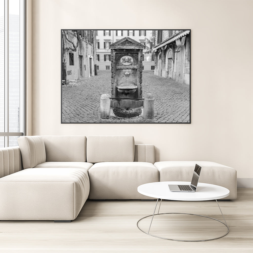 Bring timeless elegance to your home or office with this classic architectural fountain wall art. This stunning black and white piece captures the essence of historical architecture, featuring a beautifully detailed fountain nestled in a charming, cobblestone square. The intricate design and texture of the stone fountain are accentuated by the monochrome palette, making it a versatile addition to any decor style.