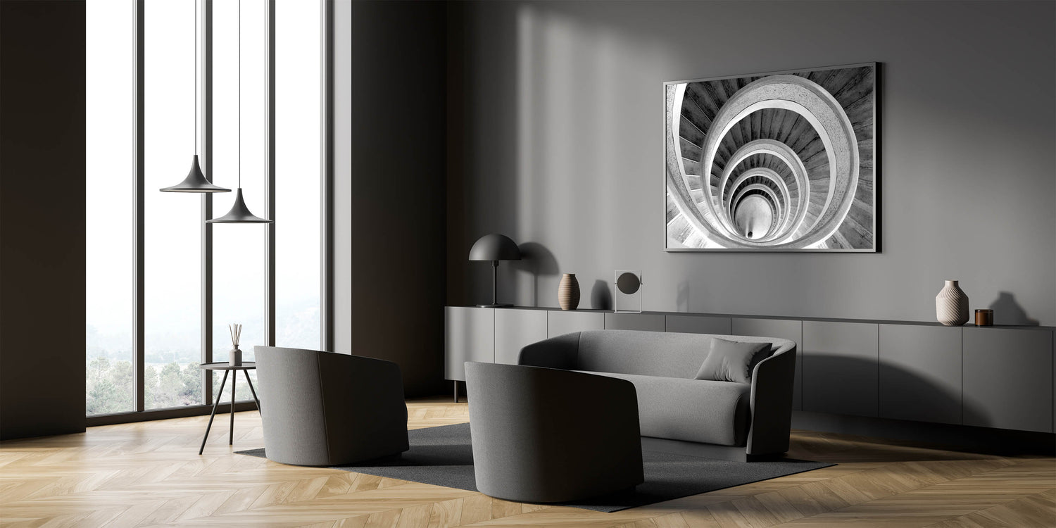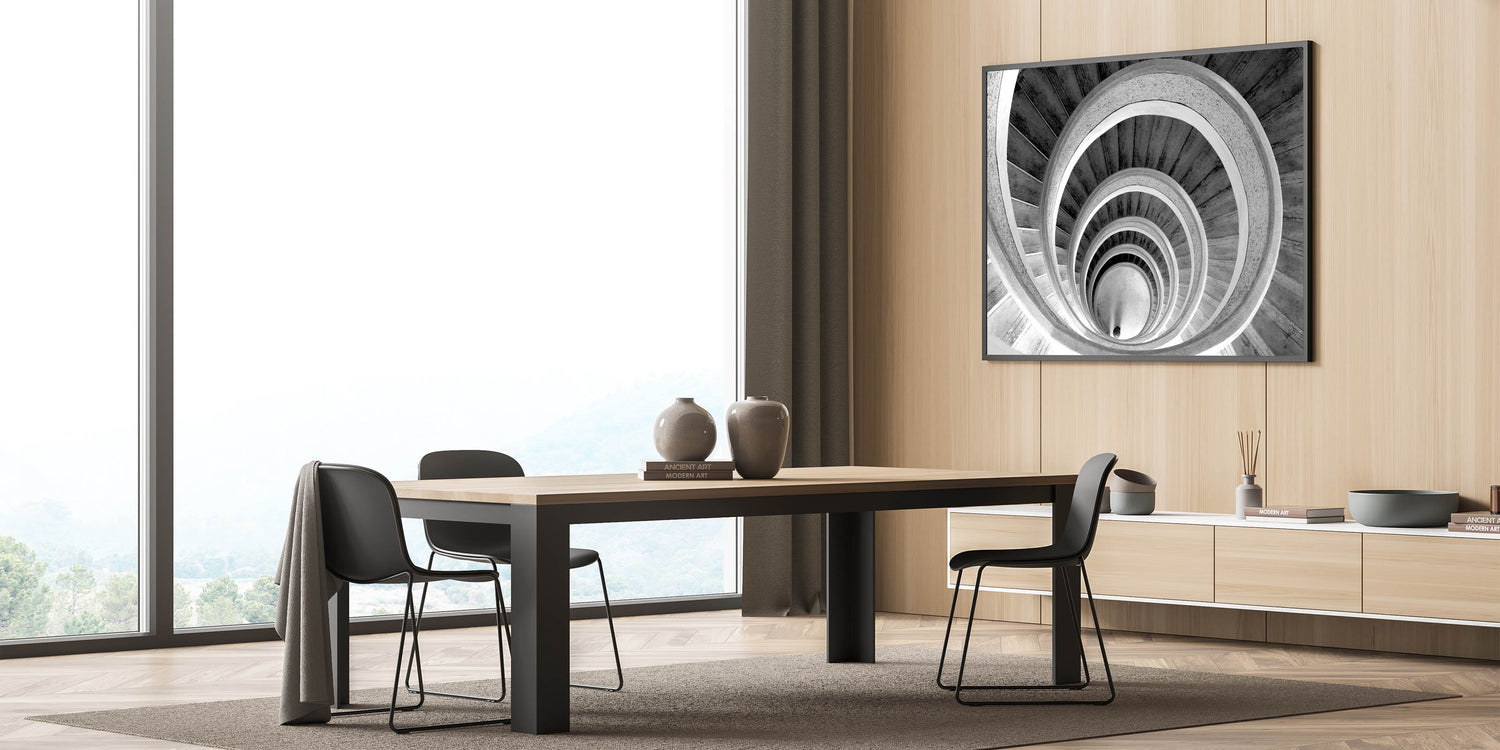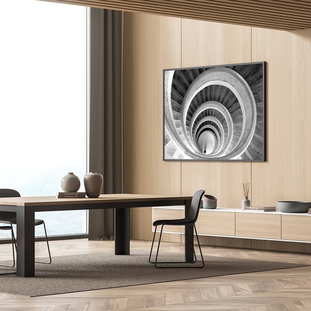 Add a touch of timeless elegance to your space with this classic black and white spiral staircase wall art. The monochromatic design highlights the architectural beauty and intricate details of the staircase, creating a striking visual impact. This piece is perfect for those who appreciate minimalist design and want to enhance their home or office with sophisticated decor. Available in various formats, including stretched canvas, framed canvas, acrylic glass, framed acrylic glass, framed print, rolled canvas, and rolled print, you can choose the option that best suits your style and space.