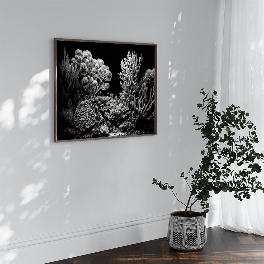 Experience the timeless elegance of the ocean with this Black and White Coral Wall Art. This artwork captures the intricate beauty of coral in stunning grayscale, creating a sophisticated and dramatic piece that stands out in any room. The contrast between light and shadow highlights the intricate textures of the coral, making it a perfect choice for modern and minimalist interiors.