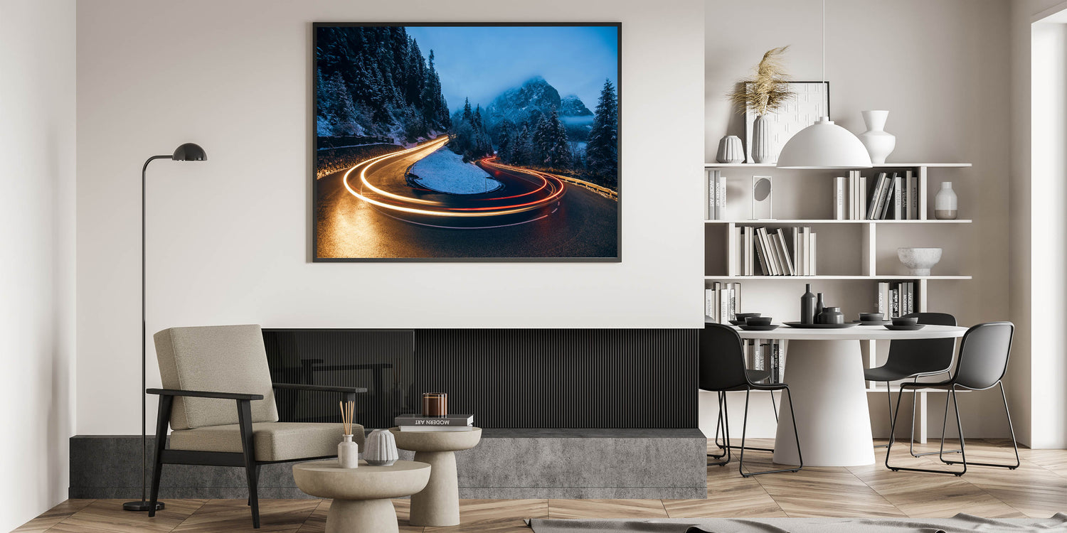 Bring the excitement of a night drive through the mountains into your space with this unique road trip photography. Whether you're captivated by the light trails or the serene yet thrilling ambiance of the scene, this wall art is sure to inspire a sense of adventure and wonder.