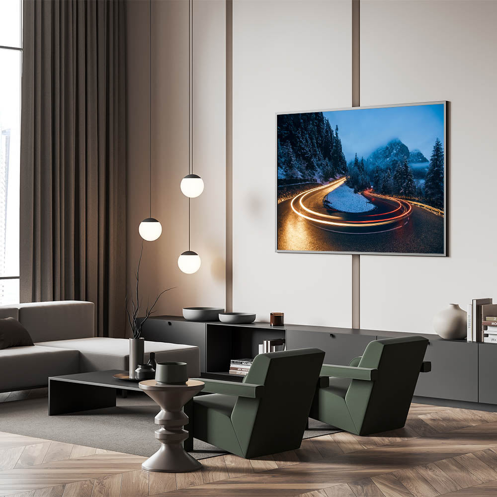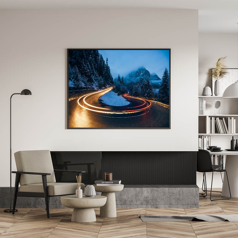 Experience the thrill and beauty of a nighttime mountain drive with this captivating Curved Mountain Road wall art. Perfect for those who appreciate the excitement of the open road, this artwork captures the dynamic light trails of a winding road against a backdrop of snow-covered mountains, bringing a sense of adventure and mystery to any space.