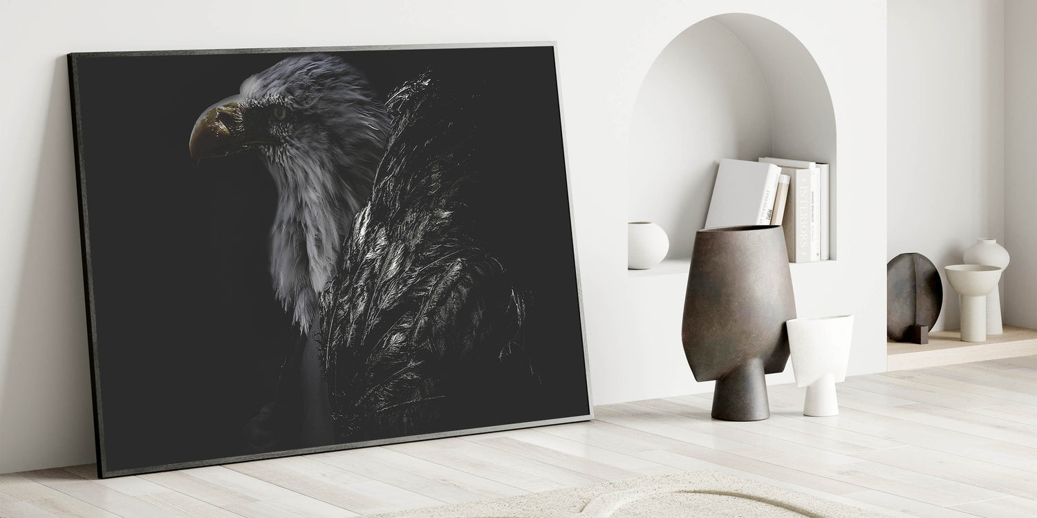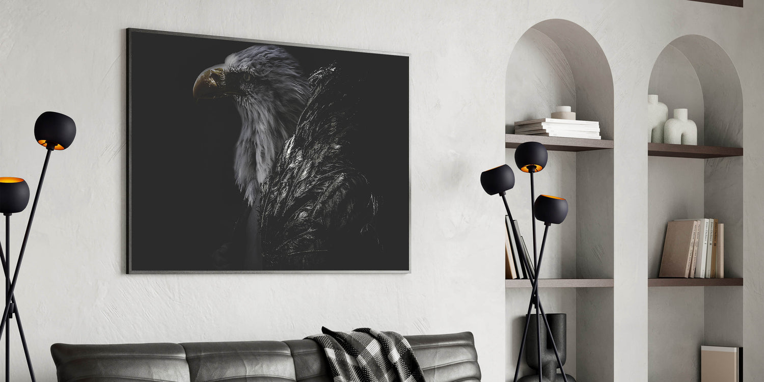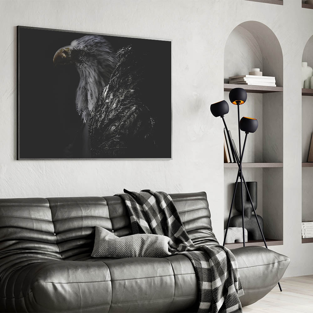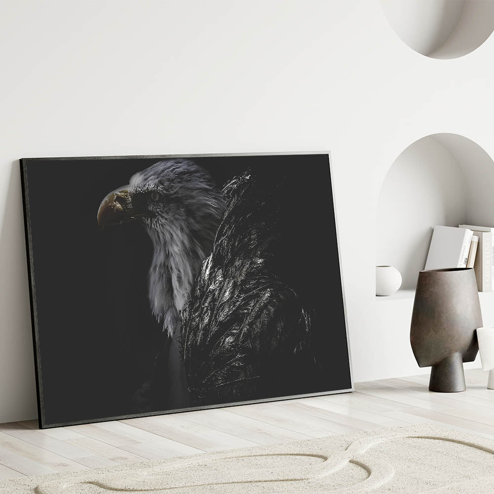 Introduce a touch of dramatic elegance to your space with this "Dark Majesty" wall art, featuring a powerful eagle portrait. This striking artwork captures the eagle in a mysterious and commanding pose, with its feathers gleaming against a deep, shadowy background. The subtle interplay of light and dark enhances the intensity of the eagle’s gaze, making this piece a bold and sophisticated addition to any room.