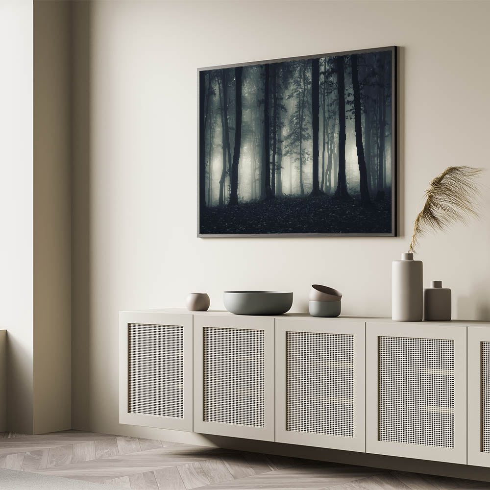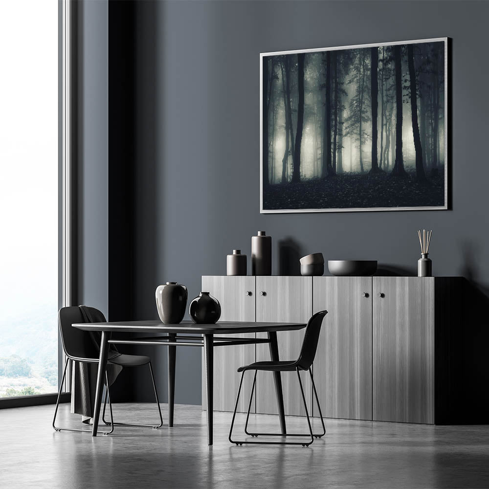 Immerse yourself in the mysterious beauty of nature with this Dark Misty Forest Art, a captivating piece that captures the quiet, eerie atmosphere of a fog-covered forest. The dense mist wraps around the tall, shadowy trees, creating a dramatic and hauntingly beautiful scene. This artwork is perfect for those who appreciate the darker side of nature and wish to add a bold, dramatic touch to their decor.