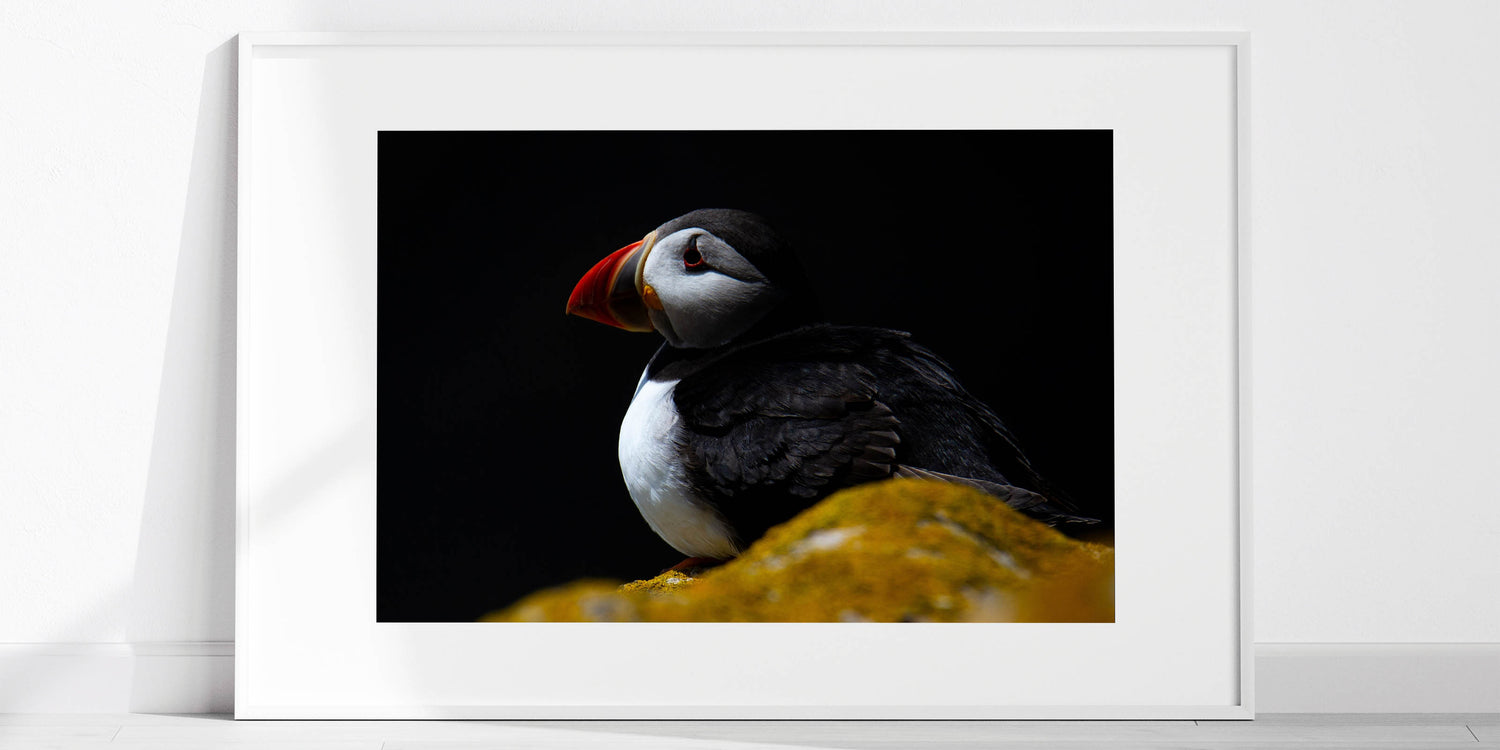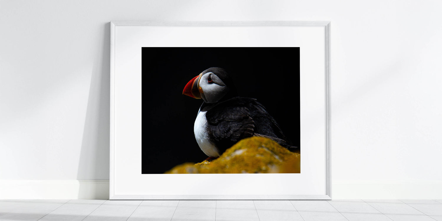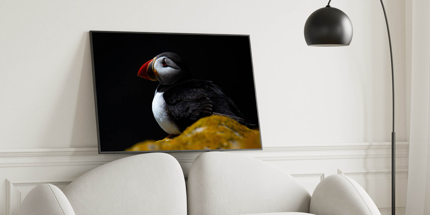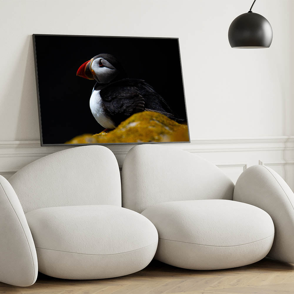 Infuse your space with the mysterious allure of this dramatic Puffin wall art. Captured in a striking low-light setting, the Puffin stands out against a dark background, creating a moody and captivating piece that is perfect for modern and contemporary decor. This artwork is ideal for those who appreciate the beauty of nature presented in a unique and artistic way.
