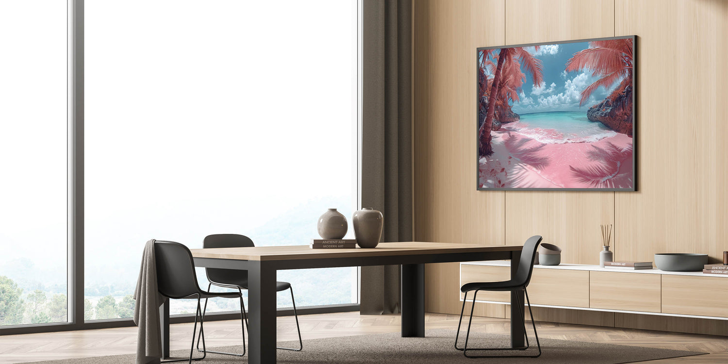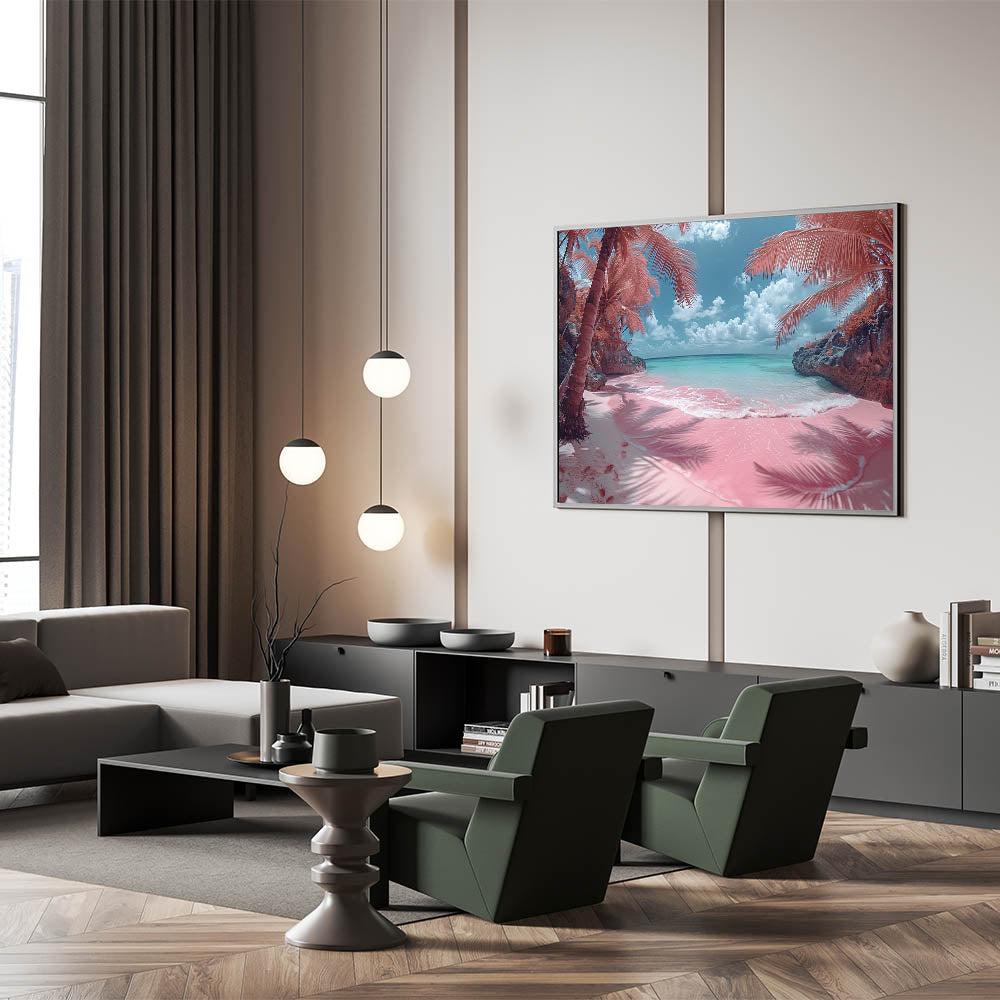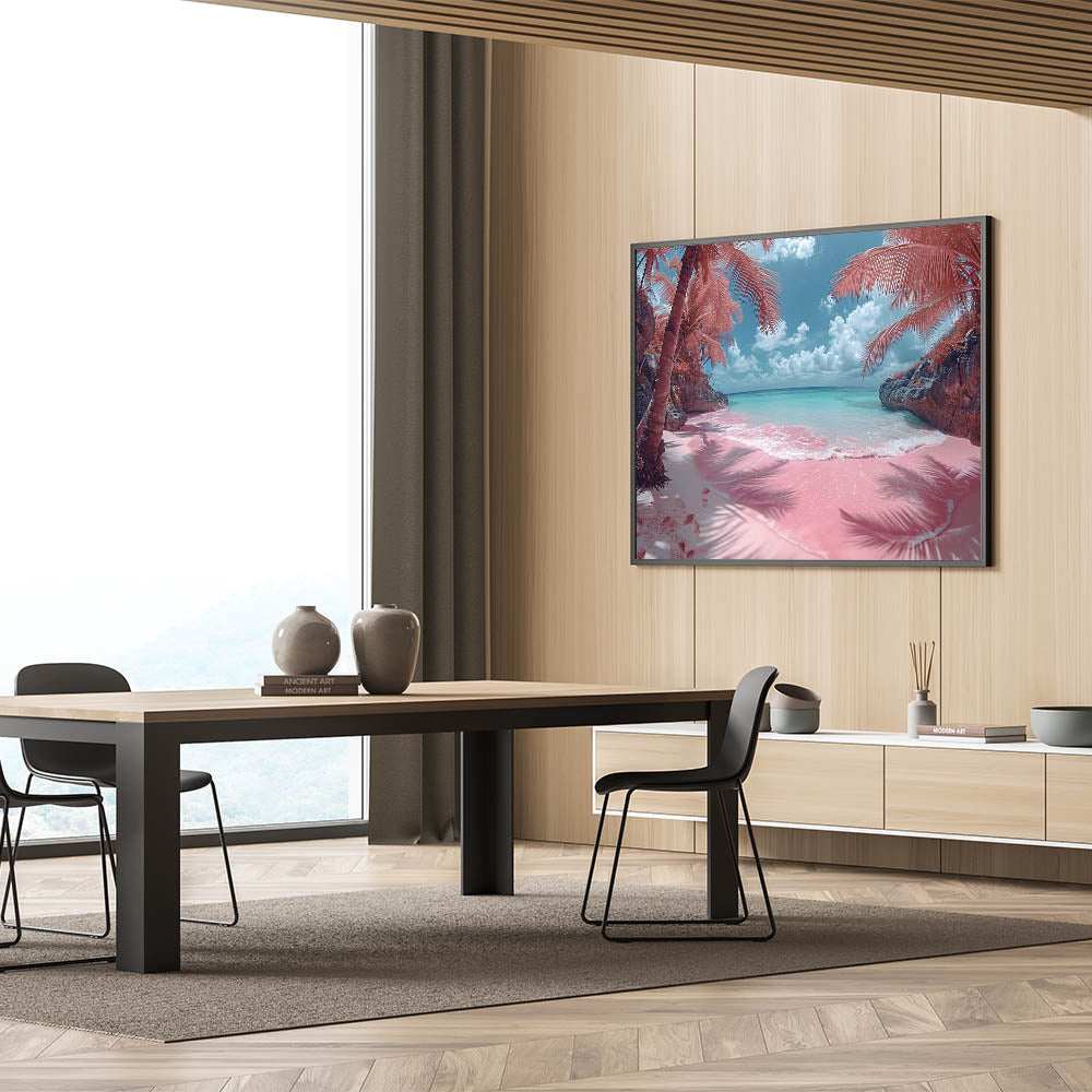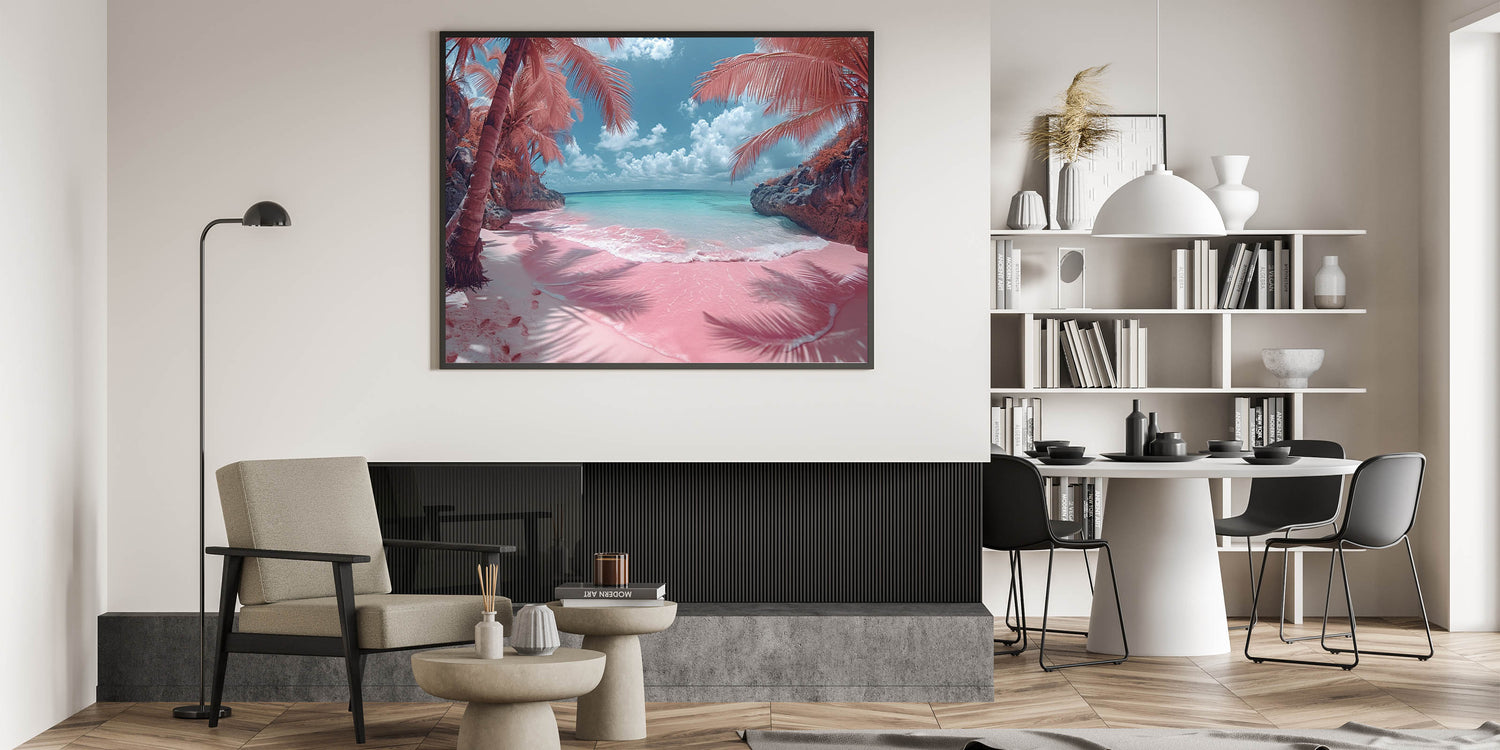Transport yourself to a dreamy tropical paradise with this captivating pink beach artwork. The surreal colors of the pink sand and turquoise waters, framed by lush palm trees, create a scene that is both enchanting and otherworldly. This piece is perfect for those who love bold and unique decor, offering a touch of whimsy and tropical charm to any space.