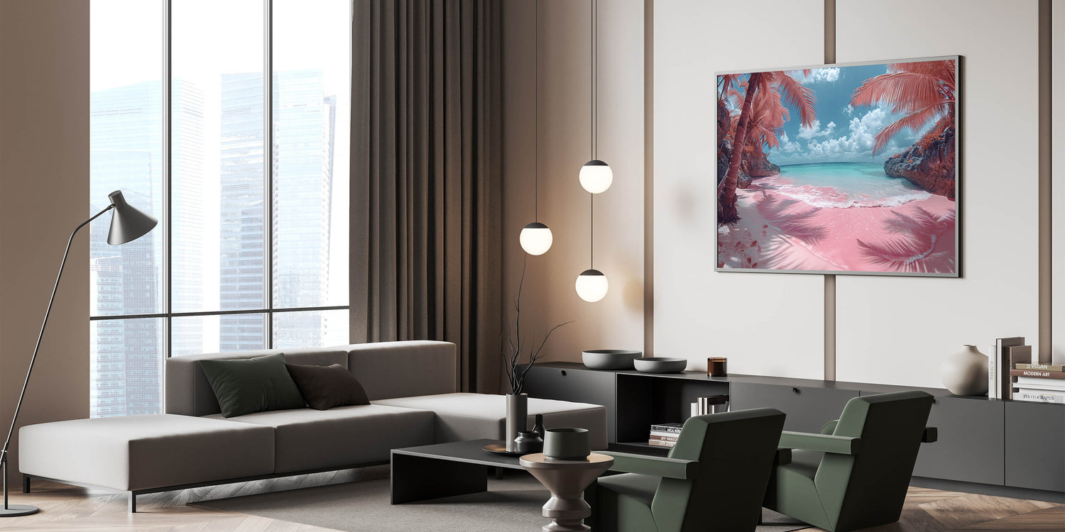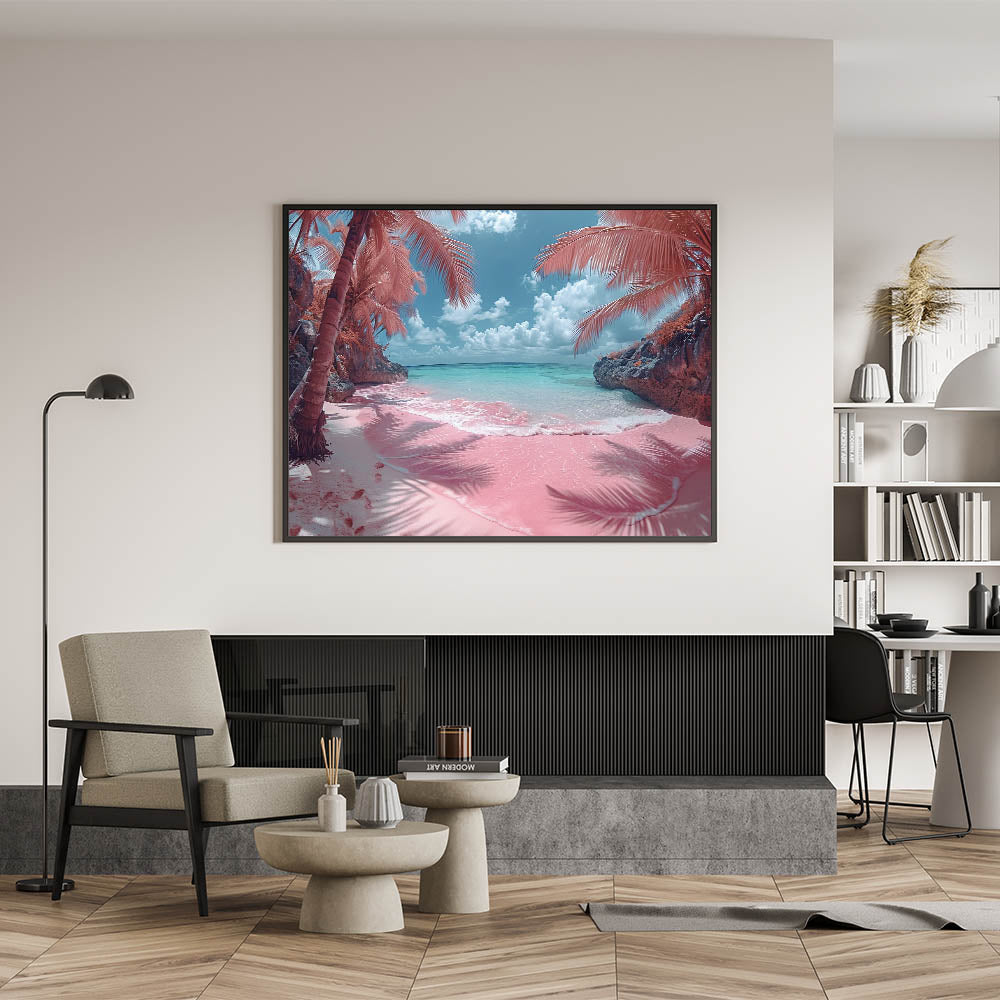 - Vibrant and Unique Colors: The striking combination of pink sand and turquoise water, along with the soft pastel tones of the sky, brings a fresh and playful vibe to your decor.