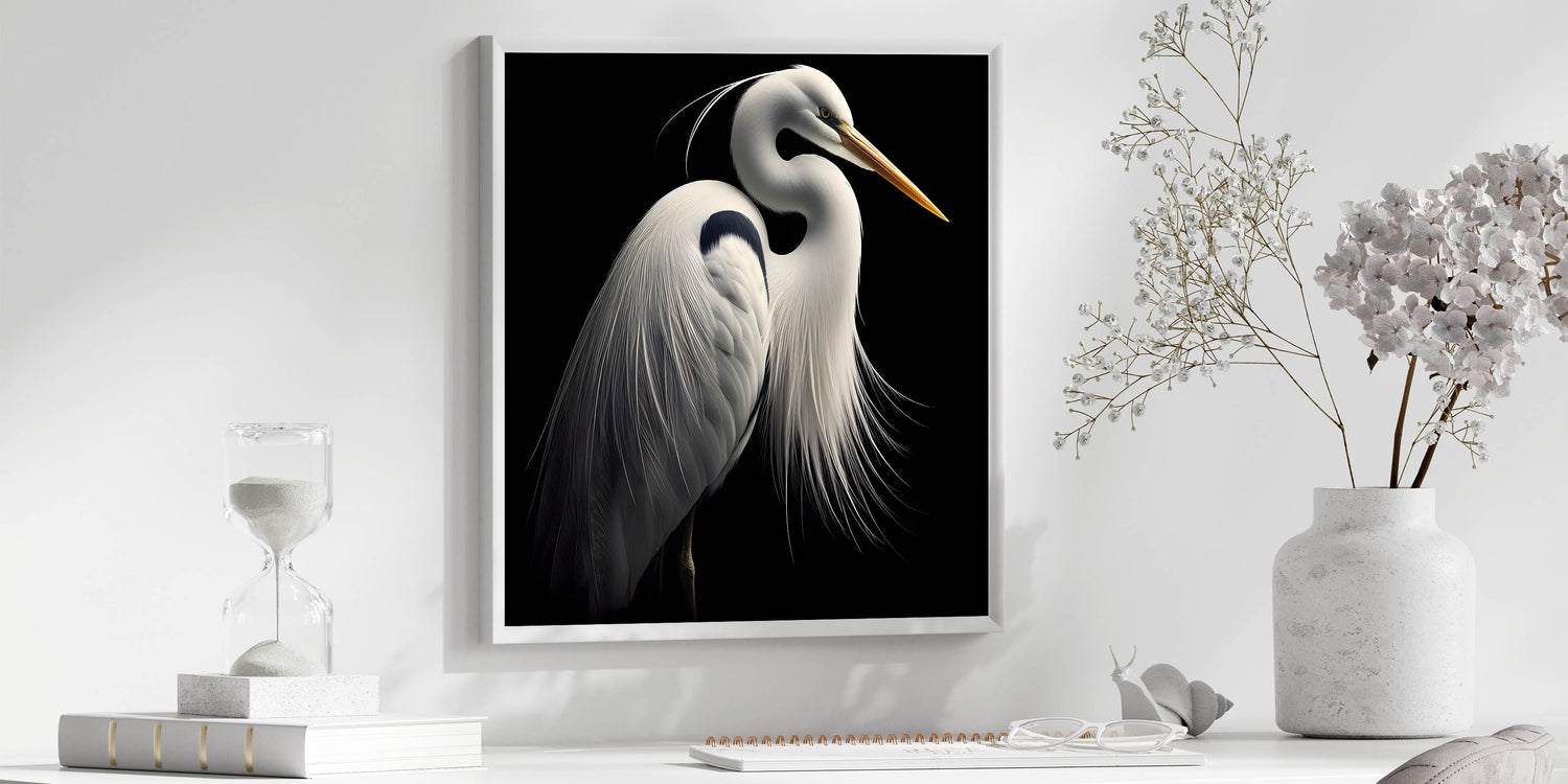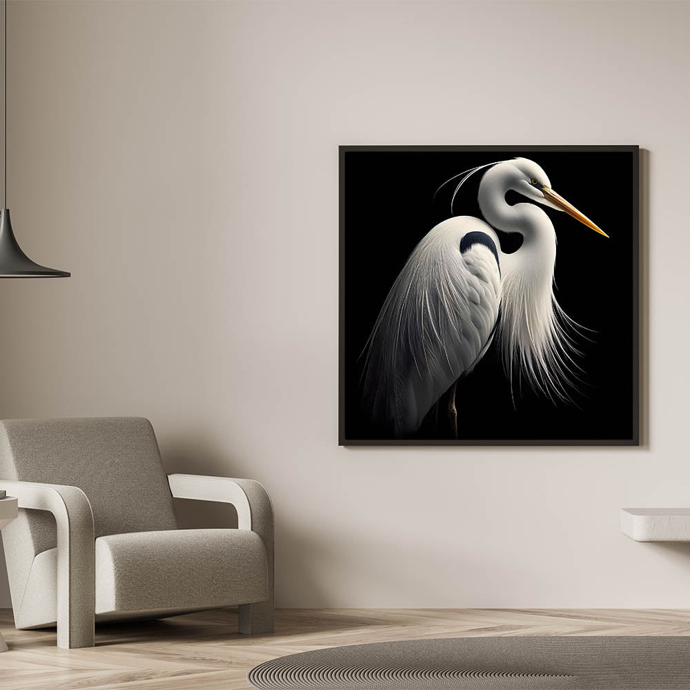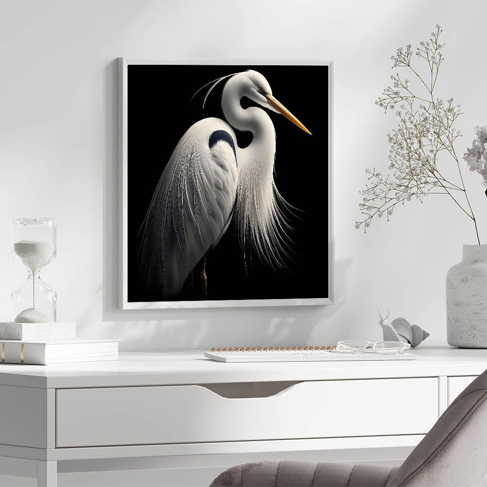 - Striking Monochrome Contrast: The artwork’s bold contrast between the white egret and the black background adds depth and sophistication to your decor.