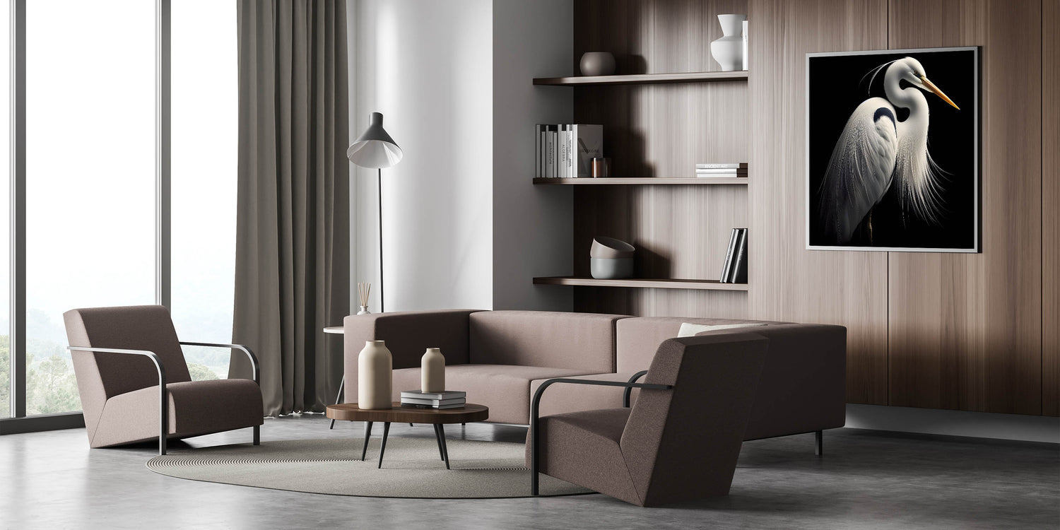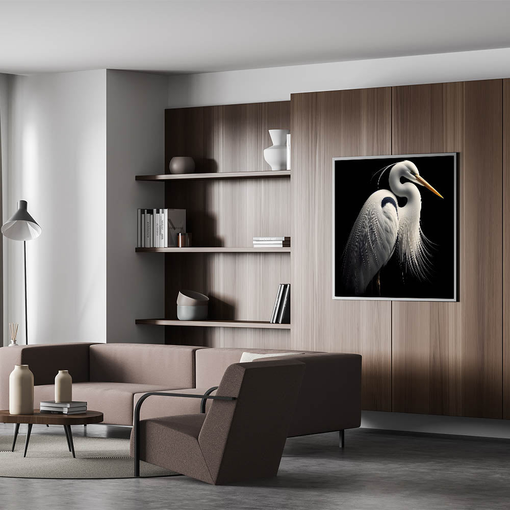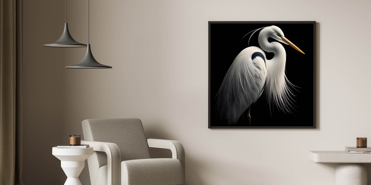 - Striking Monochrome Contrast: The artwork’s bold contrast between the white egret and the black background adds depth and sophistication to your decor.