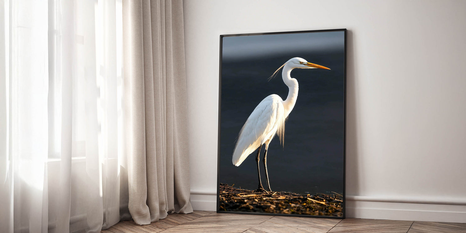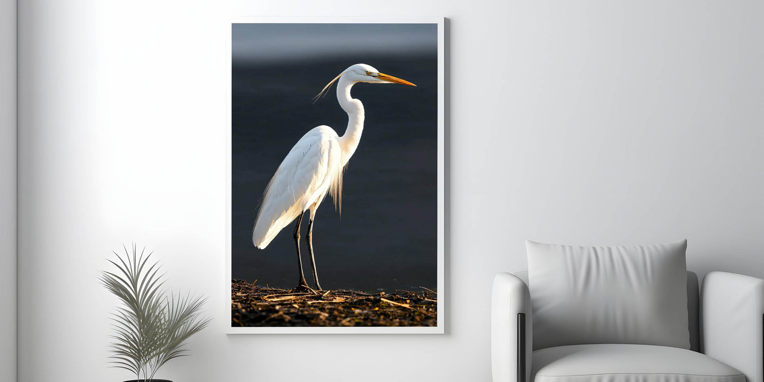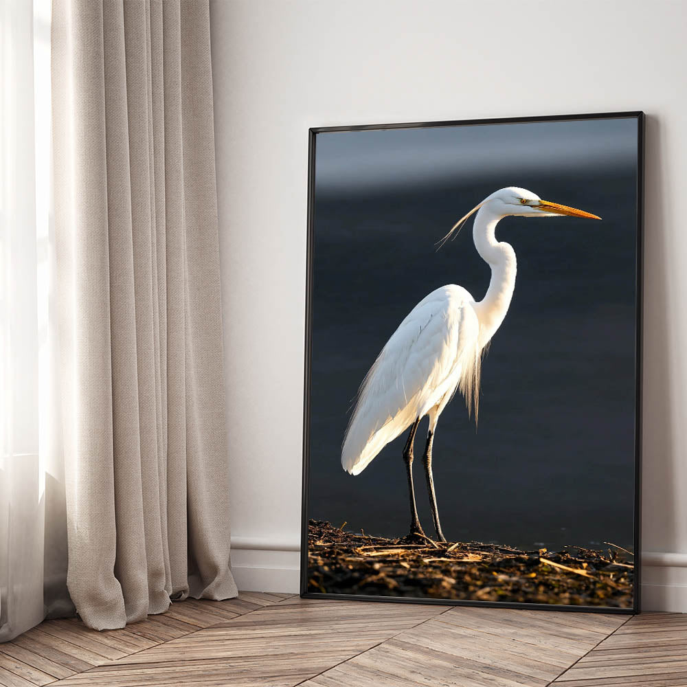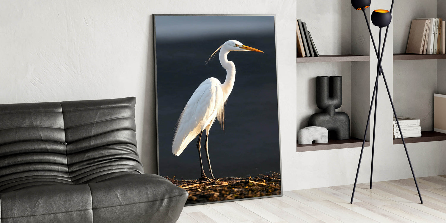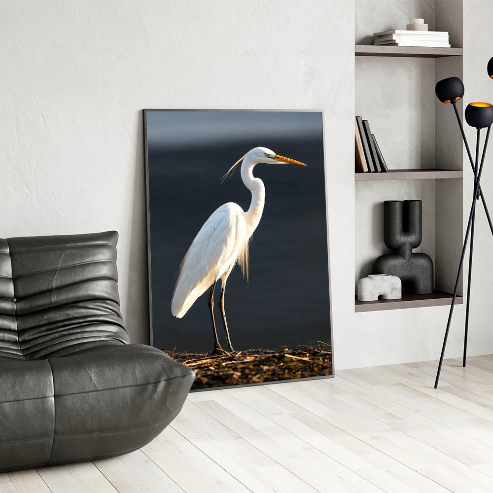 - Striking Contrast: The artwork features a bold contrast between the white feathers of the egret and the deep, dark background, adding depth and sophistication to your decor.