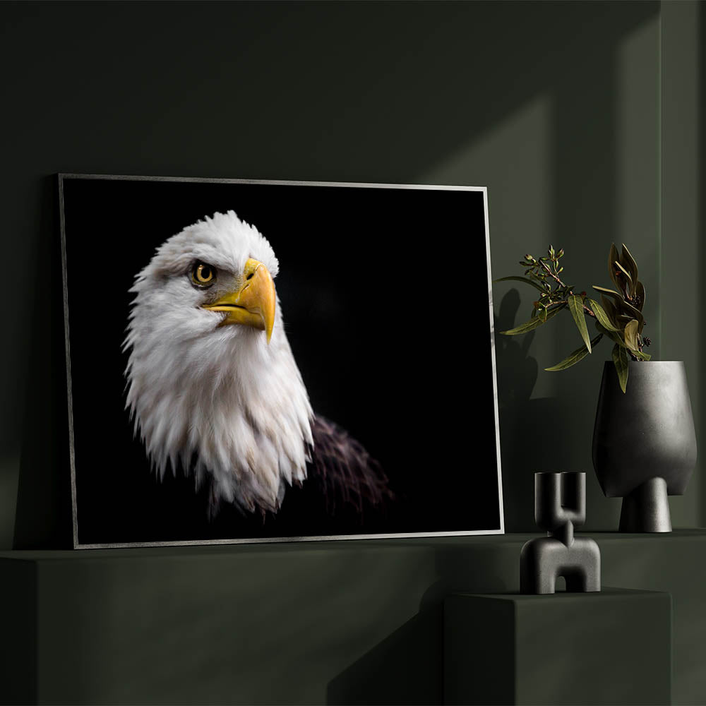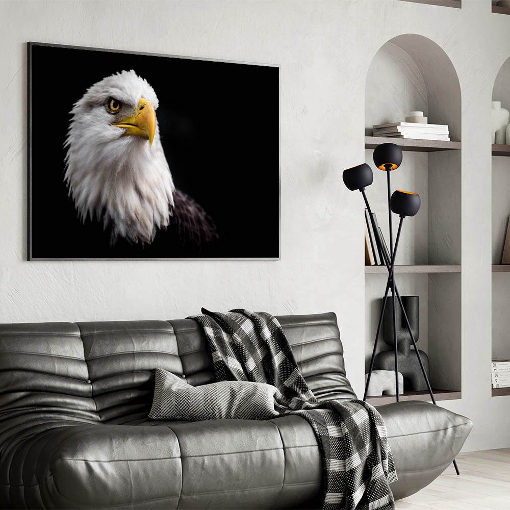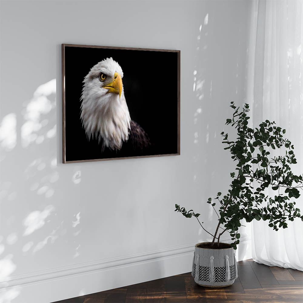 Add a touch of power and grace to your space with this elegant birds of prey wall art. Featuring a striking close-up portrait of a majestic bald eagle, this artwork captures the fierce and noble spirit of one of nature's most iconic birds. The eagle’s piercing gaze and detailed feathers are beautifully contrasted against a dark background, making this piece a standout in any room.