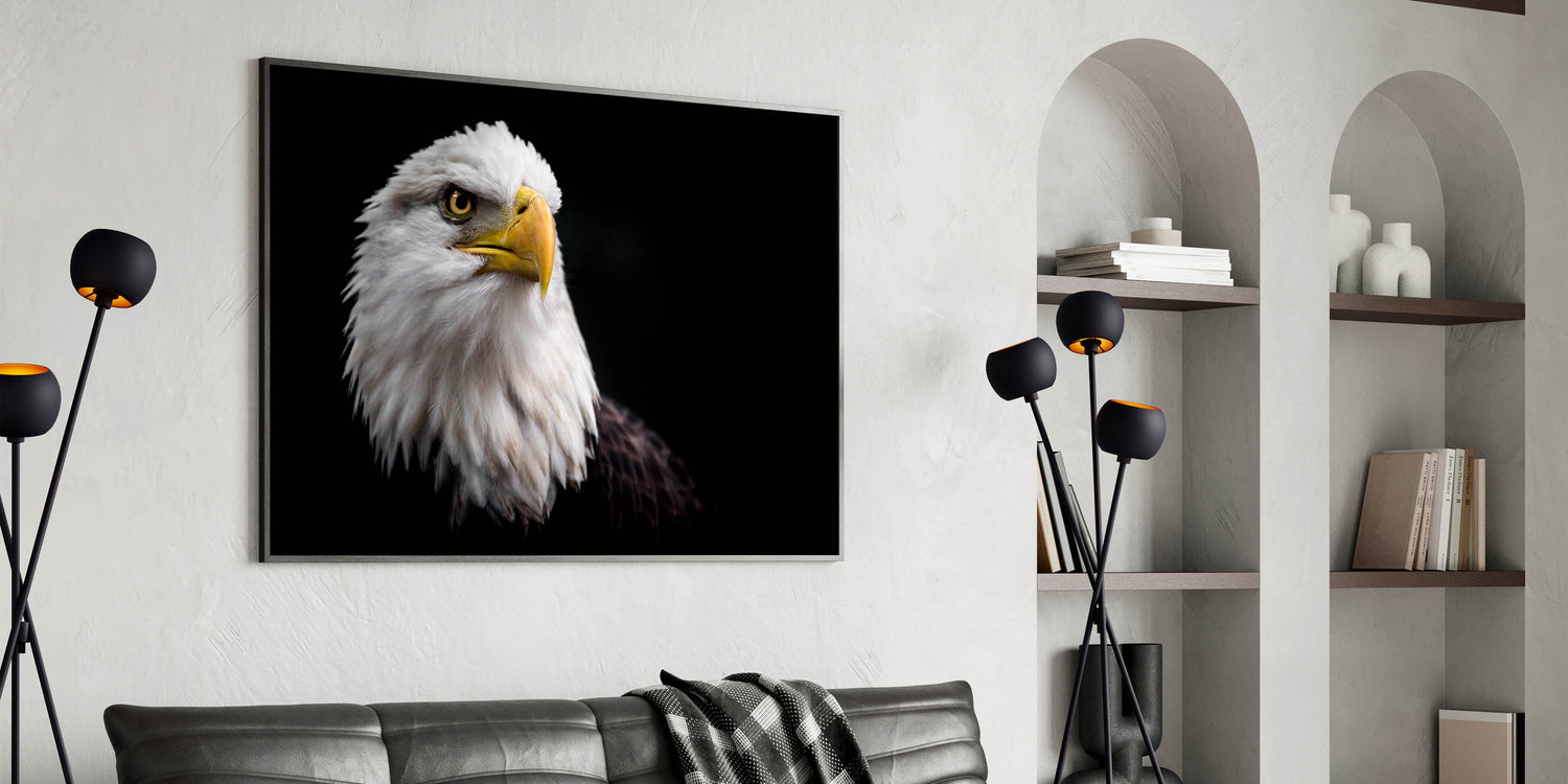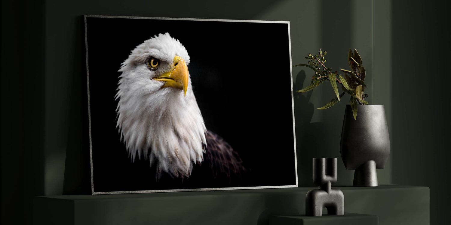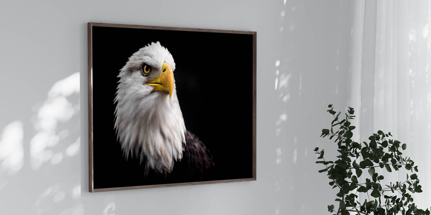 Add a touch of power and grace to your space with this elegant birds of prey wall art. Featuring a striking close-up portrait of a majestic bald eagle, this artwork captures the fierce and noble spirit of one of nature's most iconic birds. The eagle’s piercing gaze and detailed feathers are beautifully contrasted against a dark background, making this piece a standout in any room.