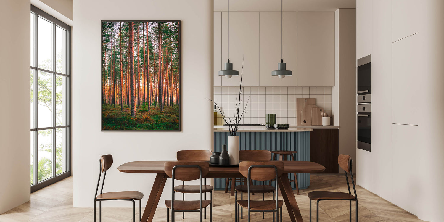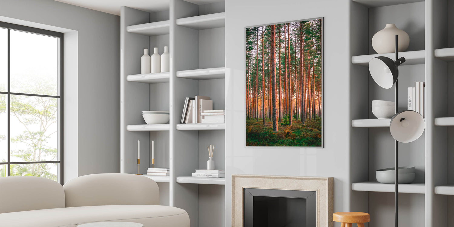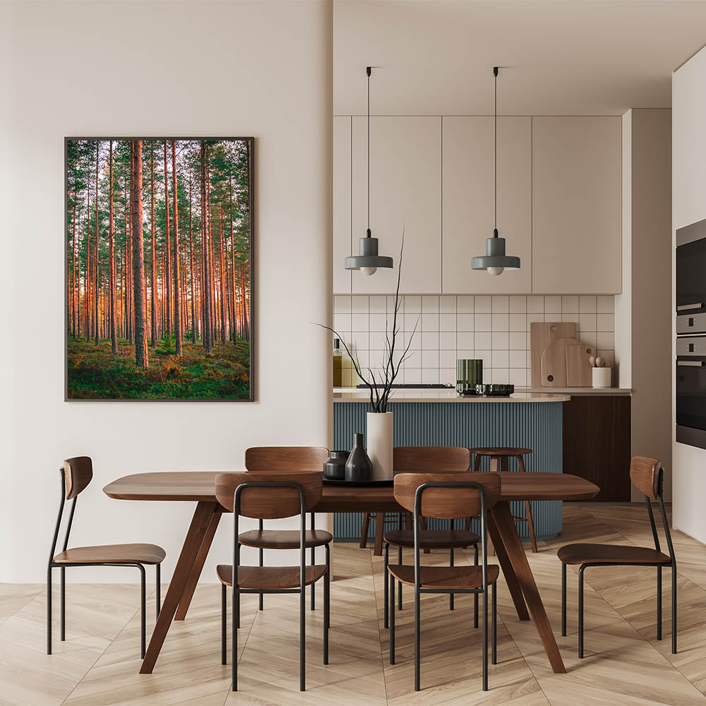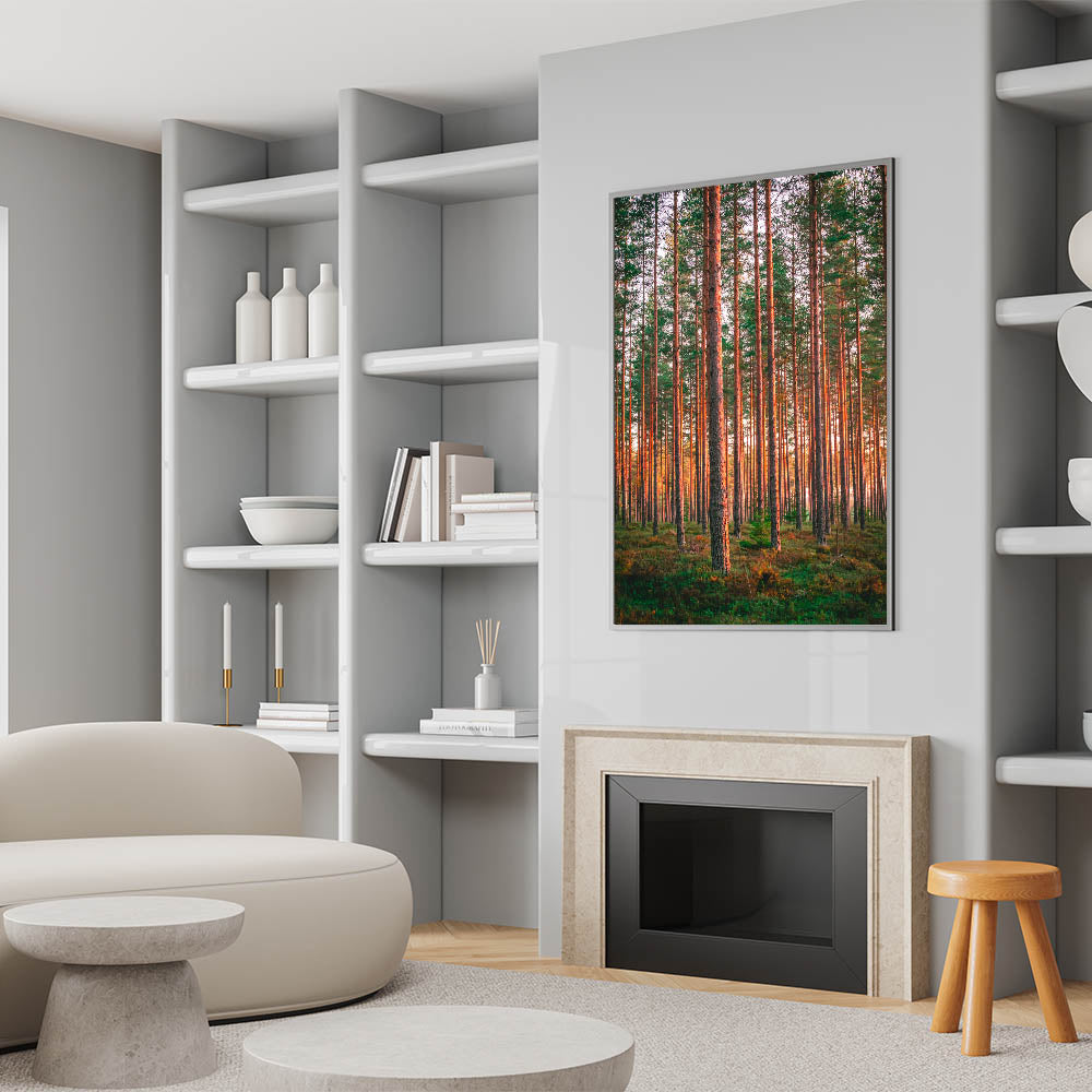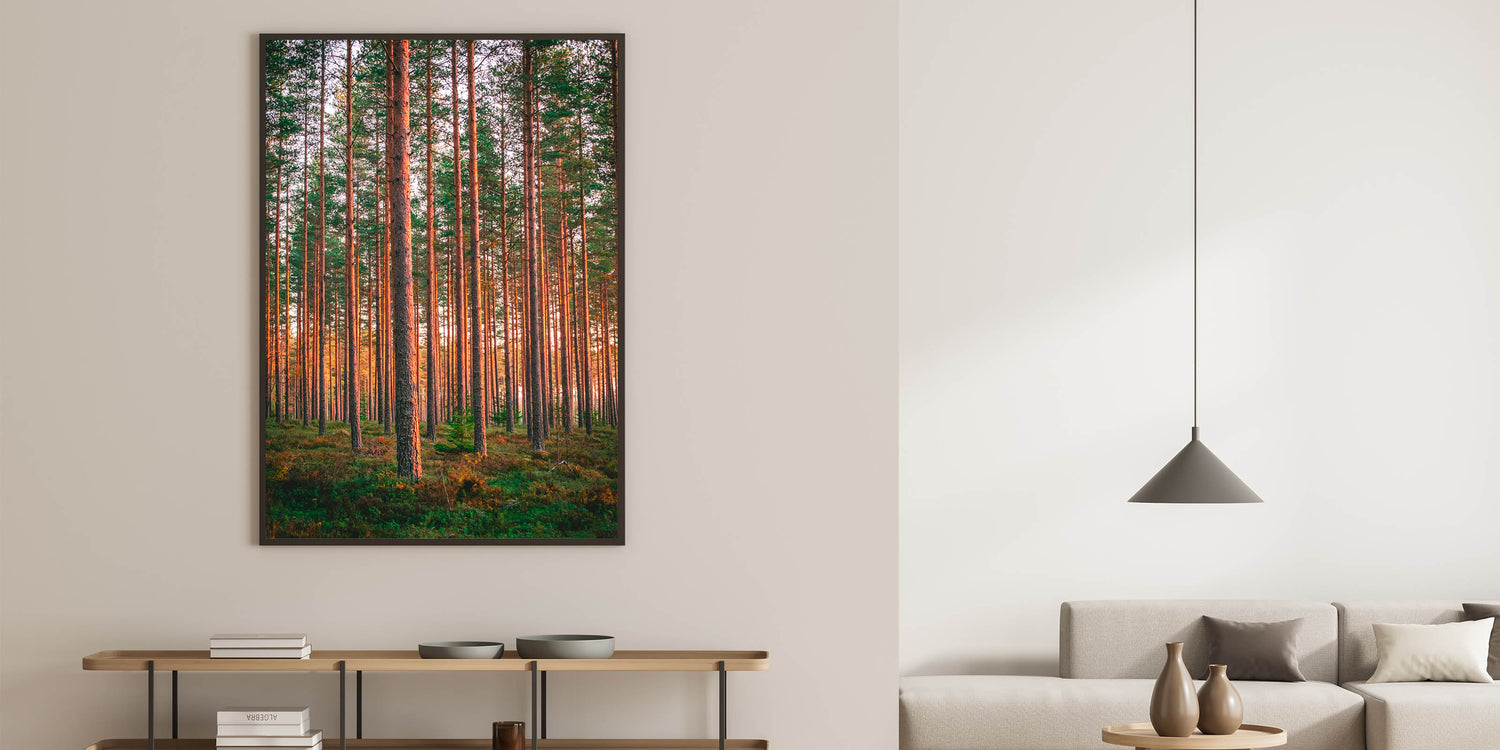 Bring the beauty of Finland’s pine forests into your home with this stunning wall art, capturing the warmth of the sunlight filtering through the tall, straight trees. This scenic Finland art piece perfectly encapsulates the serene and majestic atmosphere of a Nordic forest. Ideal for nature lovers, this artwork adds a calming and natural touch to any space, from living rooms to offices.