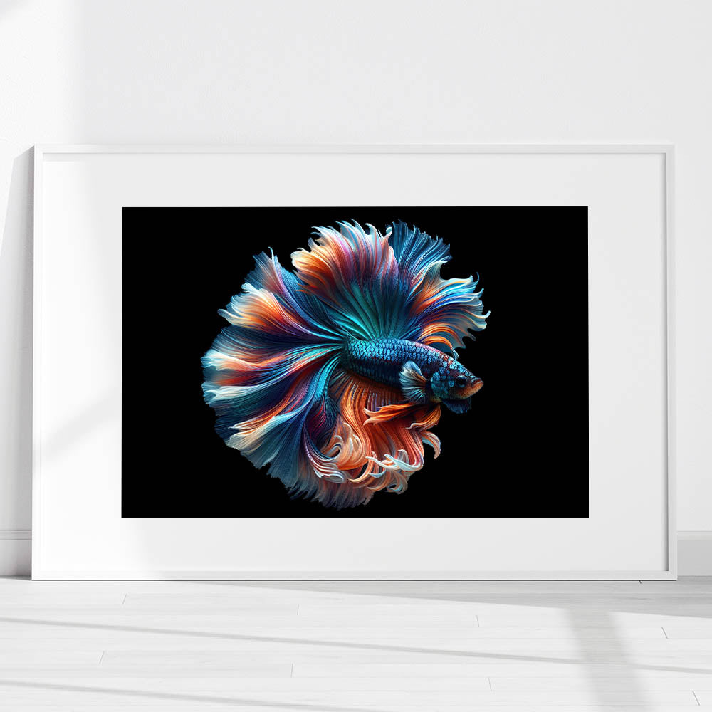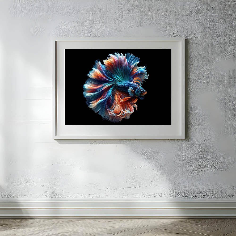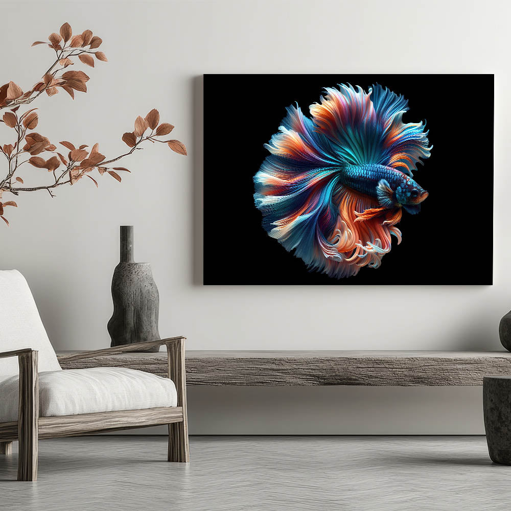Immerse yourself in the beauty of the ocean with this striking Betta fish wall art. Featuring a captivating display of color and movement, this artwork showcases the elegance of a Betta fish in full flow, with its vibrant fins creating a dynamic visual effect. This fish canvas print is an ideal choice for those looking to bring a touch of marine life into their homes, offices, or any space that needs a splash of color and life.