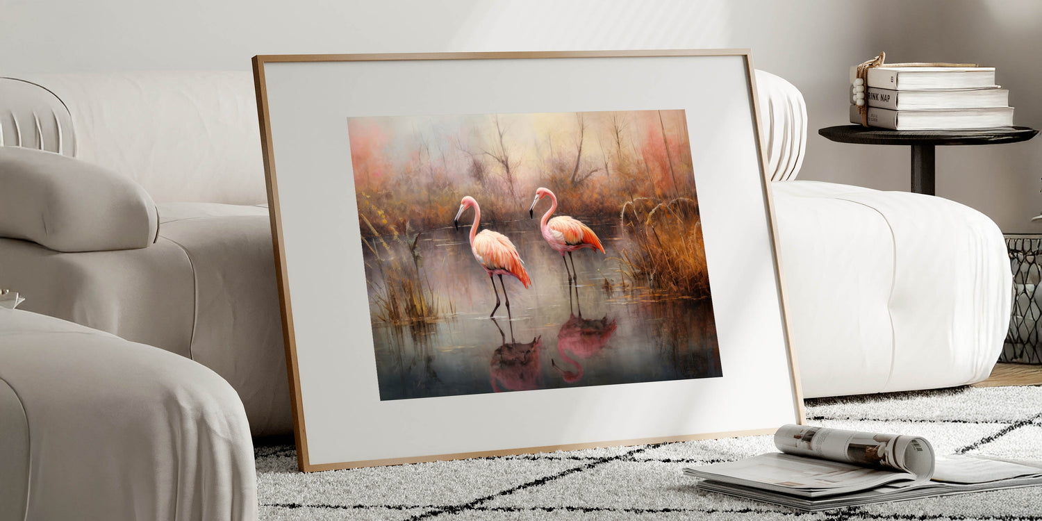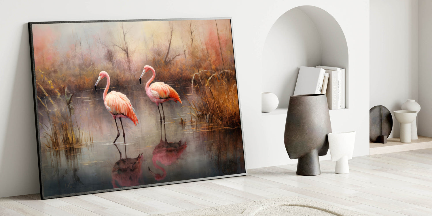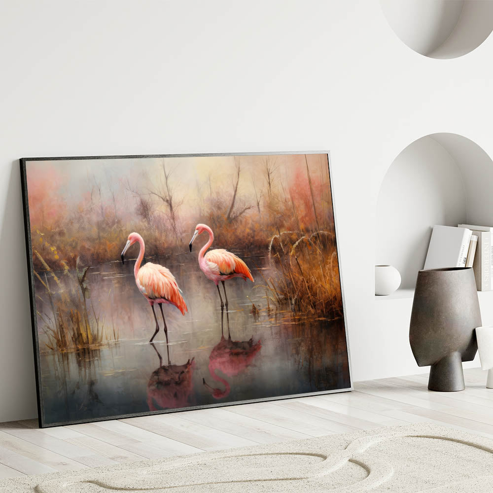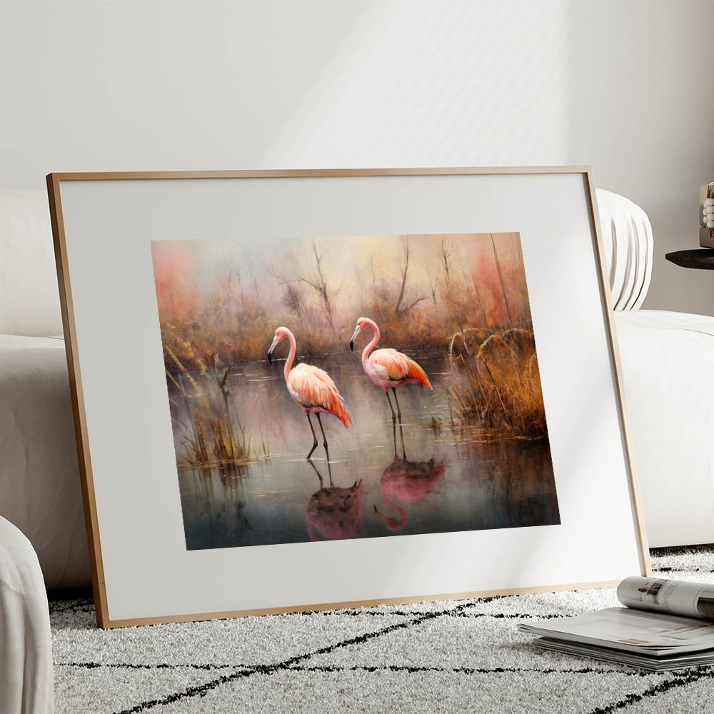 This Flamingo art print is perfect for anyone who appreciates the quiet beauty of nature and wants to bring the calming effects of autumn into their home. Its rich colors and serene composition make it a timeless piece that will add warmth and elegance to any room.