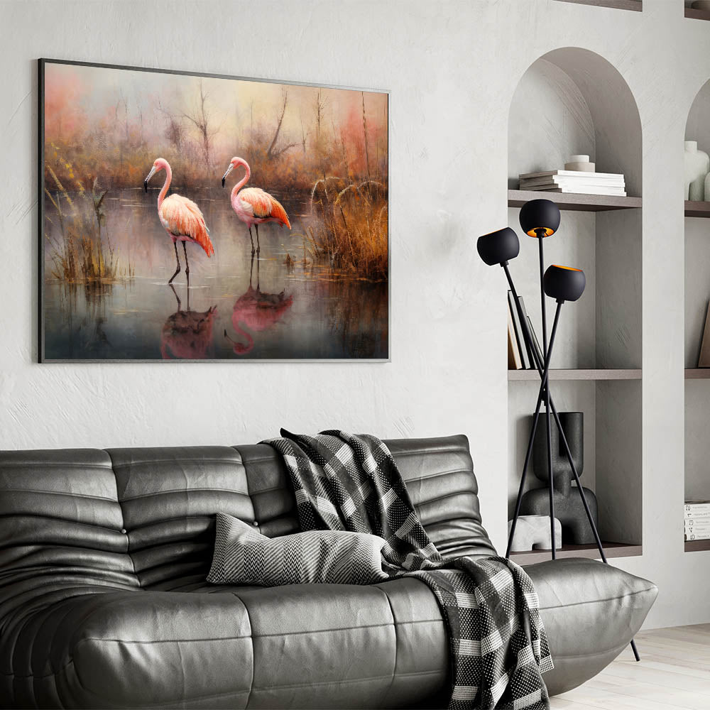 Capture the essence of a peaceful autumn day with this elegant Flamingo wall art. Featuring two flamingos wading gracefully in a tranquil pond, surrounded by warm, earthy tones of fall foliage, this artwork evokes a sense of serenity and natural beauty. The delicate balance of soft pinks and golden browns creates a harmonious and inviting atmosphere, perfect for enhancing any living space.