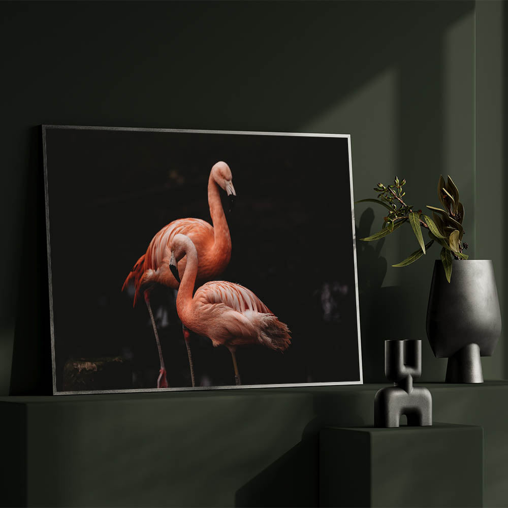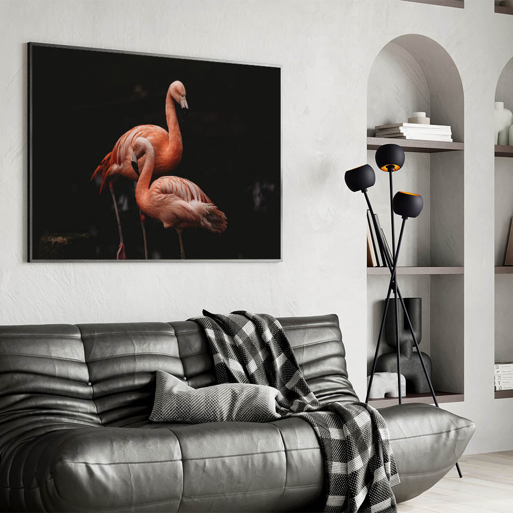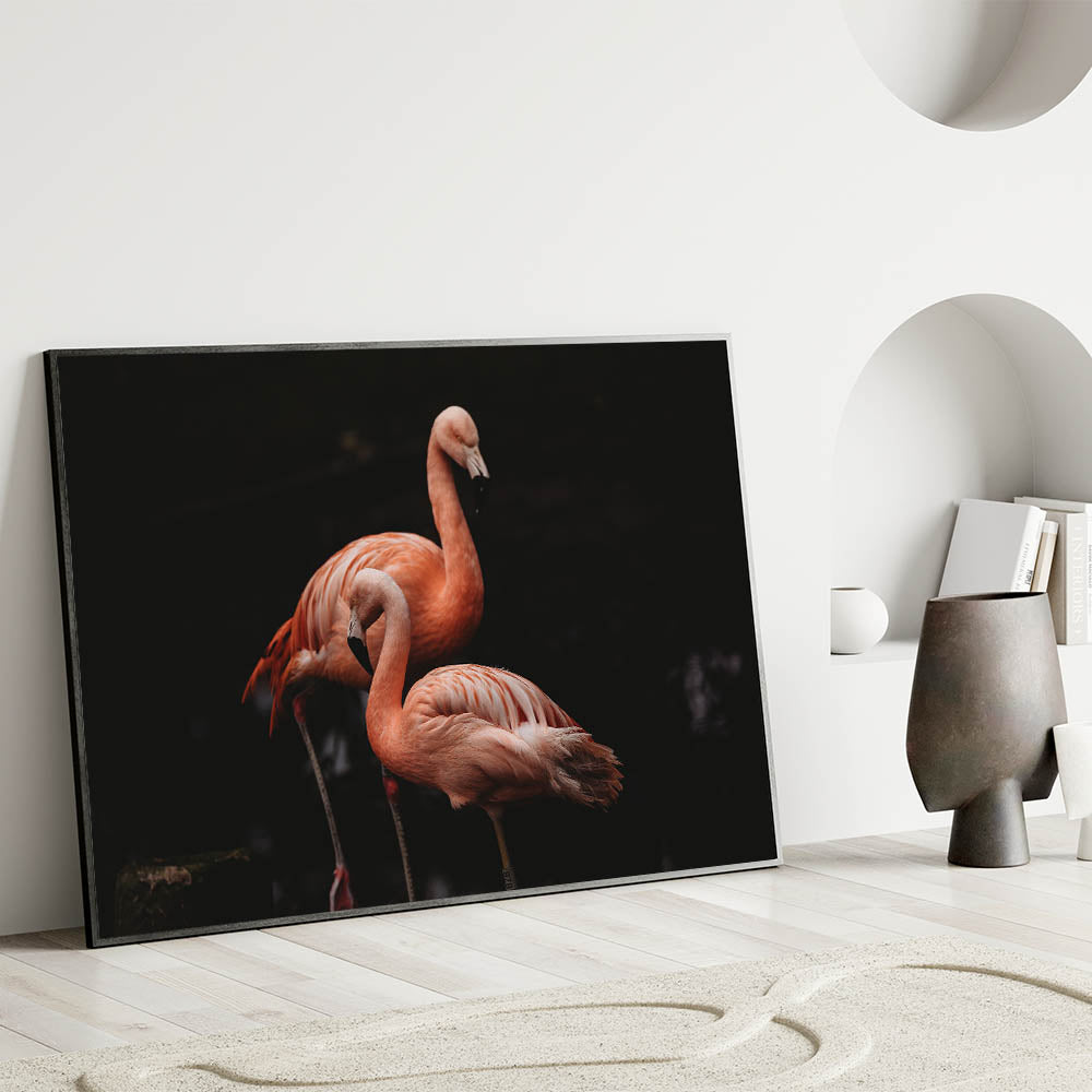 Elevate your home decor with this elegant Flamingo wall art, capturing the subtle beauty of two flamingos in a serene, dimly lit environment. The delicate pink tones of the flamingos stand out against the dark background, creating a sophisticated and tranquil atmosphere, perfect for adding a touch of elegance to any space.