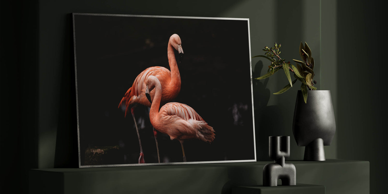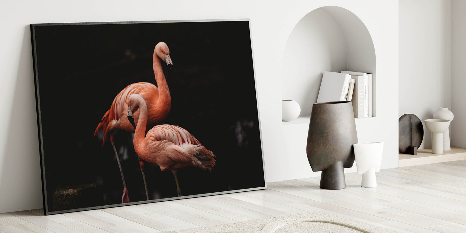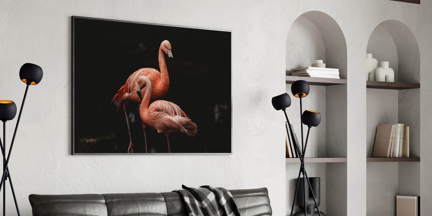 Elevate your home decor with this elegant Flamingo wall art, capturing the subtle beauty of two flamingos in a serene, dimly lit environment. The delicate pink tones of the flamingos stand out against the dark background, creating a sophisticated and tranquil atmosphere, perfect for adding a touch of elegance to any space.
