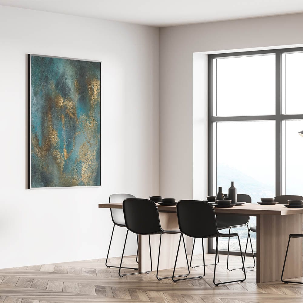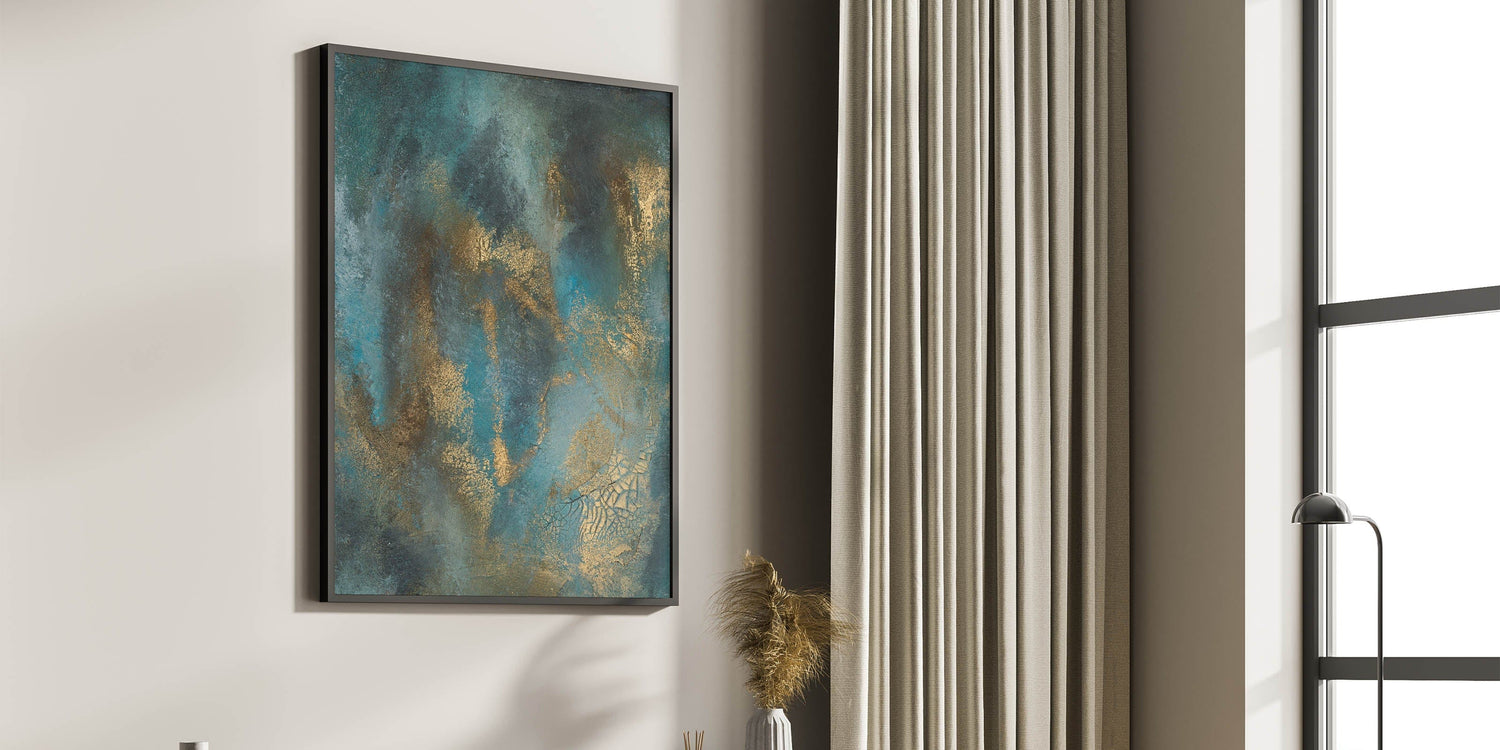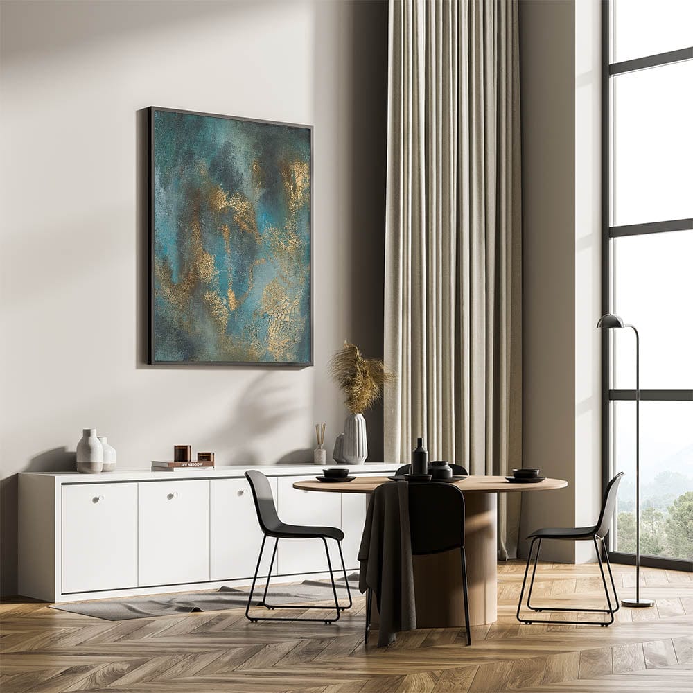 Elevate your space with this contemporary abstract art, a stunning blend of deep teal, rich gold, and textured brushwork. This moody modern wall art exudes sophistication with its fluid movement and metallic highlights, creating an elegant yet dramatic visual effect. The dynamic layering of colors adds depth, making this abstract wall art a captivating focal point in any modern interior.