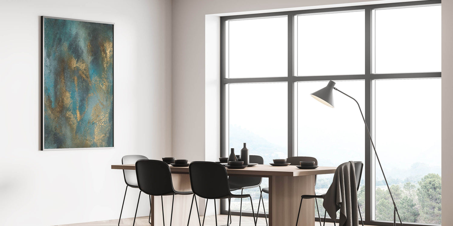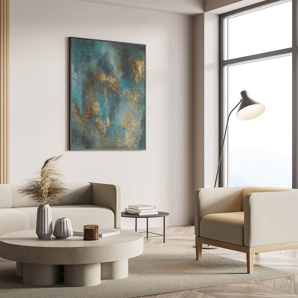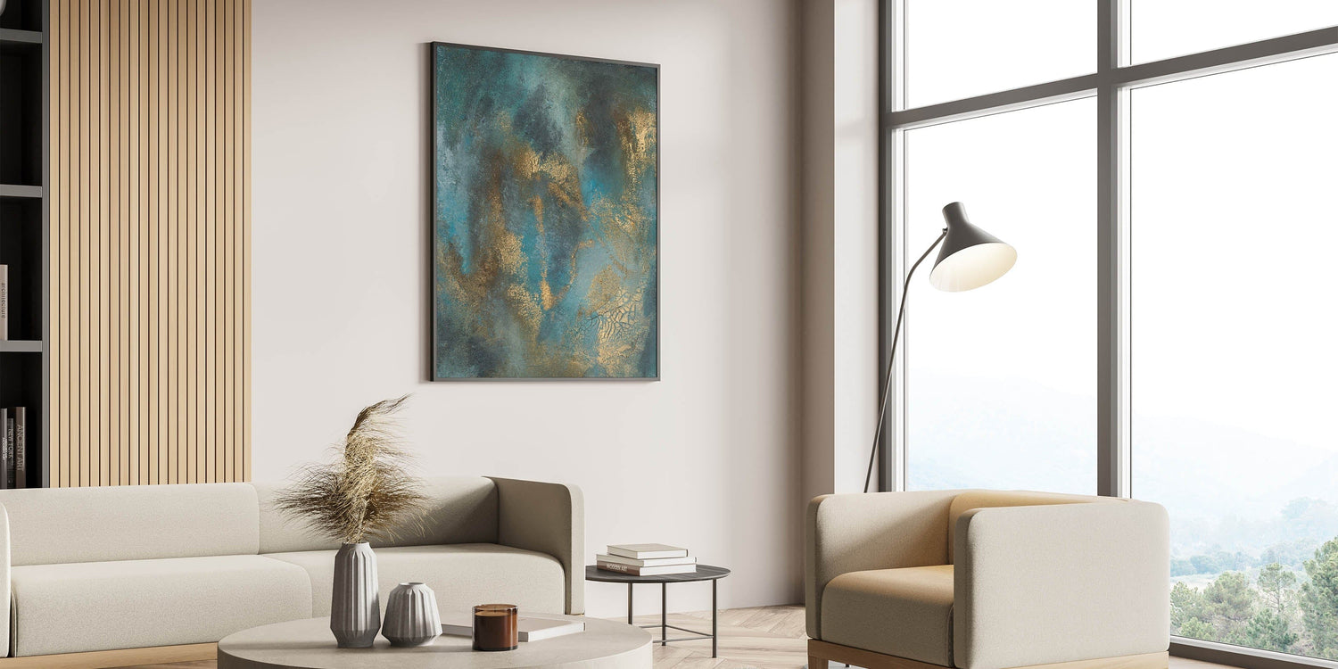 Elevate your space with this contemporary abstract art, a stunning blend of deep teal, rich gold, and textured brushwork. This moody modern wall art exudes sophistication with its fluid movement and metallic highlights, creating an elegant yet dramatic visual effect. The dynamic layering of colors adds depth, making this abstract wall art a captivating focal point in any modern interior.