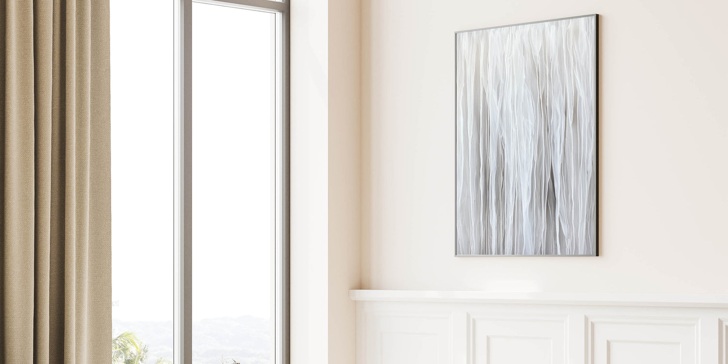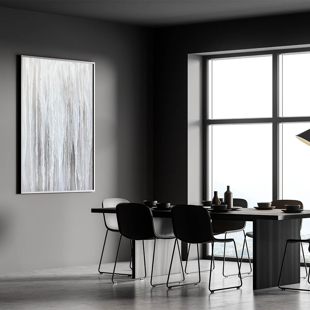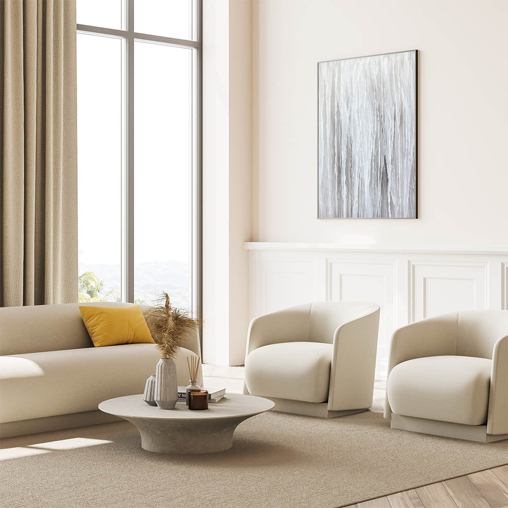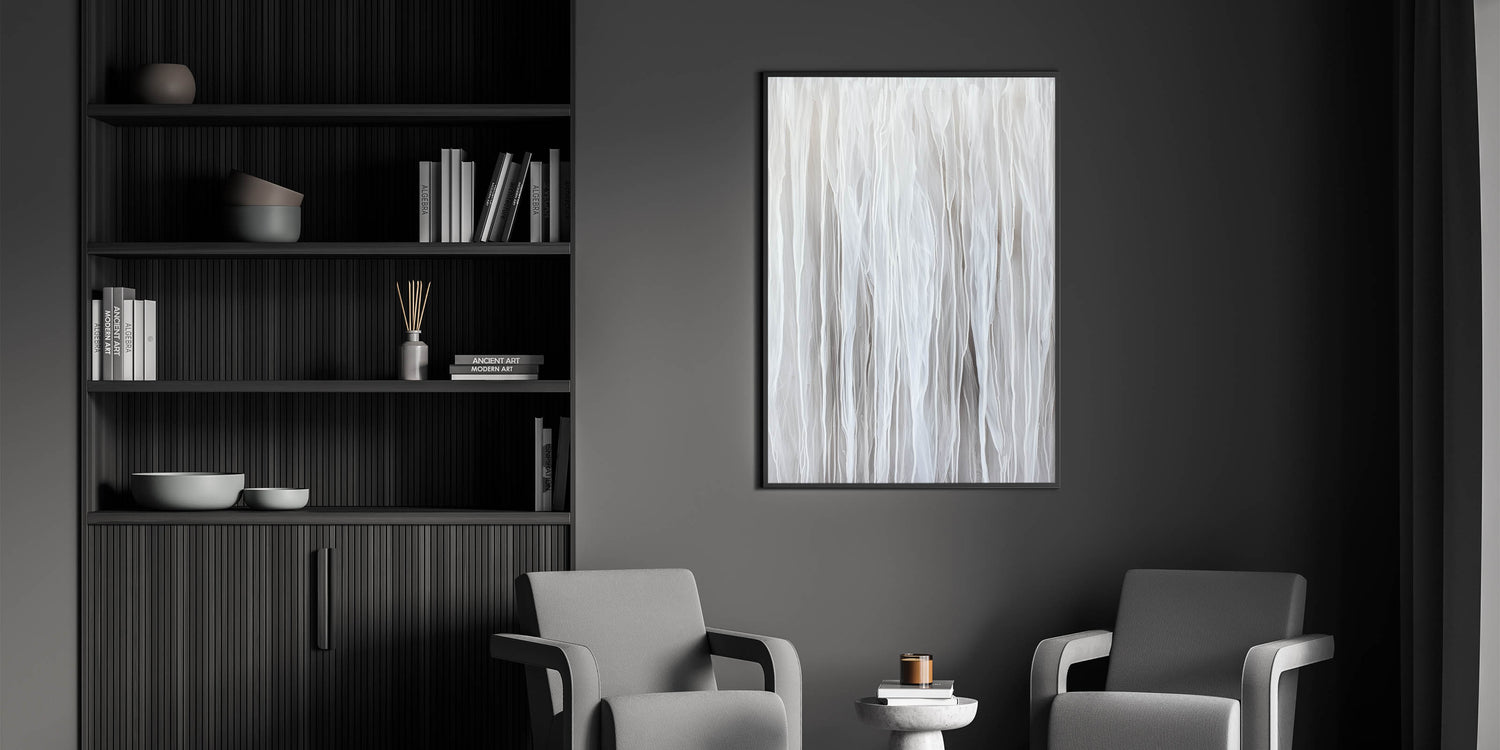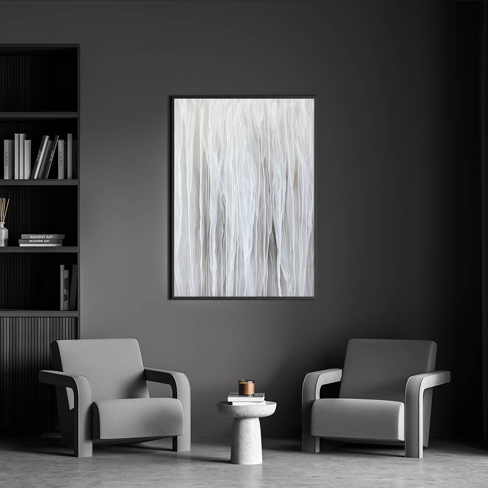 Create a serene and elegant atmosphere with this contemporary canvas print, featuring cascading white textures layered over soft gray undertones. This modern abstract wall art piece offers a delicate balance of movement and tranquility, making it a perfect choice for minimalist and contemporary interiors. The flowing, fabric-like textures evoke a sense of calm and sophistication, making it an ideal centerpiece for any space.