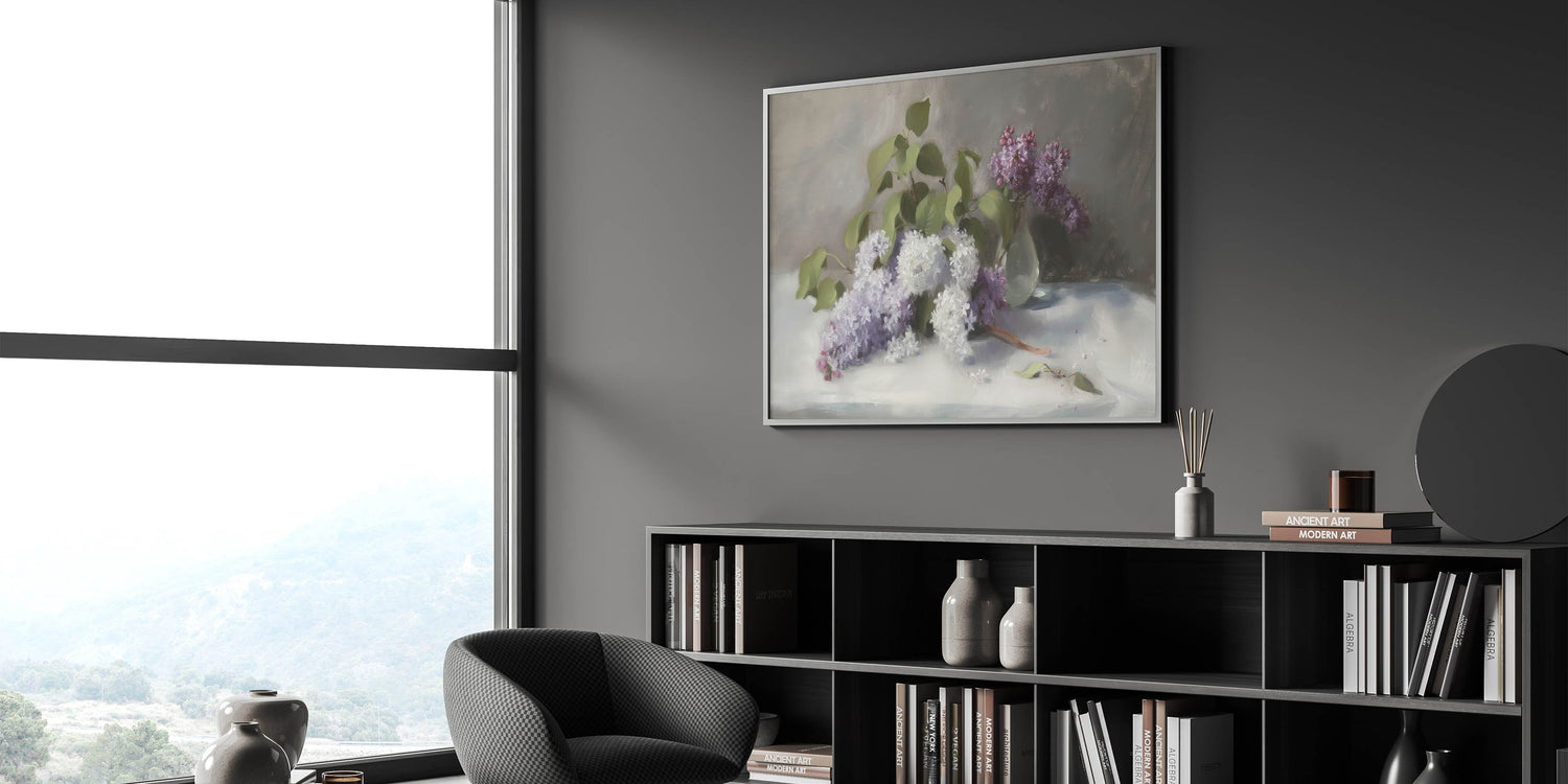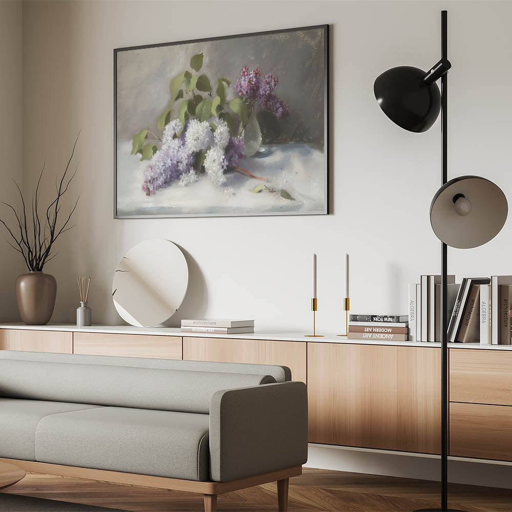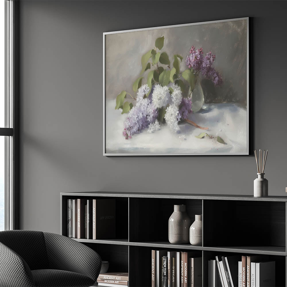 Bring timeless elegance to your décor with this exquisite floral still-life artwork. Featuring delicate lilac and white blossoms arranged with fresh green foliage, this piece evokes the serene beauty of nature. The soft brushstrokes and muted background create a harmonious balance, making it an ideal choice for classic, rustic, or modern interiors. Perfect for brightening any living space, bedroom, or office with its natural charm.