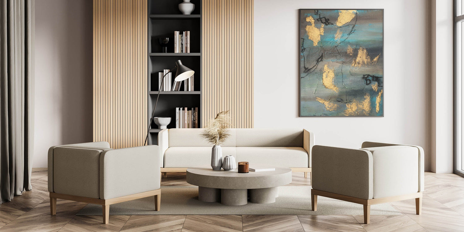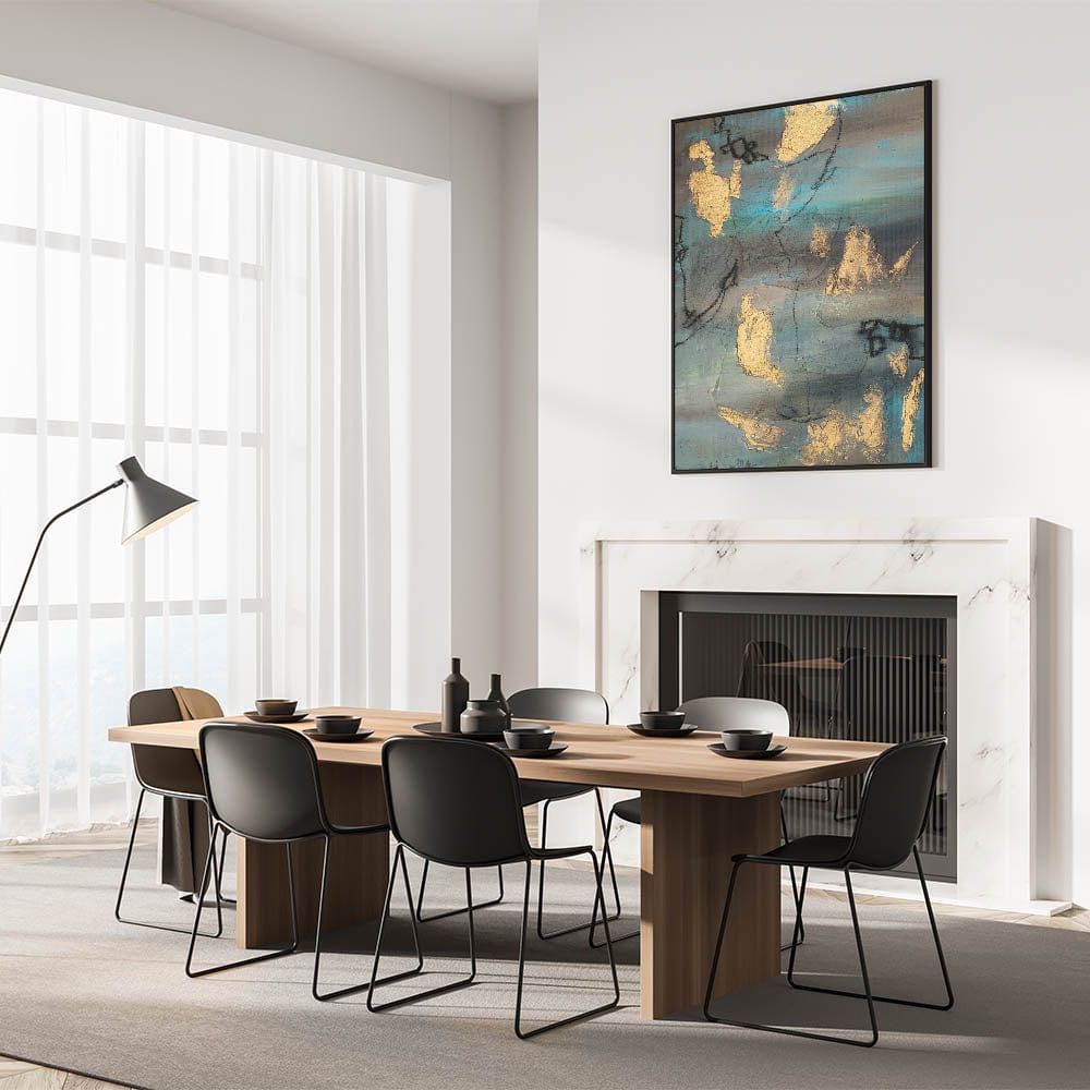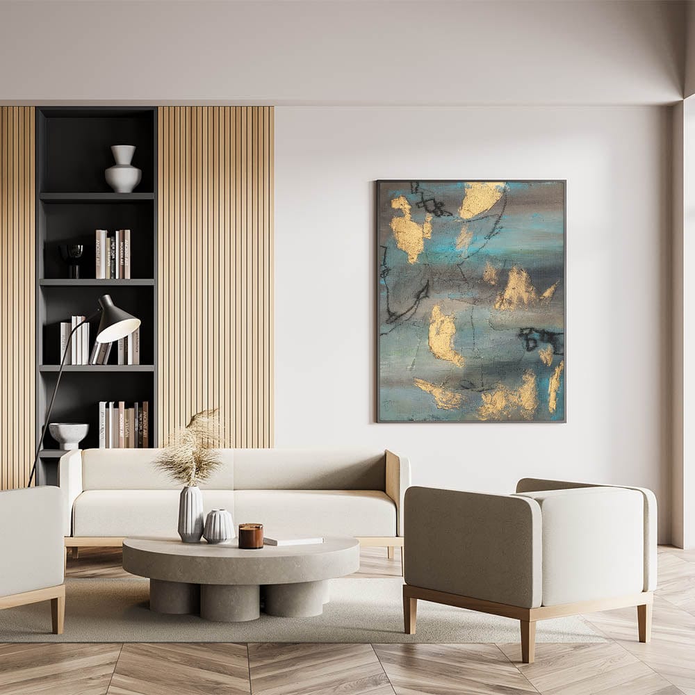 Create a refined and sophisticated atmosphere with this moody modern wall art, featuring a delicate balance of teal, gold, and gray tones. The expressive brushstrokes and textured gold accents bring depth and movement to this abstract wall art, making it a striking addition to contemporary interiors. The fluidity of colors adds a serene yet luxurious feel, perfect for modern homes, offices, or gallery-style settings.