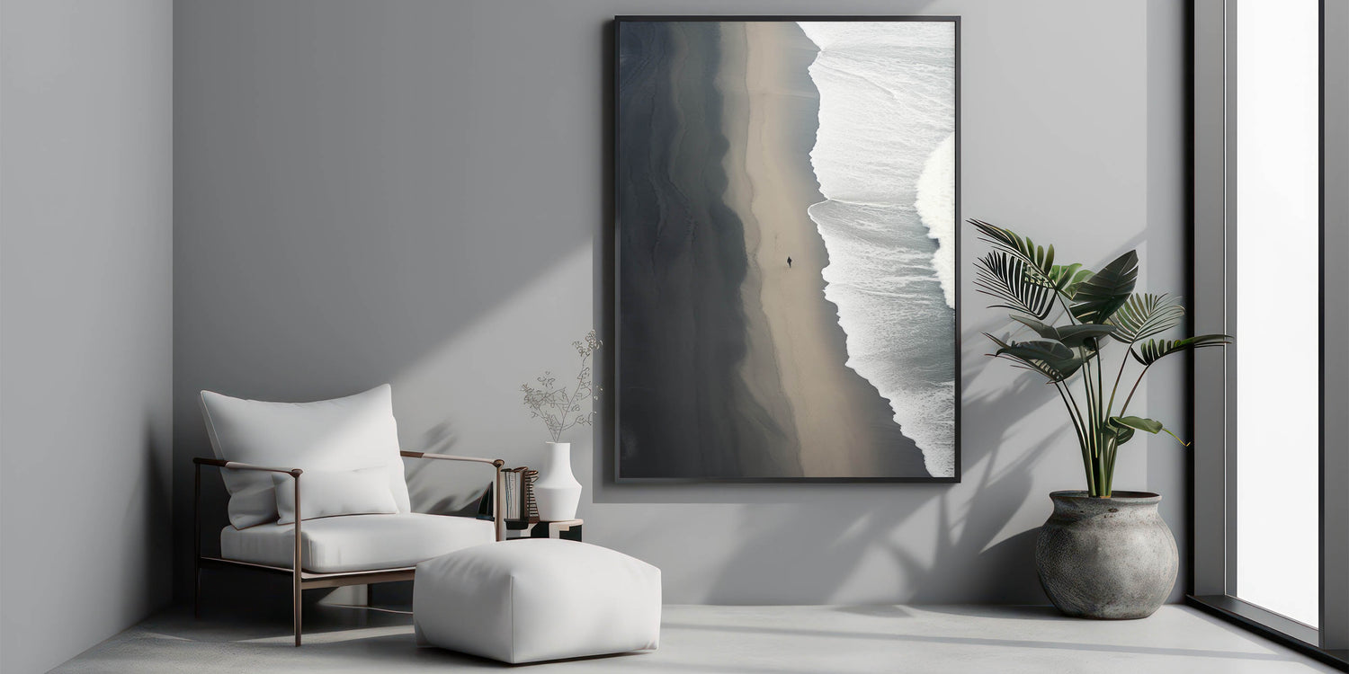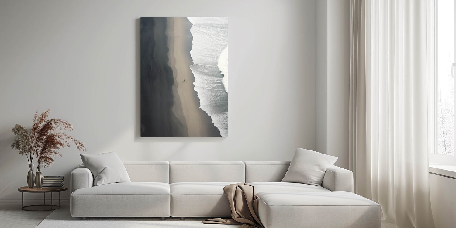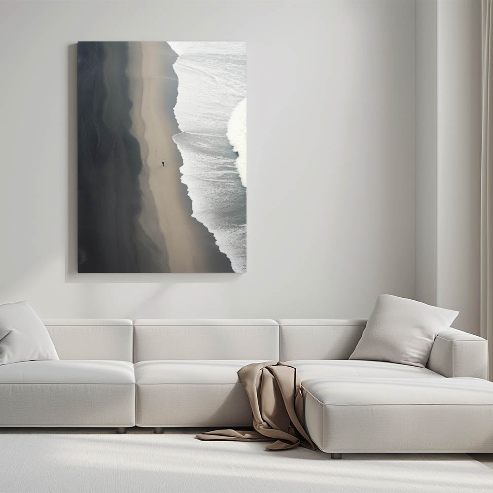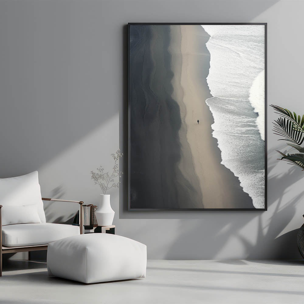 Experience the beauty of solitude with this captivating fine art photography print. An aerial perspective reveals a lone figure walking along a dramatic black sand beach, where dark, inky shores meet the foamy white waves of the ocean. The stark contrast and minimalistic composition evoke a sense of mystery, introspection, and infinite space.