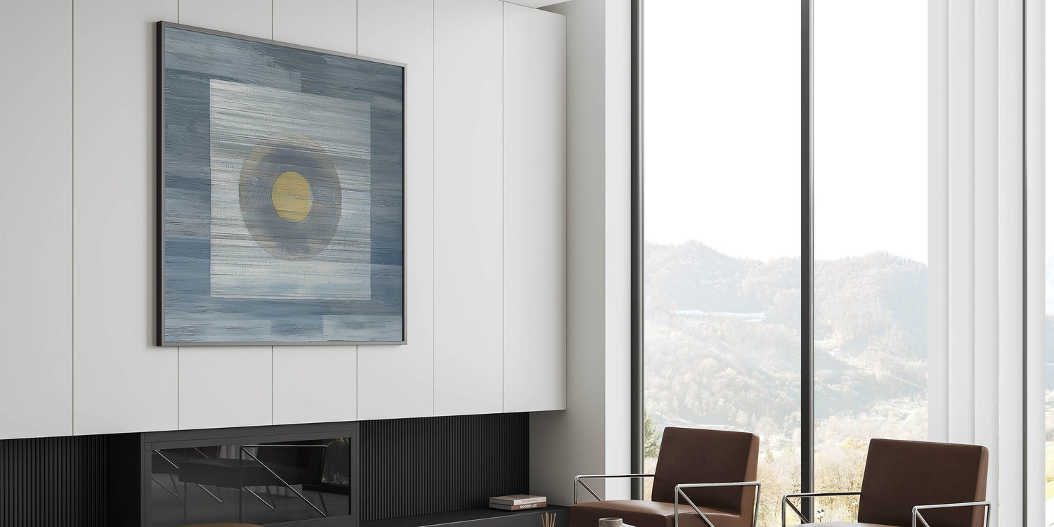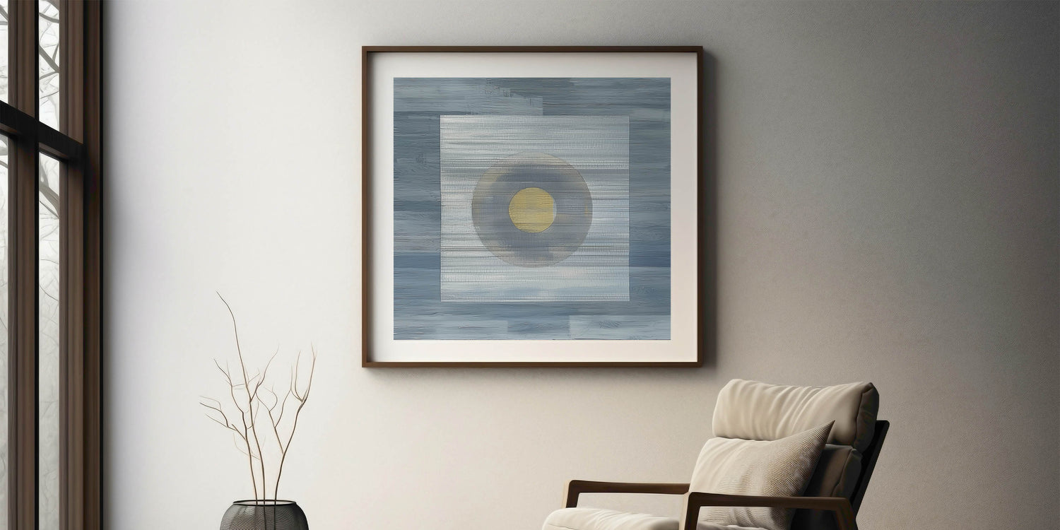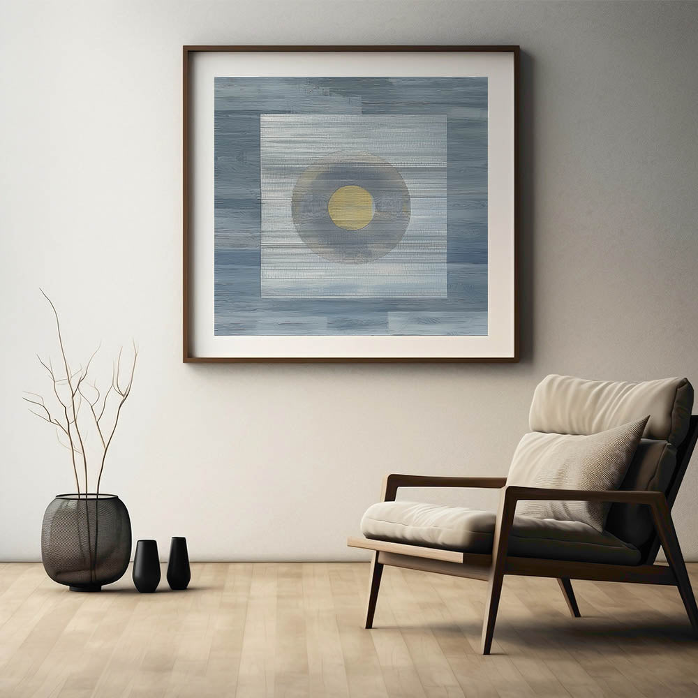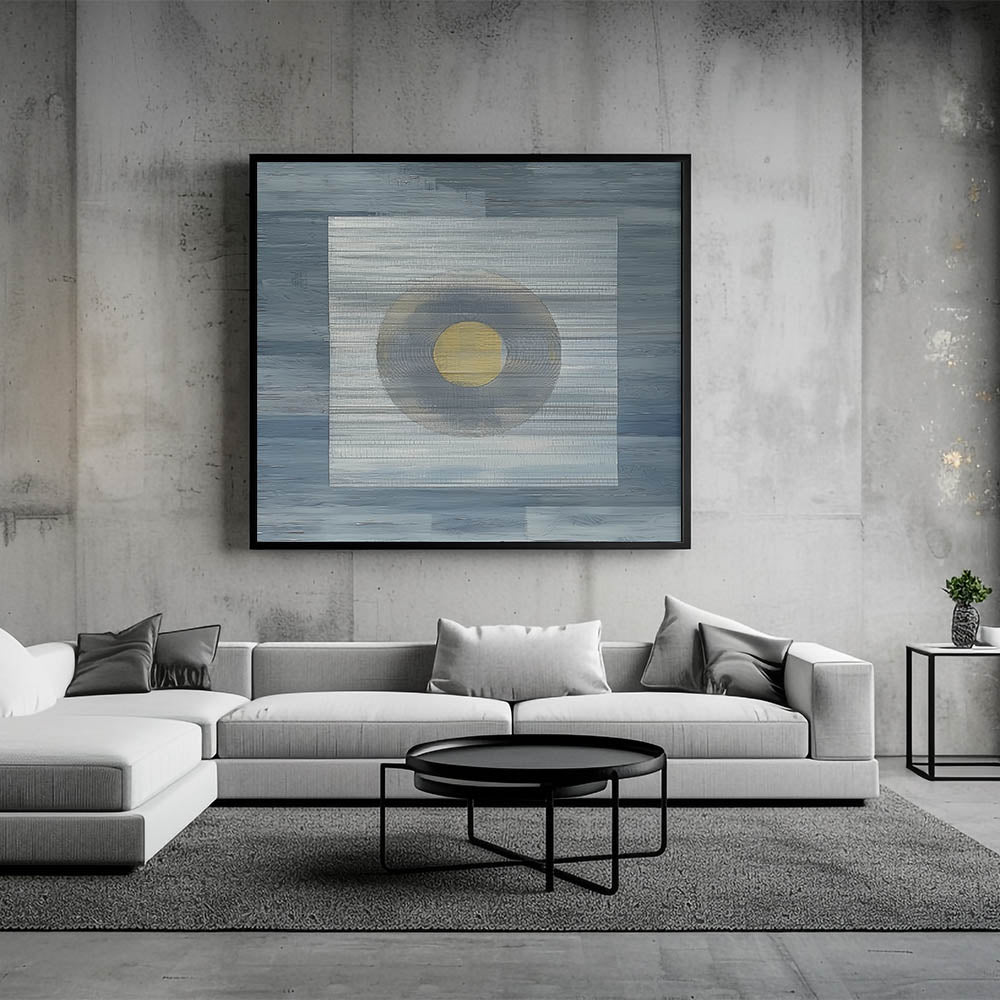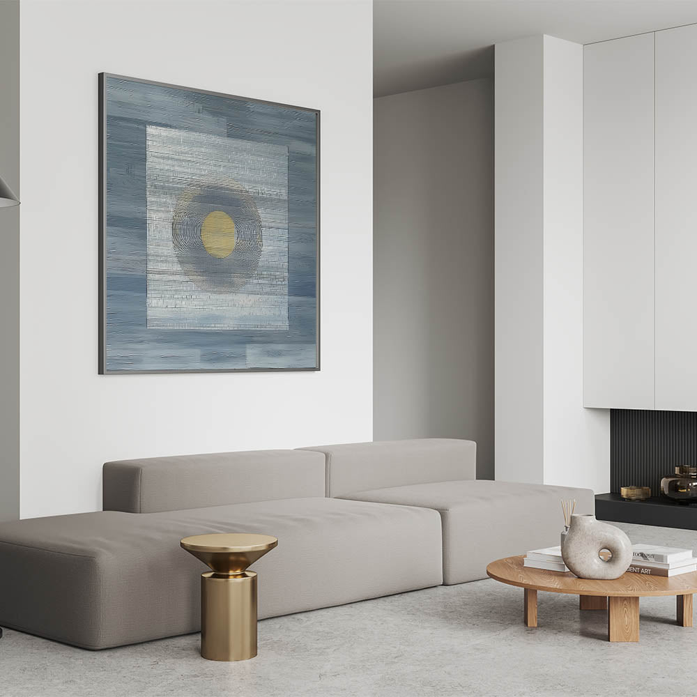 Elevate your space with this modern abstract wall art, featuring a minimalist geometric composition in deep blue, soft gray, and gold. The structured layering of textures and the central circular focal point create a mesmerizing balance of simplicity and depth. This geometric abstract painting is perfect for contemporary interiors, adding a sophisticated and artistic touch to any room.