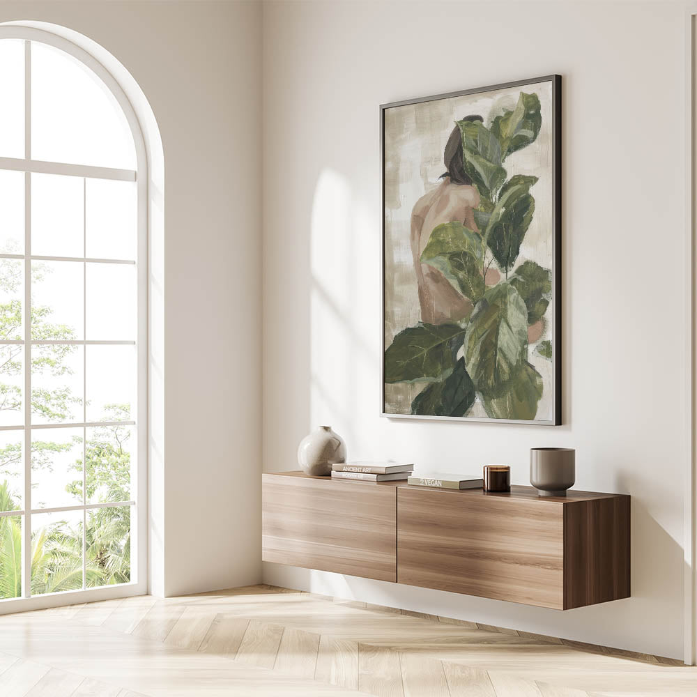 Celebrate the harmony between humanity and nature with this figurative abstract art, showcasing a graceful human figure partially concealed by lush green foliage. This nature-inspired artwork blends earthy tones and dynamic brushstrokes, creating a tranquil yet striking composition that brings the outdoors into your space.