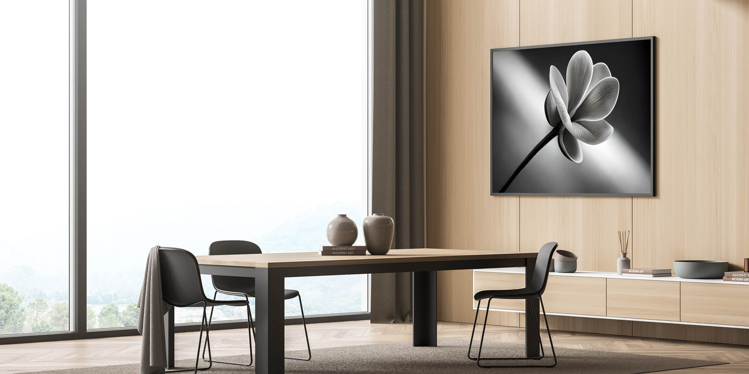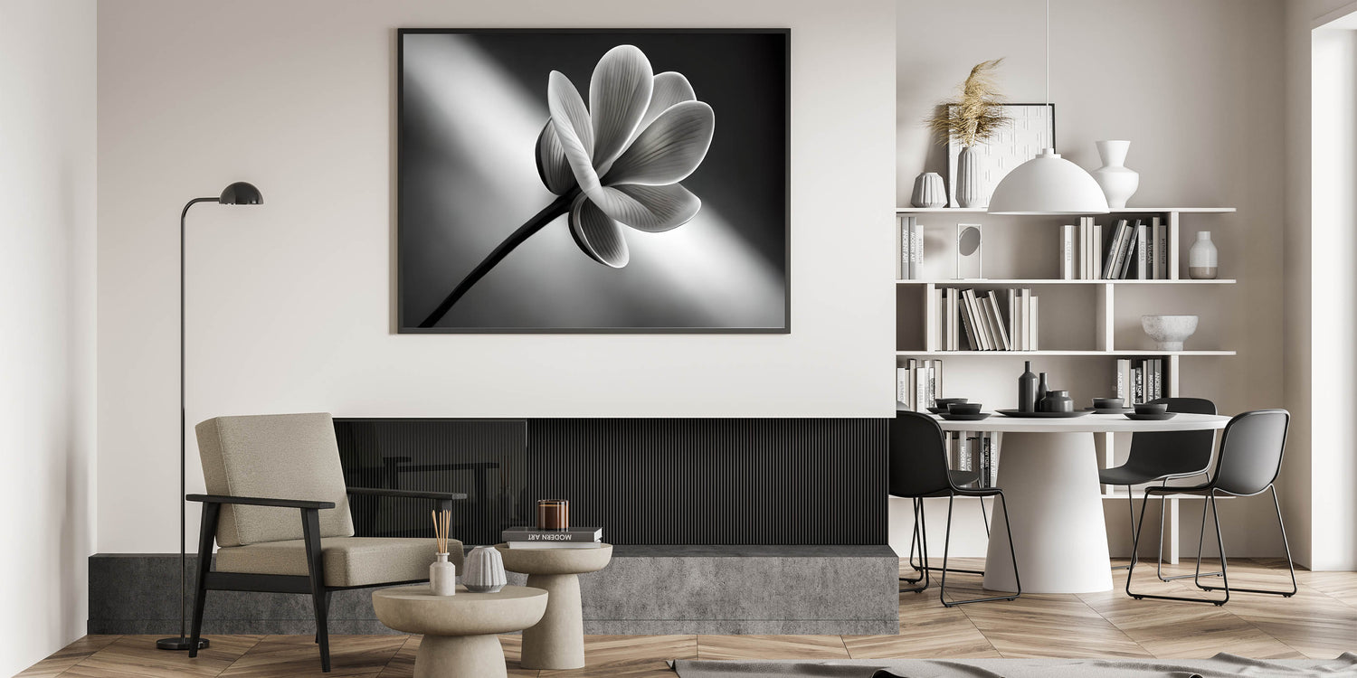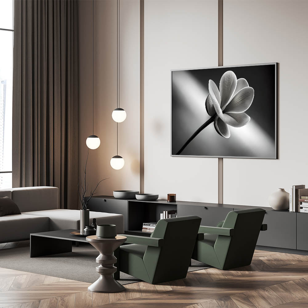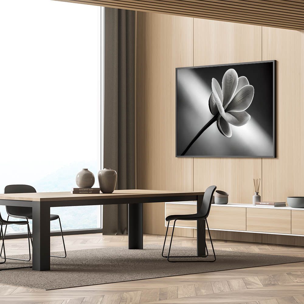 Add a touch of timeless elegance to your home with this monochrome floral wall art. Featuring a stunning close-up of a flower in sleek black and white tones, this artwork brings a sophisticated and minimalist aesthetic to any room. Perfect for modern and contemporary spaces, this nature-inspired piece is available in premium materials like stretched canvas, framed acrylic glass, and more.