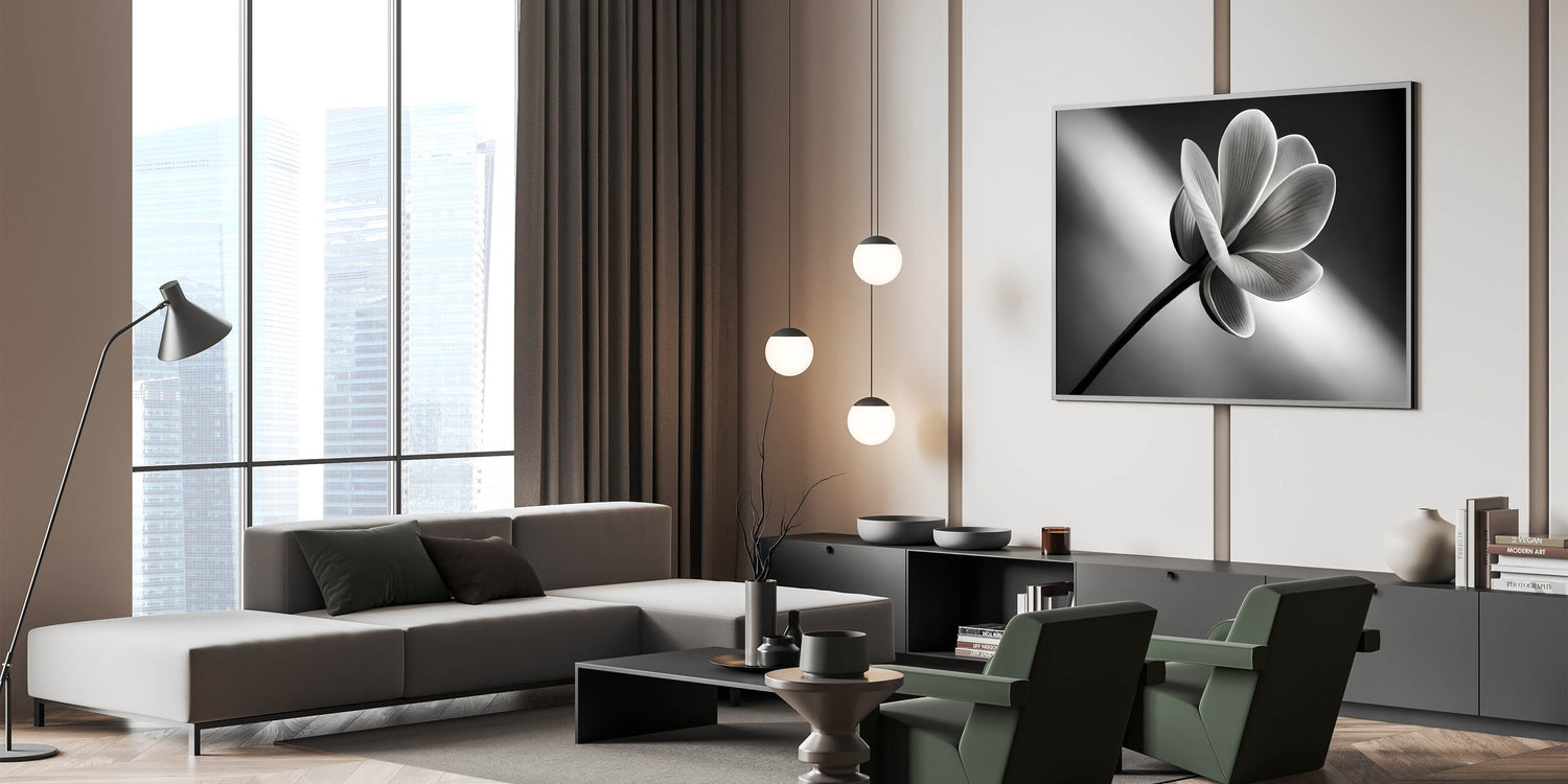 - Elegant Monochrome Design: The black and white floral close-up offers a clean, minimalist look, making it perfect for a modern interior.