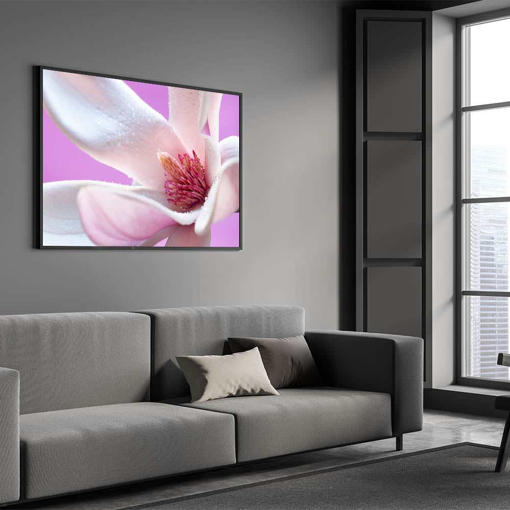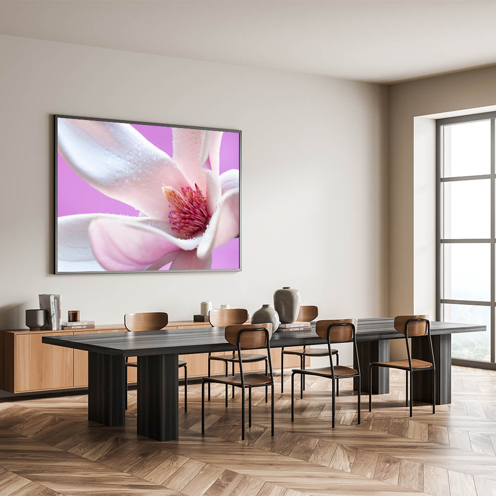 Breathe life into your home with this vibrant floral wall art, featuring a stunning close-up of a blooming magnolia. The delicate pink petals, contrasted against a bold background, highlight the intricate details of this magnificent flower. Perfect for nature lovers, this flower canvas art is a versatile addition to any room—whether you're looking to refresh your living room, bedroom, or office space.