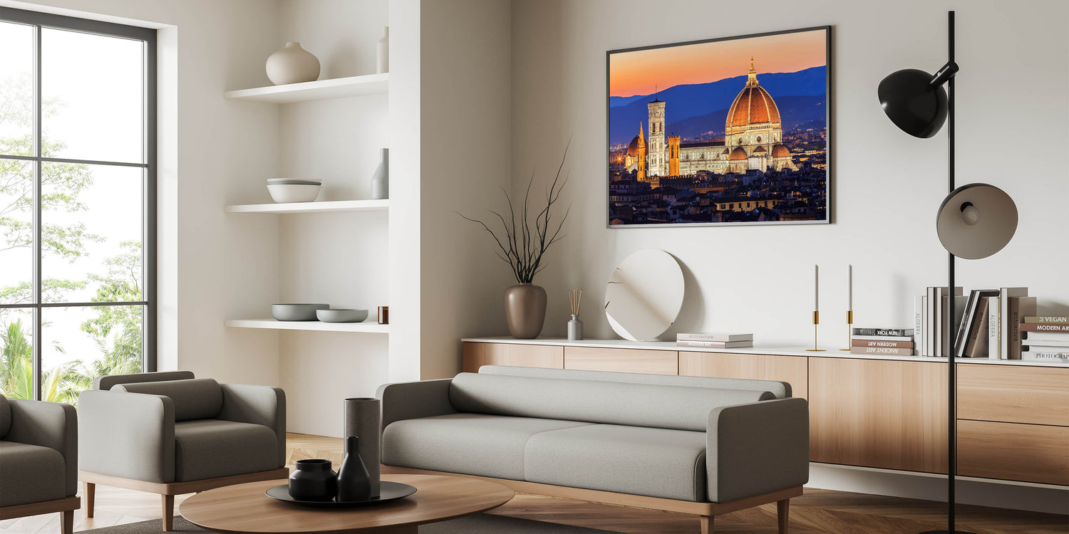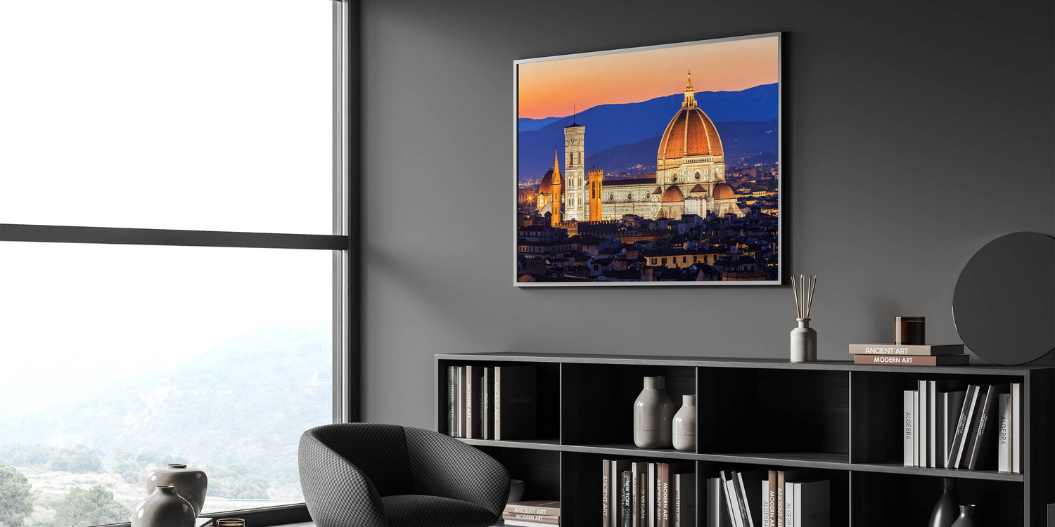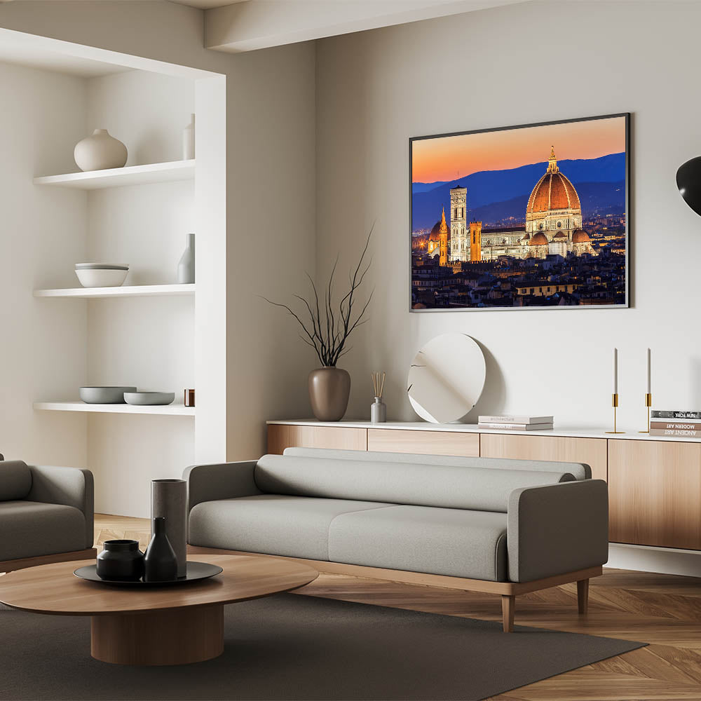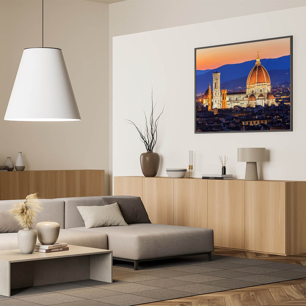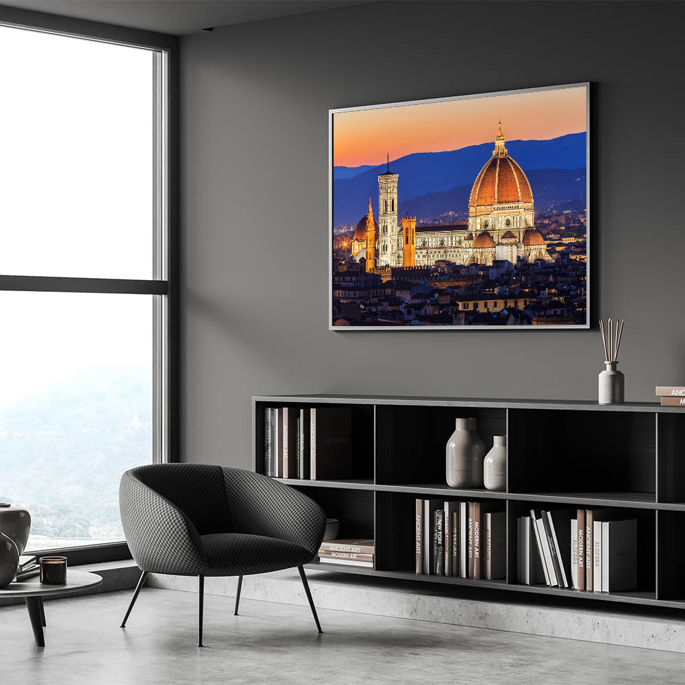 Illuminate your home with the timeless beauty of Florence captured in this high-quality Florence wall art featuring the iconic Duomo at dusk. This Florence canvas print beautifully portrays the city's glowing architectural marvel against the backdrop of a vibrant sunset, making it an exquisite piece of Italian landscape art. Perfect for anyone who loves the rich history and artistry of Florence cityscape painting, this artwork brings the magic of Italy into your living space.
