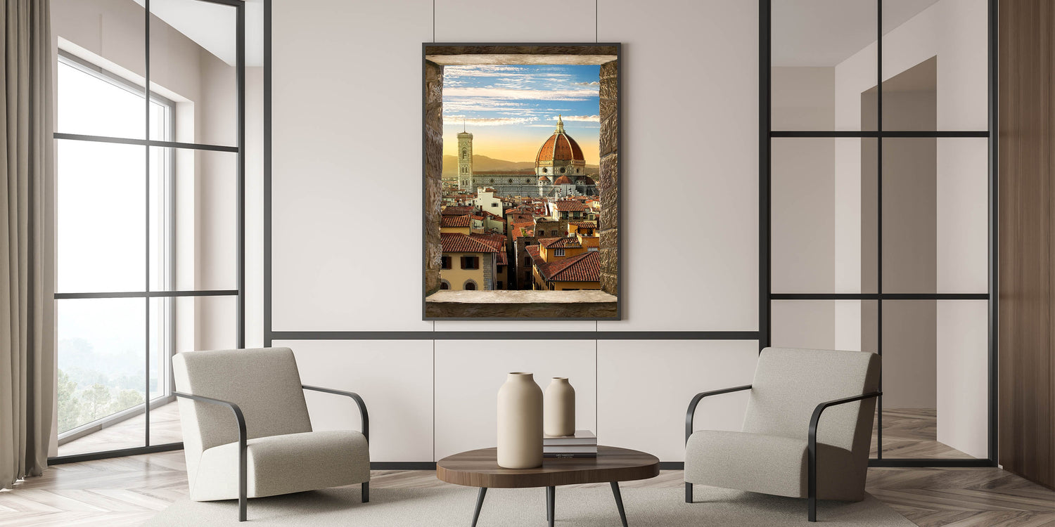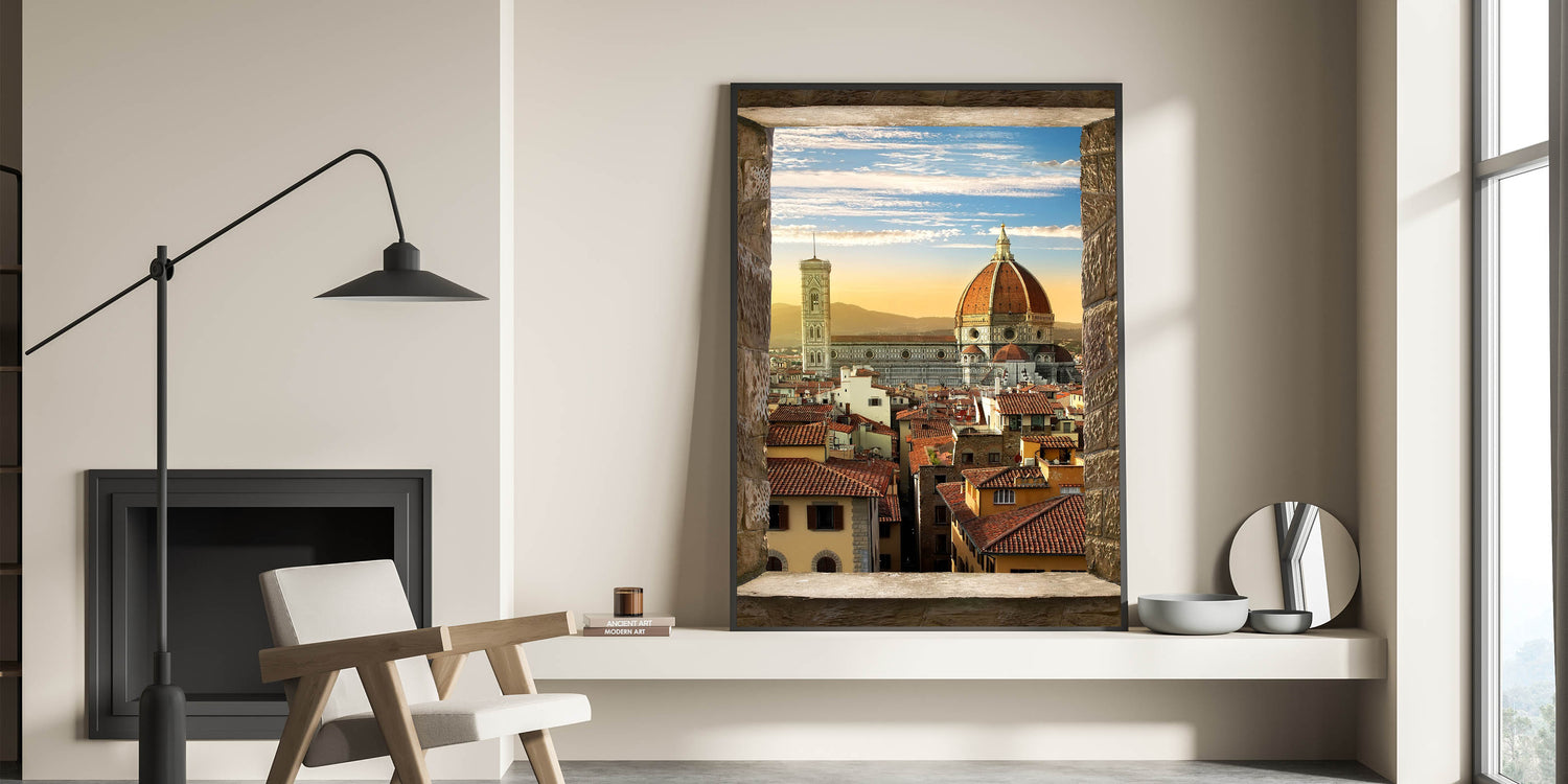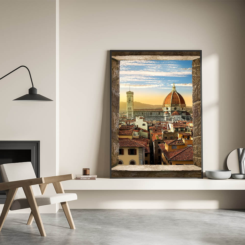 Step into the heart of Florence with this stunning high-quality Florence wall art, featuring a unique perspective of the Duomo through a rustic stone archway. This Florence canvas print highlights the charm of the city's historic architecture, with the warm hues of the Italian landscape as a perfect backdrop. This Italian landscape art will bring an artistic and cultural touch to your home décor, making it ideal for fans of Tuscany artwork.