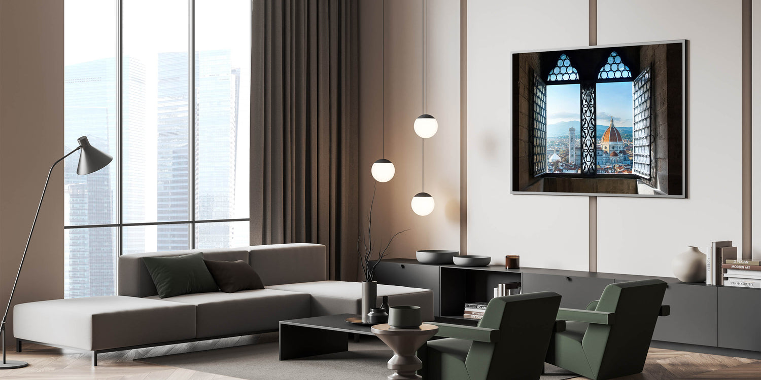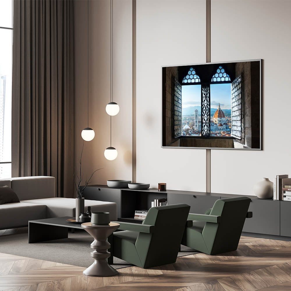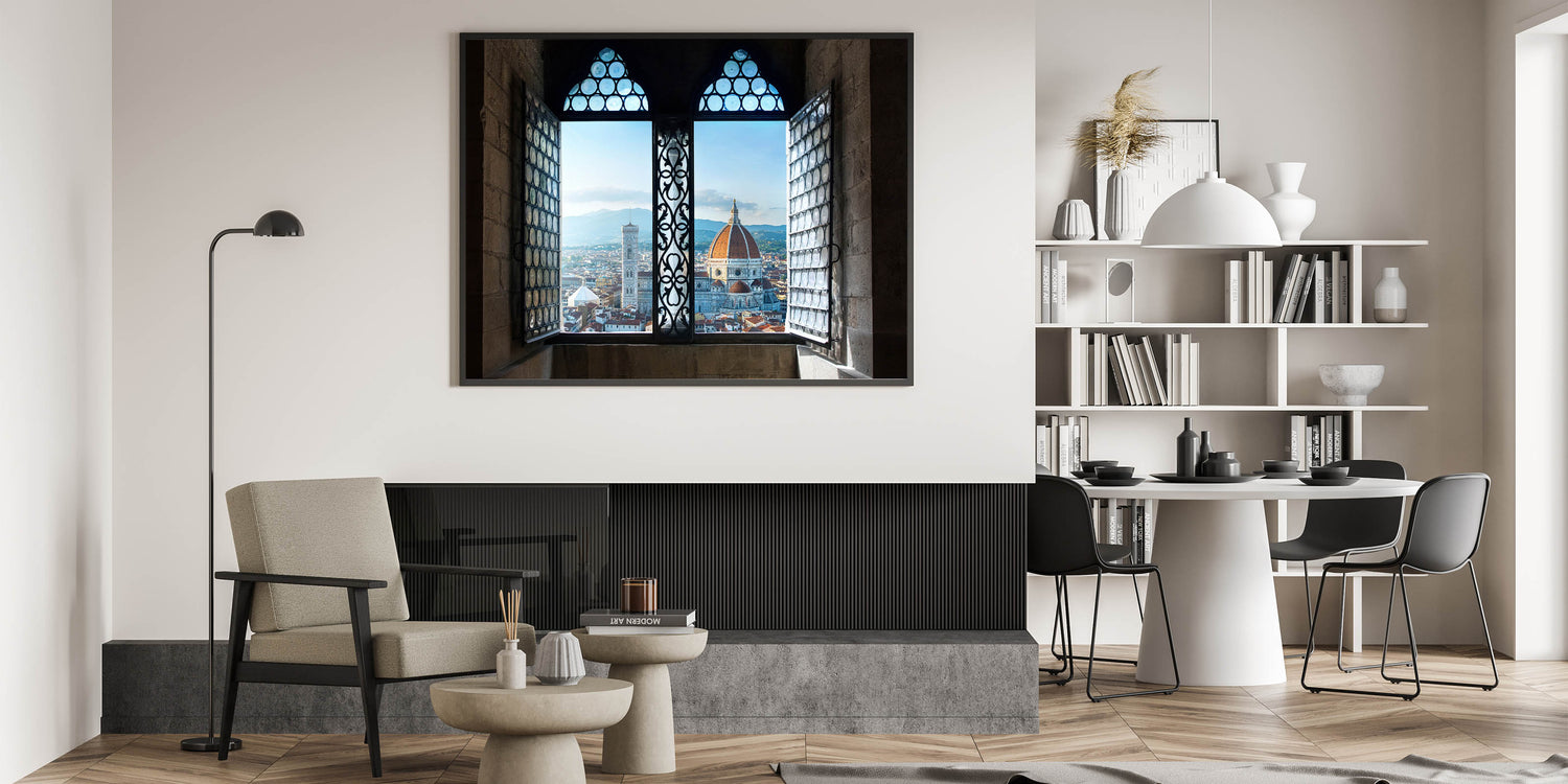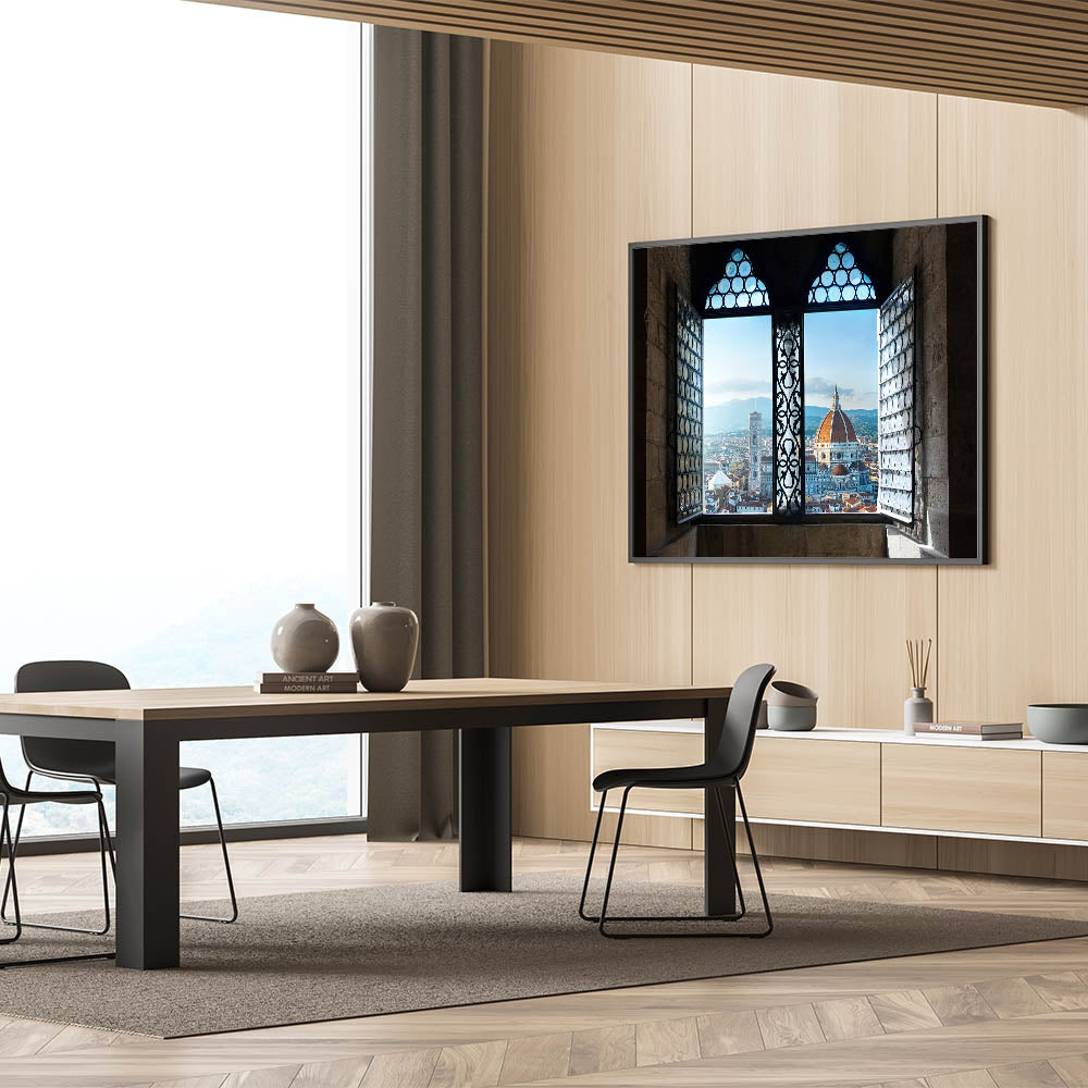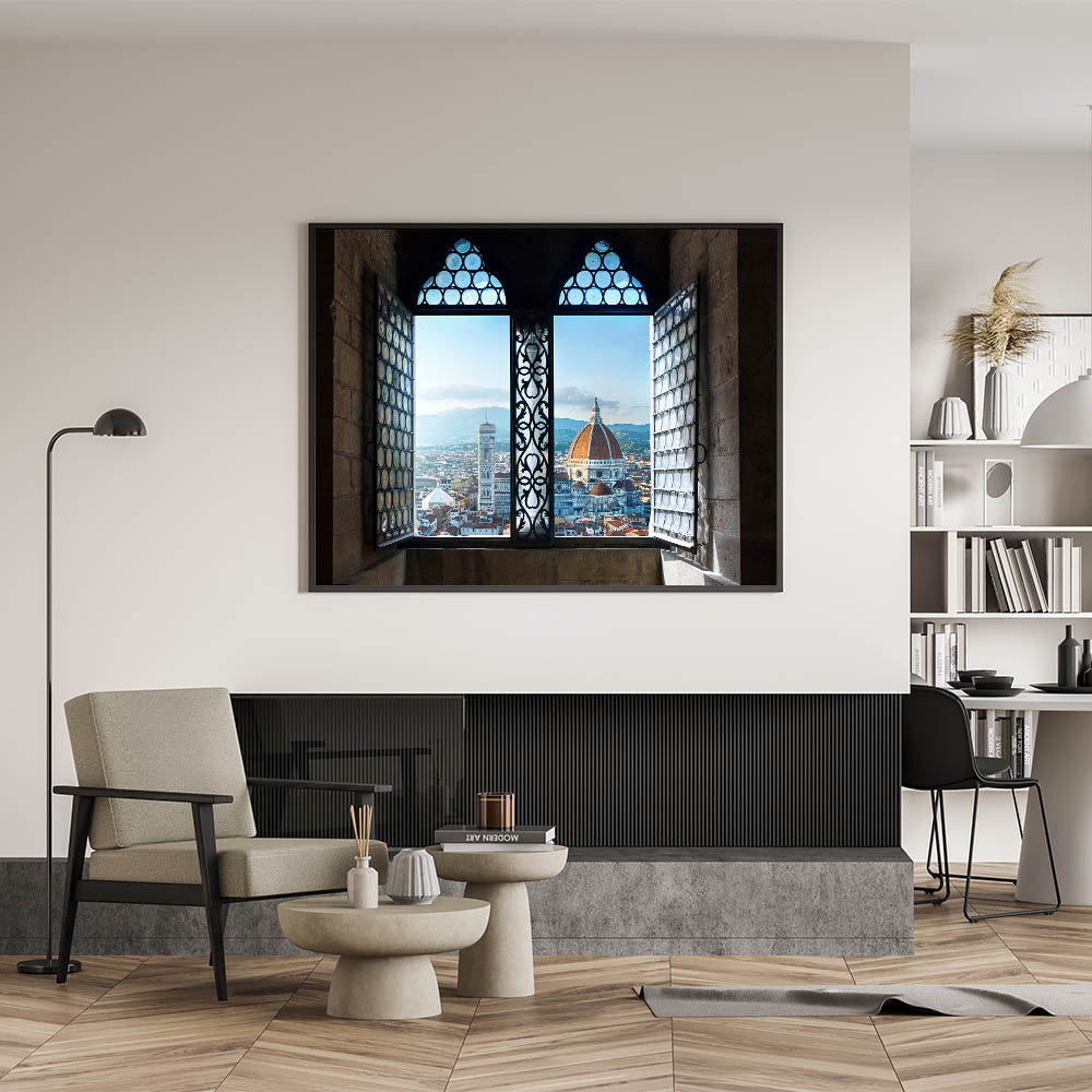 This unique Florence cityscape painting offers a stunning view of the Florence Duomo framed through a beautiful historic window. Capturing the heart of Florence, this Florence canvas print showcases the city’s architectural grandeur with an intimate perspective. The intricate details of the window design blend seamlessly with the city’s iconic skyline, making this artwork a striking piece for any lover of Italian landscape art and Tuscan charm.