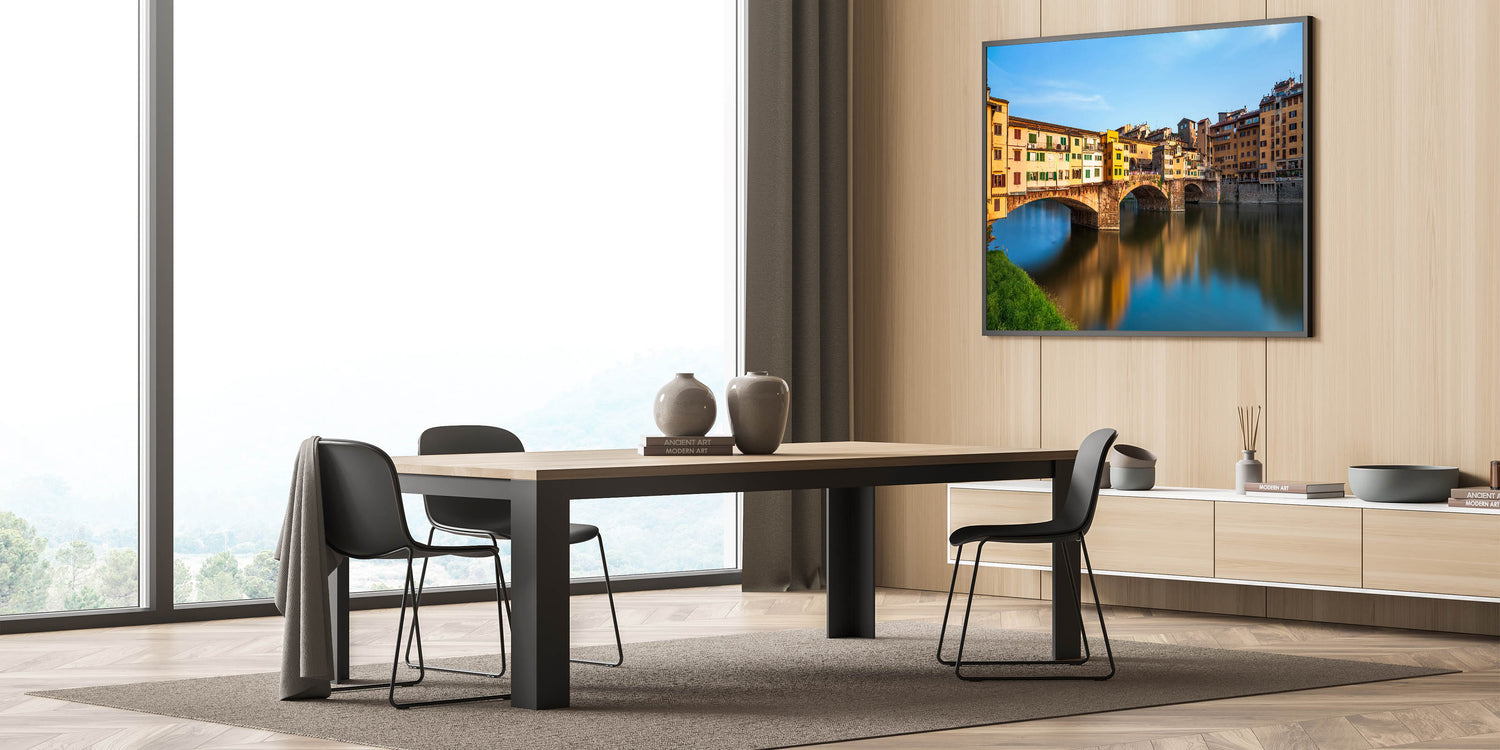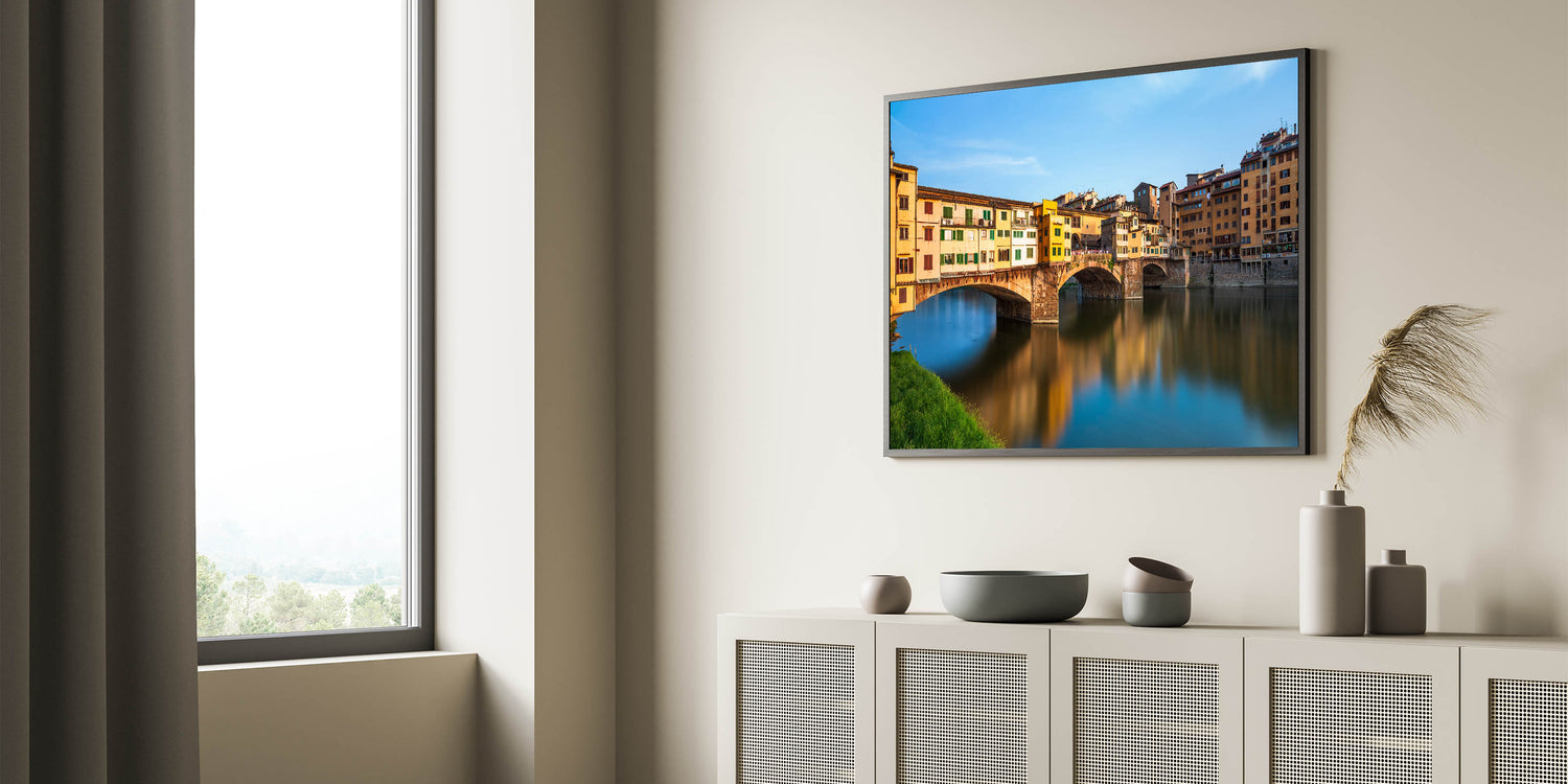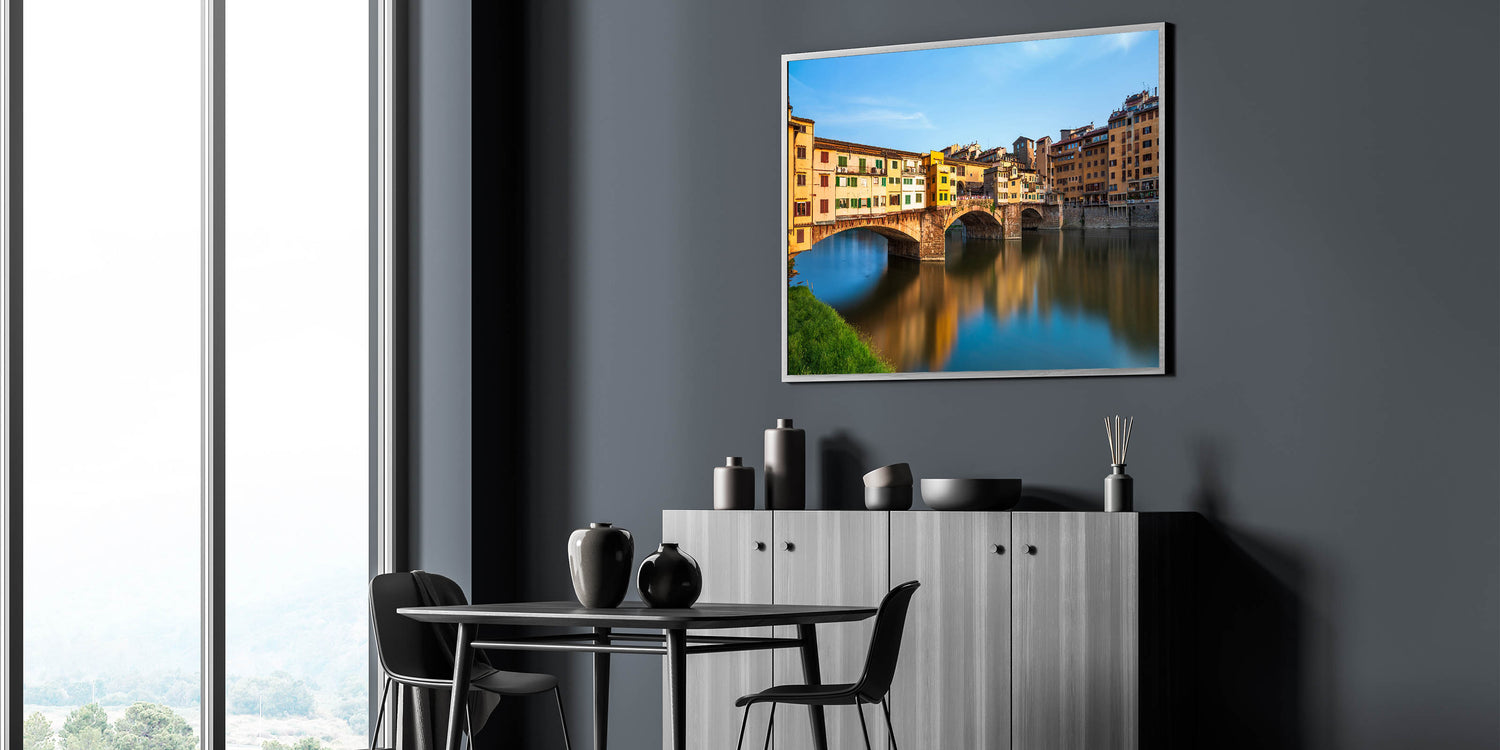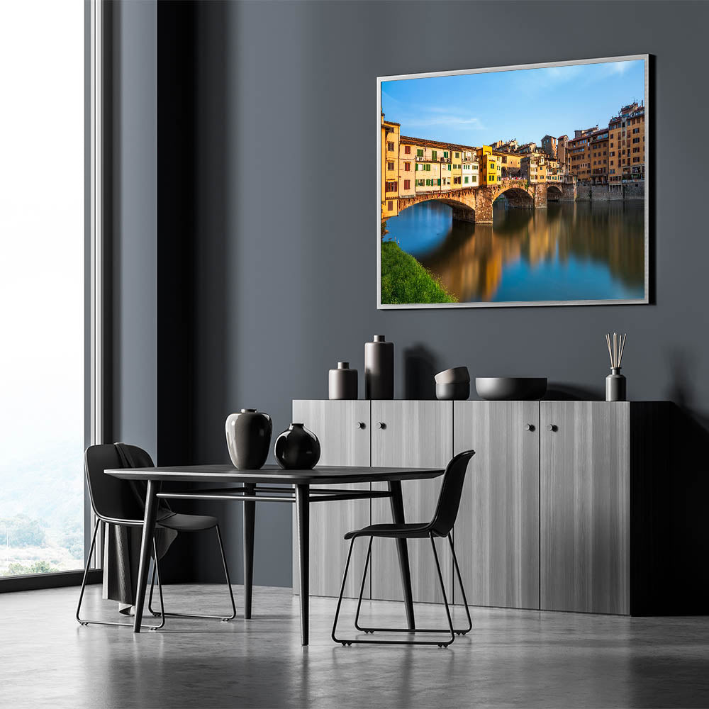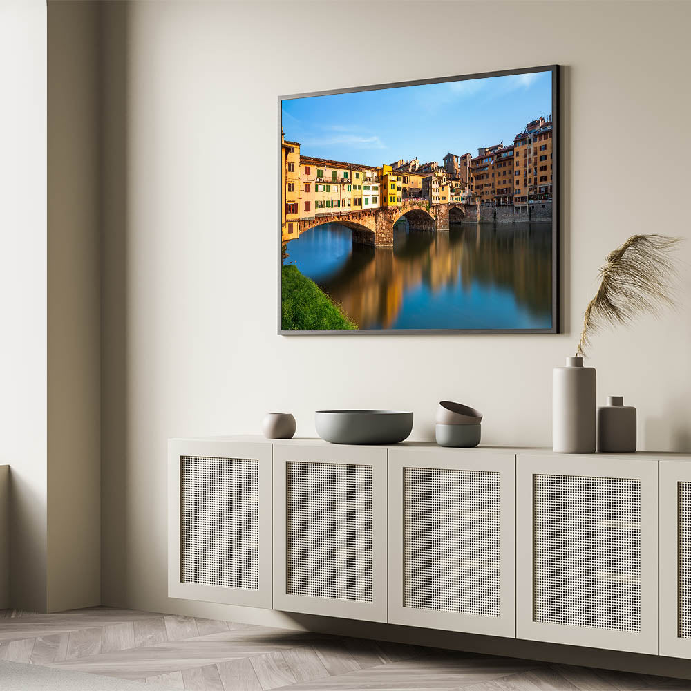 This vibrant Florence cityscape painting features the iconic Ponte Vecchio, a historic bridge in the heart of Florence. The lively colors of the buildings reflecting on the Arno River bring the warmth and charm of Tuscany into your home. This Florence canvas print offers a perfect balance of history, architecture, and natural beauty, making it a must-have for lovers of Italian landscape art.