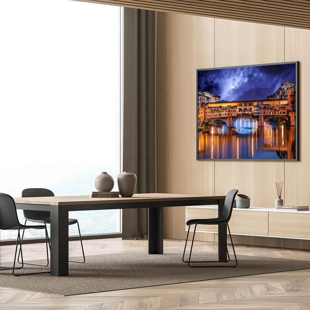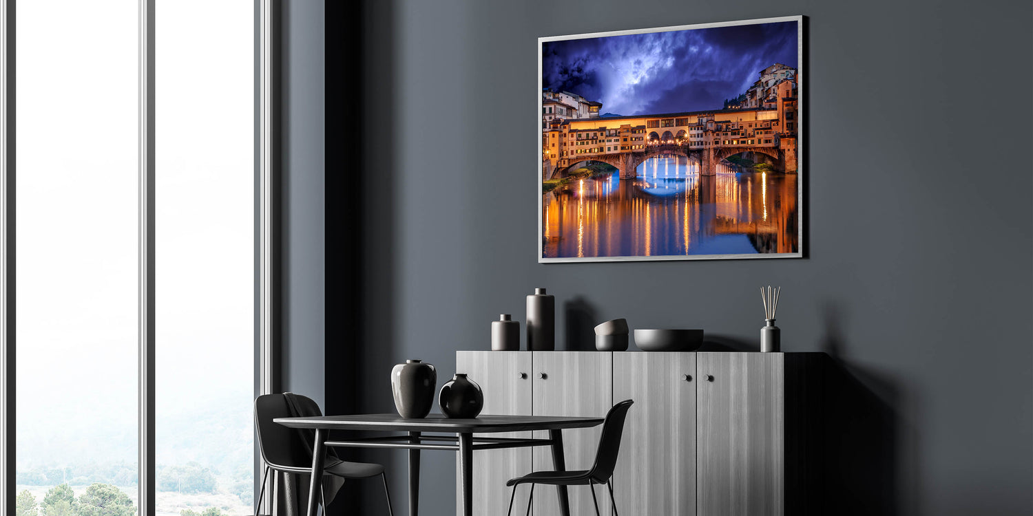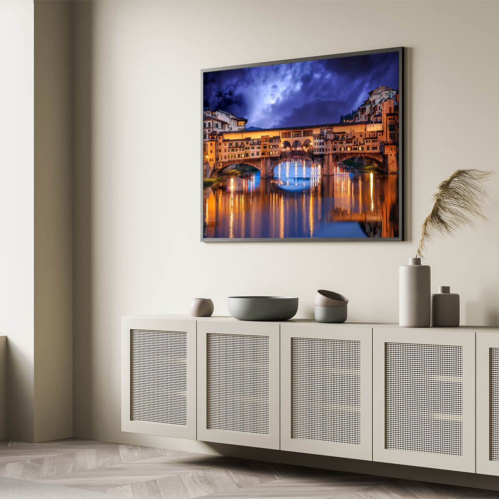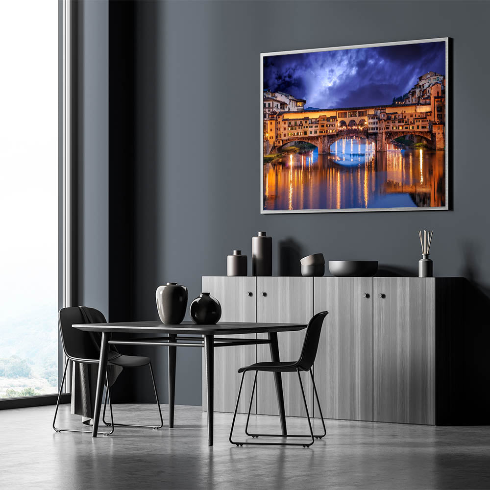 Capture the magic of Florence at night with this stunning high-quality Florence wall art featuring the iconic Ponte Vecchio bridge. The vibrant lights reflecting on the Arno River make this artwork an eye-catching piece of Florence skyline canvas that brings the enchanting atmosphere of Italy into your home. Perfect for those who appreciate architectural beauty and Italian history, this art print of Florence, Italy offers a unique way to showcase one of the city's most famous landmarks.