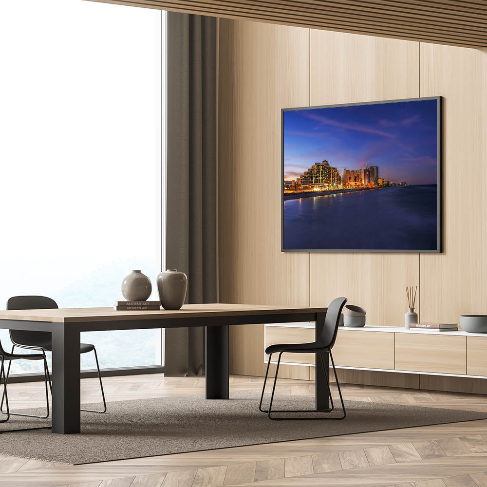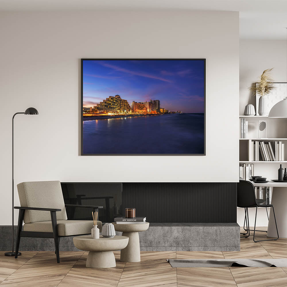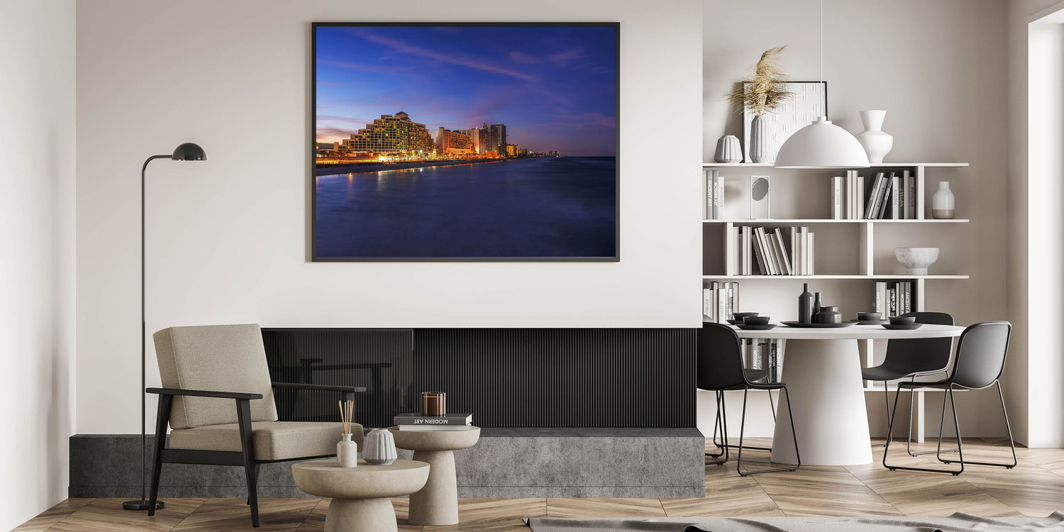 Bring the vibrant energy of Daytona Beach at dusk into your home with this captivating cityscape wall art. The glowing lights of the beachfront hotels reflect beautifully on the calm ocean waters, creating a dynamic yet serene scene. The rich blues of the evening sky contrasted with the warm city lights make this a striking addition to any room.