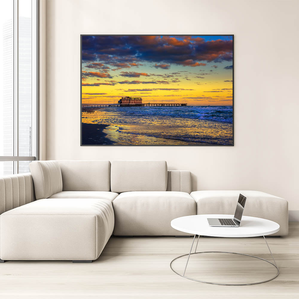 Whether you are looking to add a touch of coastal charm to your home or simply want a vibrant sunset scene to brighten your walls, this Daytona Beach pier at sunset is the perfect addition.