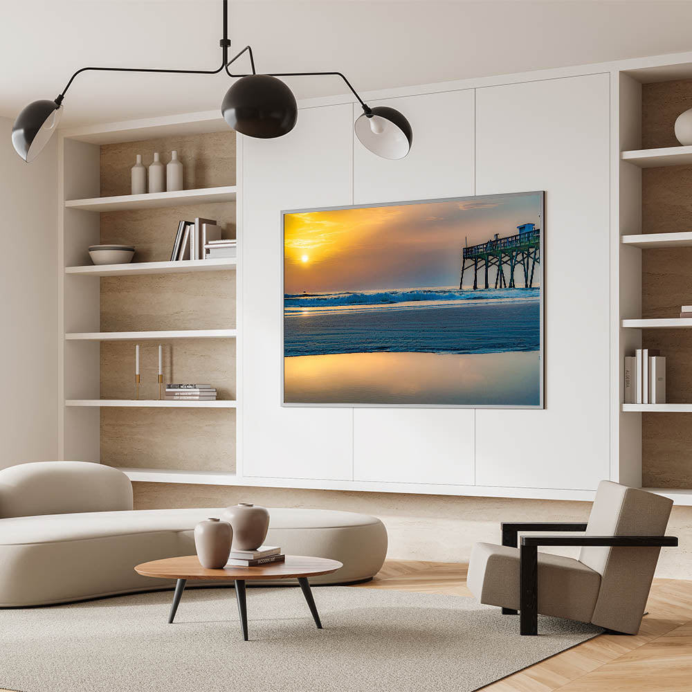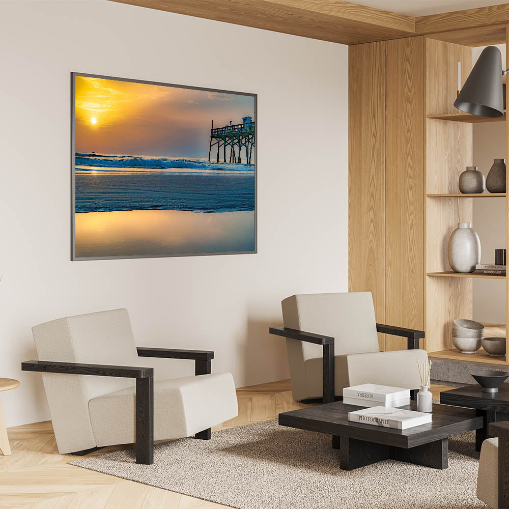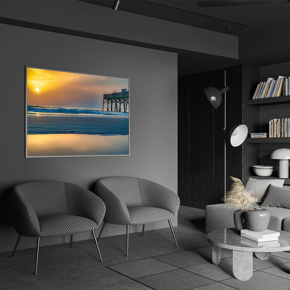 Capture the breathtaking beauty of a Daytona Beach sunset with this stunning wall art. The golden hues of the sun reflecting off the ocean waves, paired with the peaceful pier silhouette, create a mesmerizing coastal scene. This piece of Daytona Beach wall decor offers a vibrant yet calming atmosphere, making it the perfect addition to your home or office.