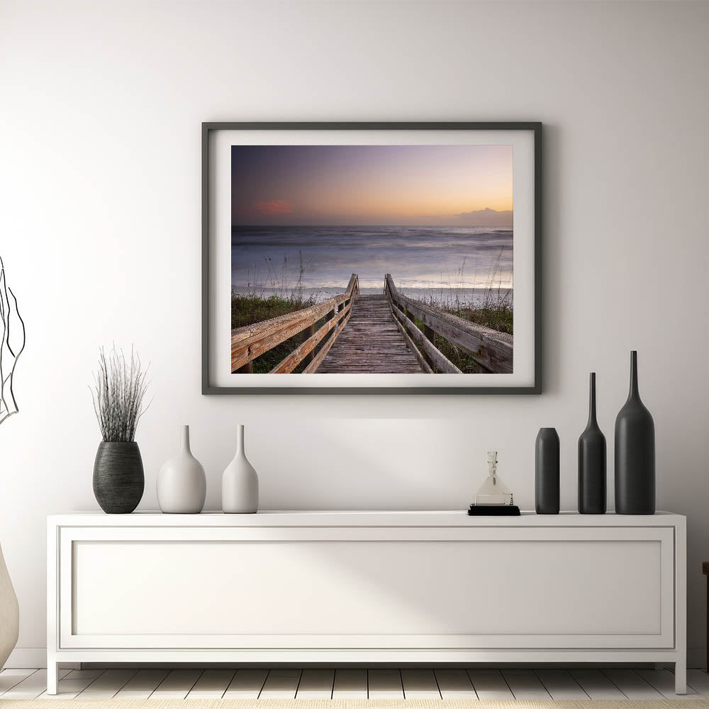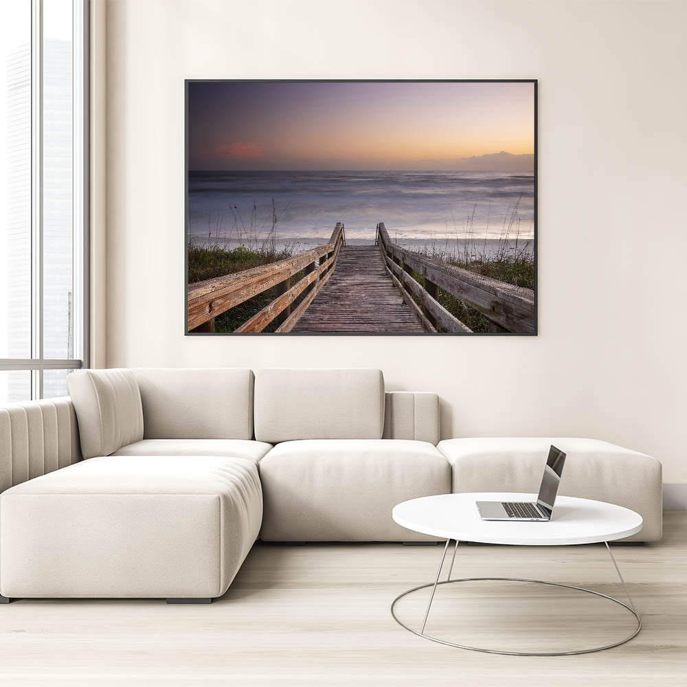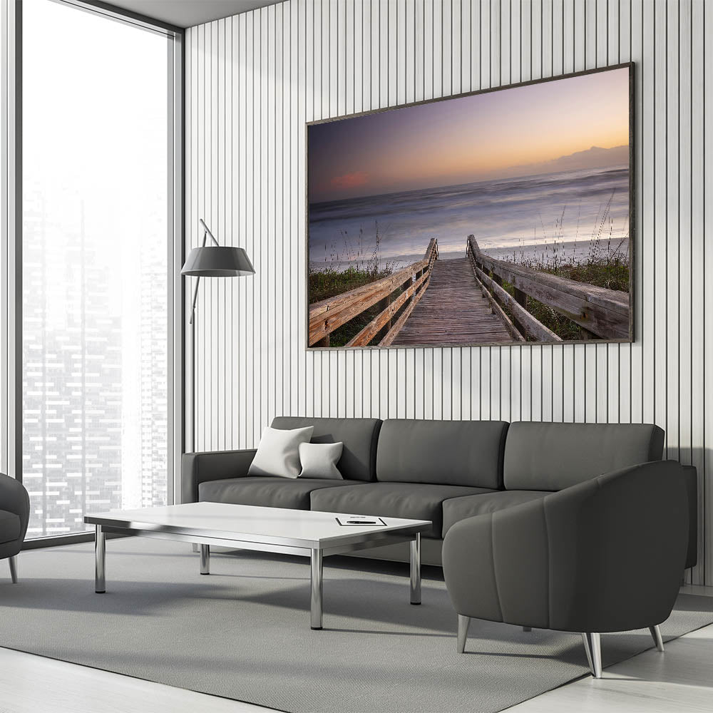 Invite the peaceful beauty of Daytona Beach into your home with this stunning wall art, showcasing a wooden boardwalk leading to the tranquil ocean. This serene scene, featuring soft hues of a fading sunset, captures the perfect moment of calm as the waves gently meet the shore. The simplicity and natural beauty of the wooden walkway framed by the ocean horizon create a timeless piece that will bring a sense of relaxation and harmony to any room. Perfect for lovers of coastal landscapes, this artwork embodies the essence of a quiet escape to the beach.